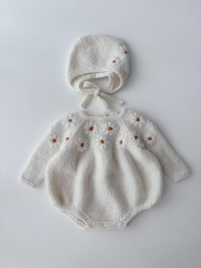 Alpaca Baby Romper and Bonnet Set – Floral Embroidery, Photo Prop