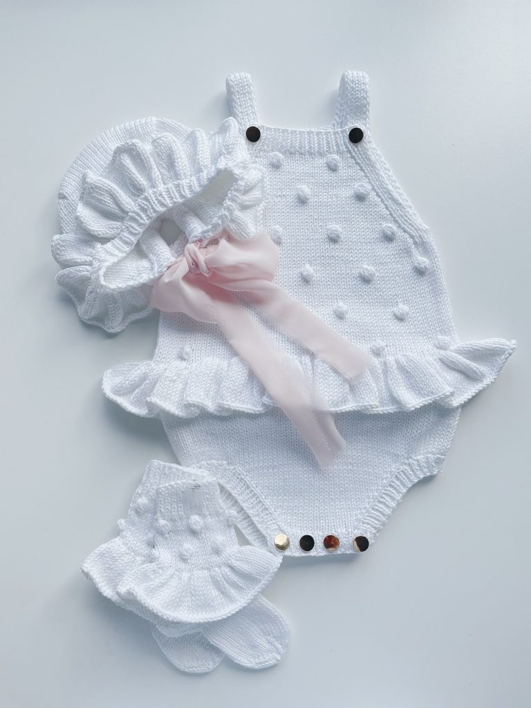 Cotton Baby Romper Set – White Popcorn Knit, Bonnet & Socks