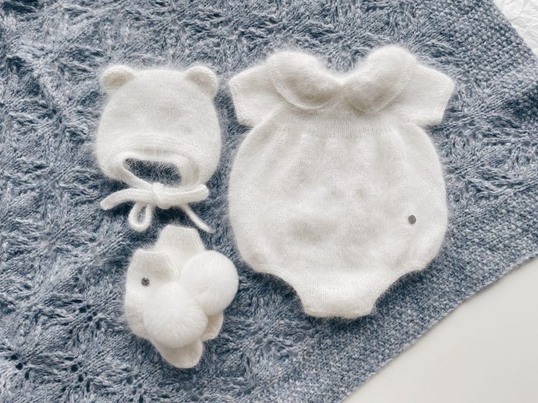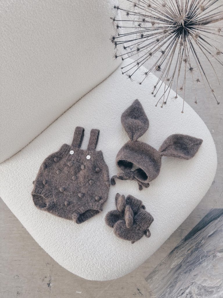Baby unisex knitted bear bonnet polo romper and socks – Set of 3 – Photography props