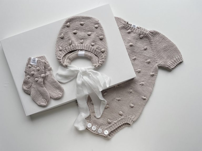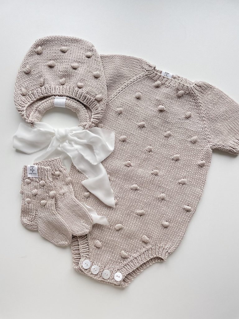 Cotton Baby Romper Set – Popcorn Knit Outfit with Bonnet & Booties