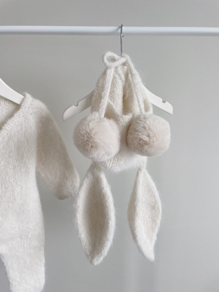 Cream alpaca romper bunny bonnet and bunny booties – Set of 3 – Photography props