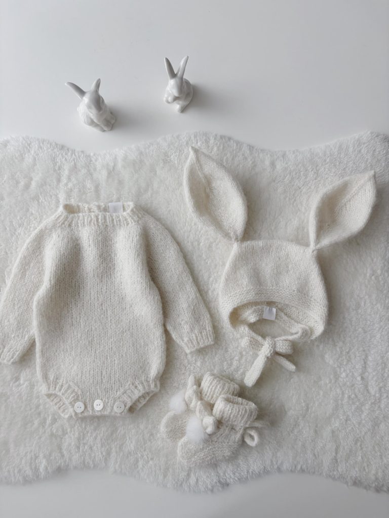 Cream Alpaca Knit Baby Romper Set – Newborn Bonnet and Socks