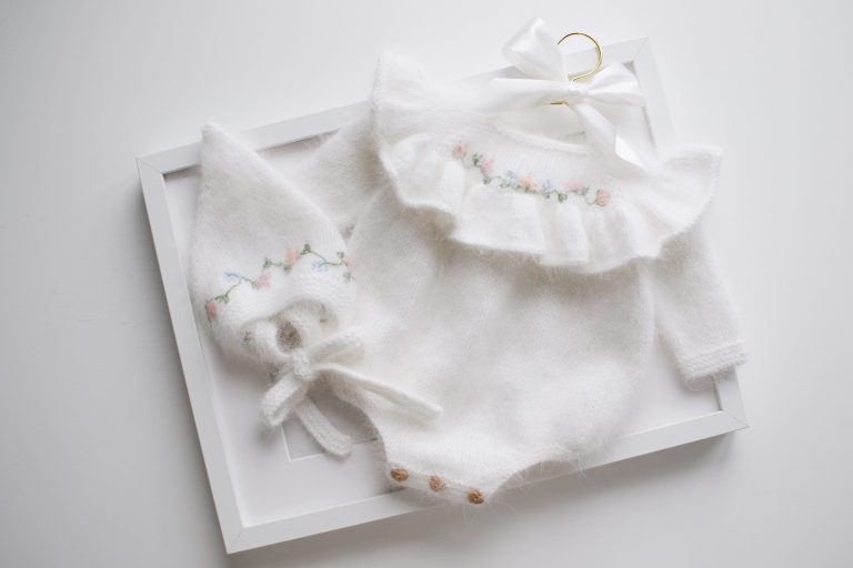 Embroidered Angora Ruffle Romper and Bonnet – Baby Photo Props
