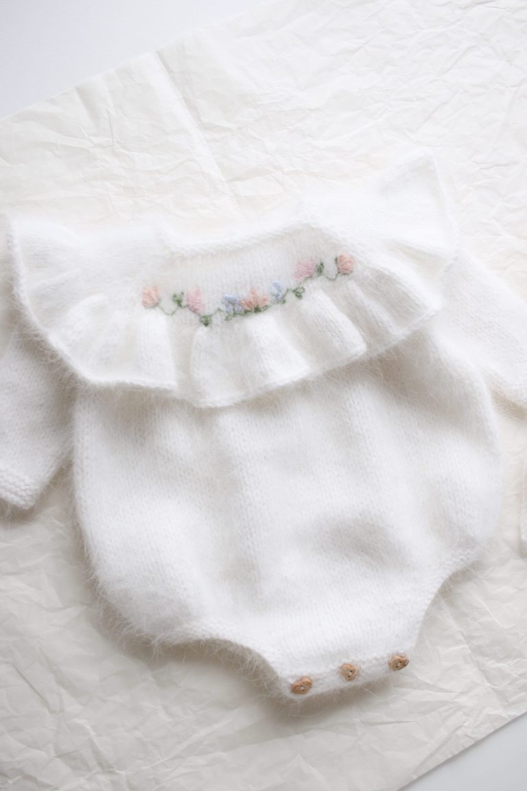 Embroidered Angora Baby Romper & Bonnet Set – Milky White Outfit