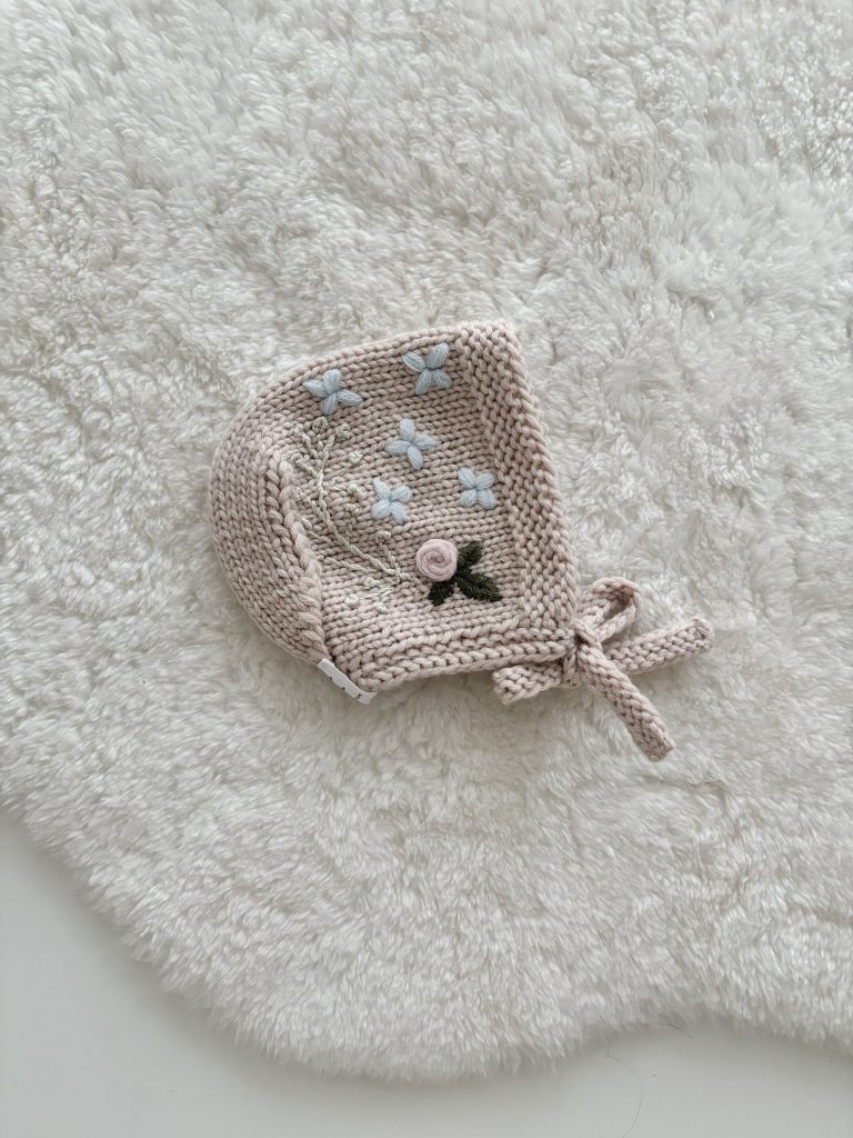 Embroidered Baby Bonnet and Booties Set – Beige Alpaca Knit
