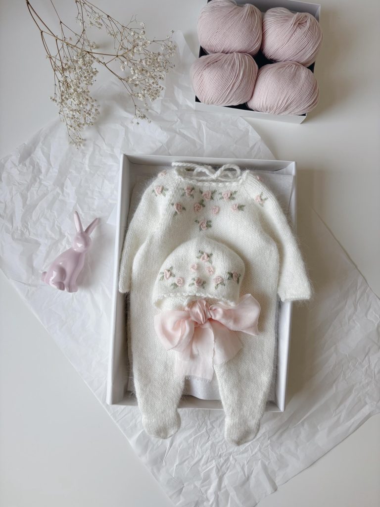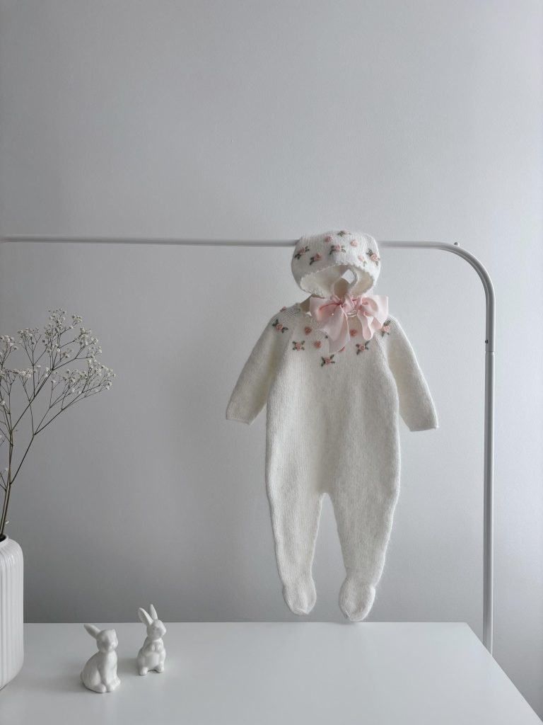 Embroidered Baby Alpaca Romper and Bonnet Set – Cream Knit Outfit