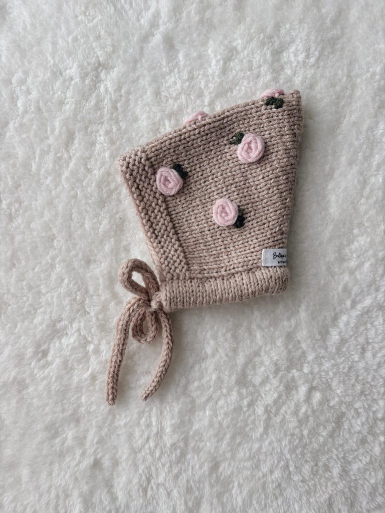 Embroidered Rose Merino Wool Baby Romper and Bonnet Set