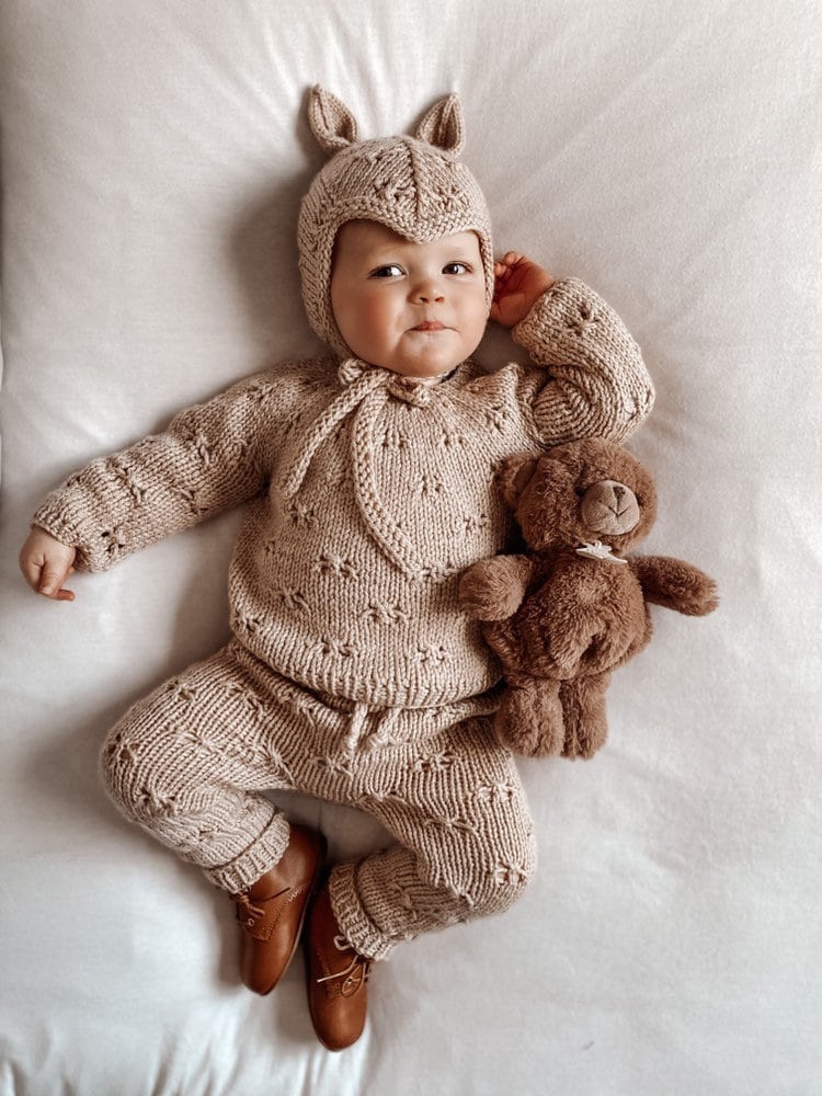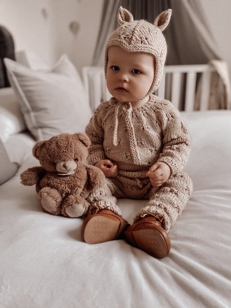 Merino Baby Knit Set – Beige Sweater, Pants & Elf Bonnet