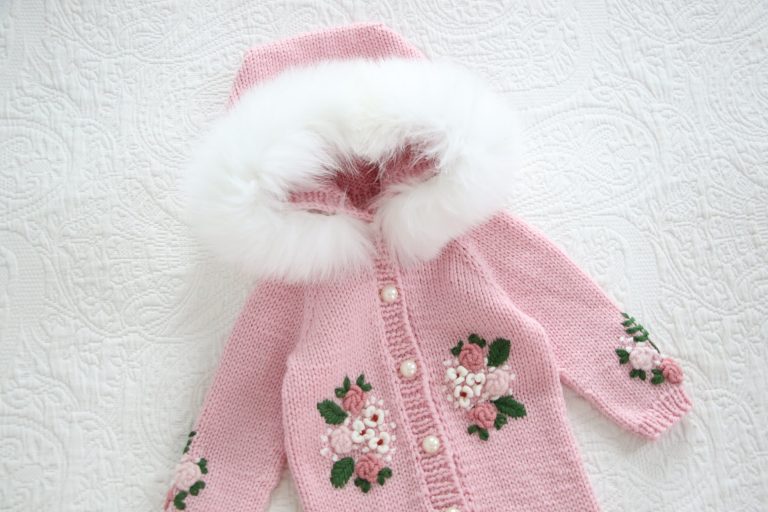 Merino Baby Romper – Pink Knit Footie, Genuine Fur Trim Hood
