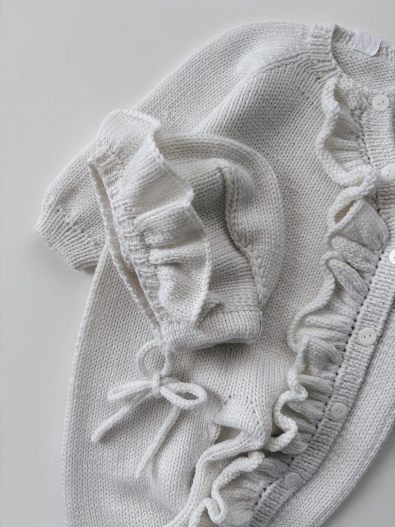 Merino Baby Romper and Bonnet Set – Cream Knit with Ruffles