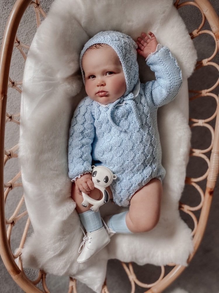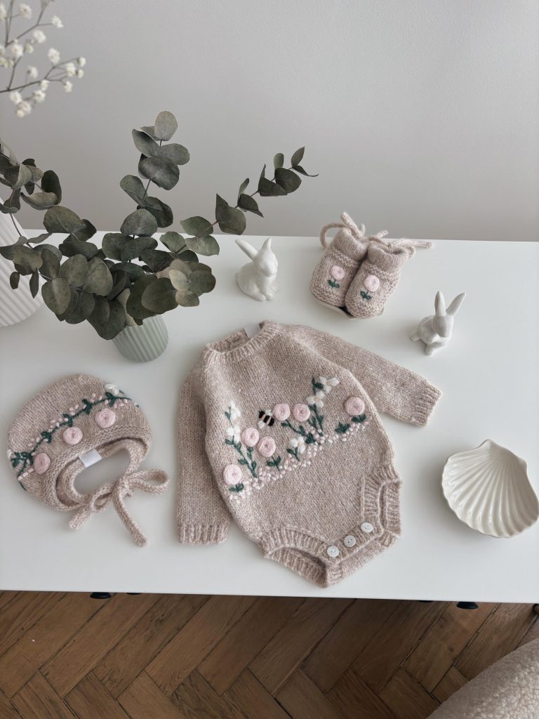 Newborn Girl Alpaca Romper Set – Beige Floral Bonnet & Booties