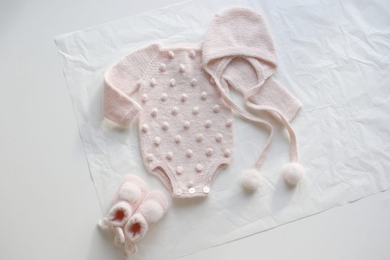 Merino Wool Baby Romper Set – Pink Popcorn Knit Outfit