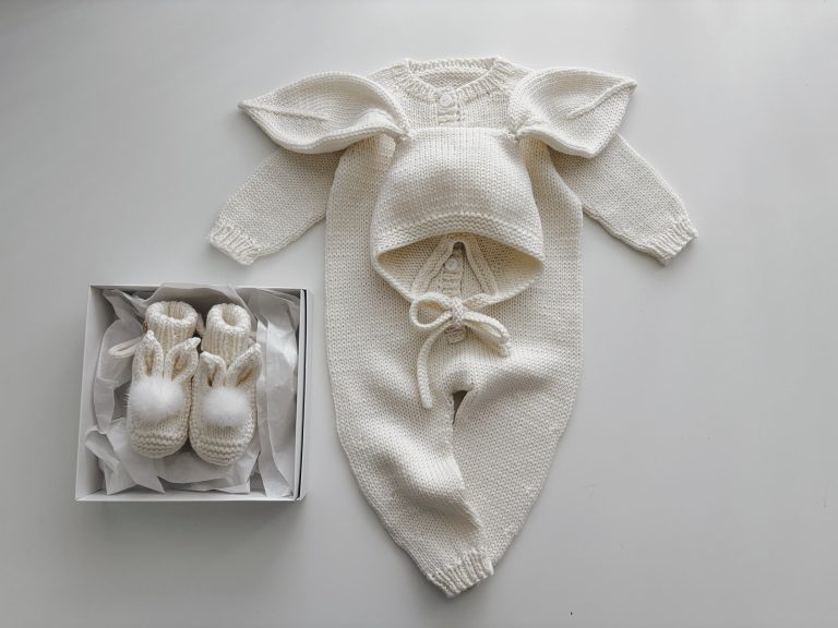 Merino Wool Knit Baby Romper and Bonnet Set – Beige Photo Prop