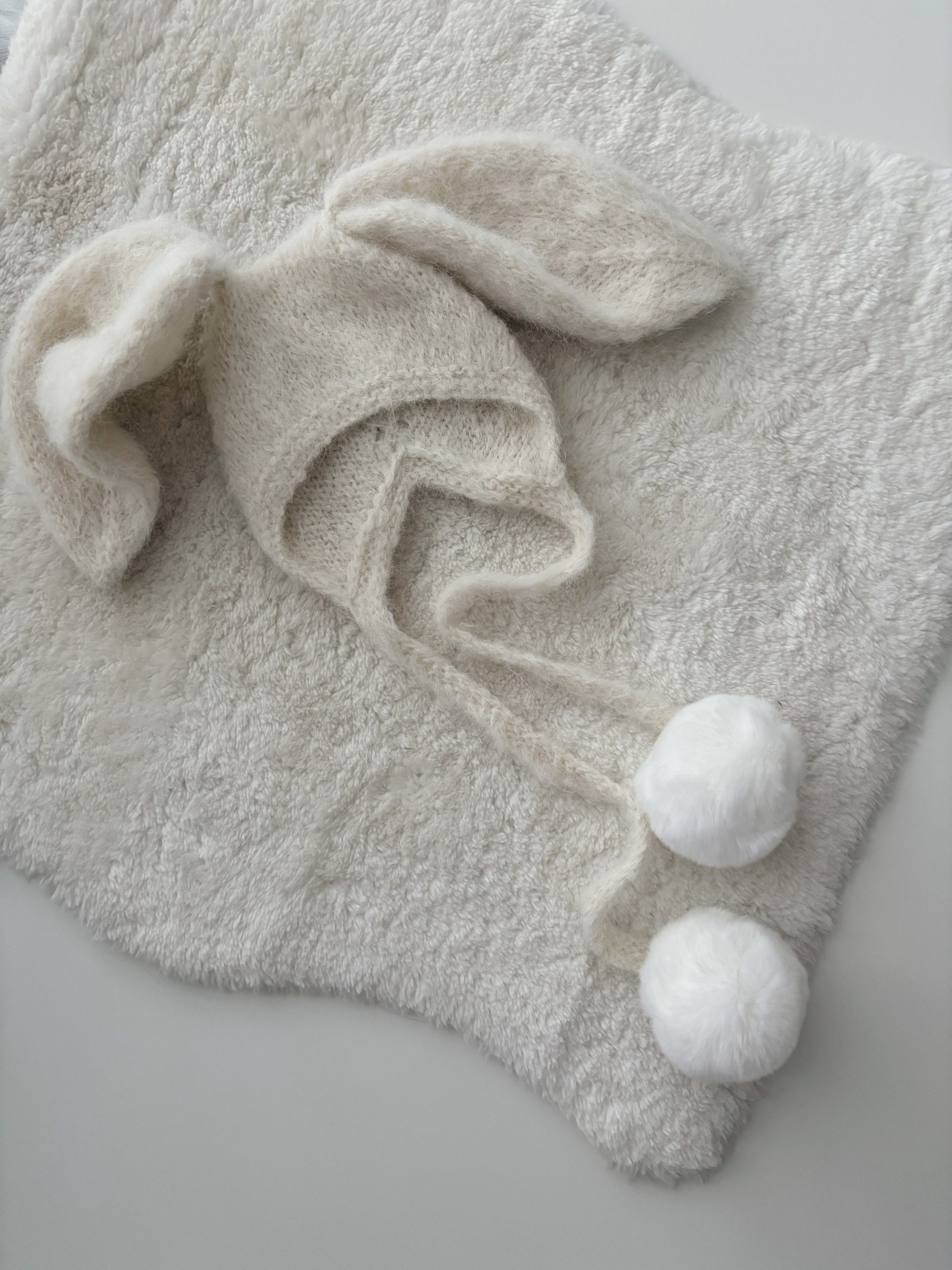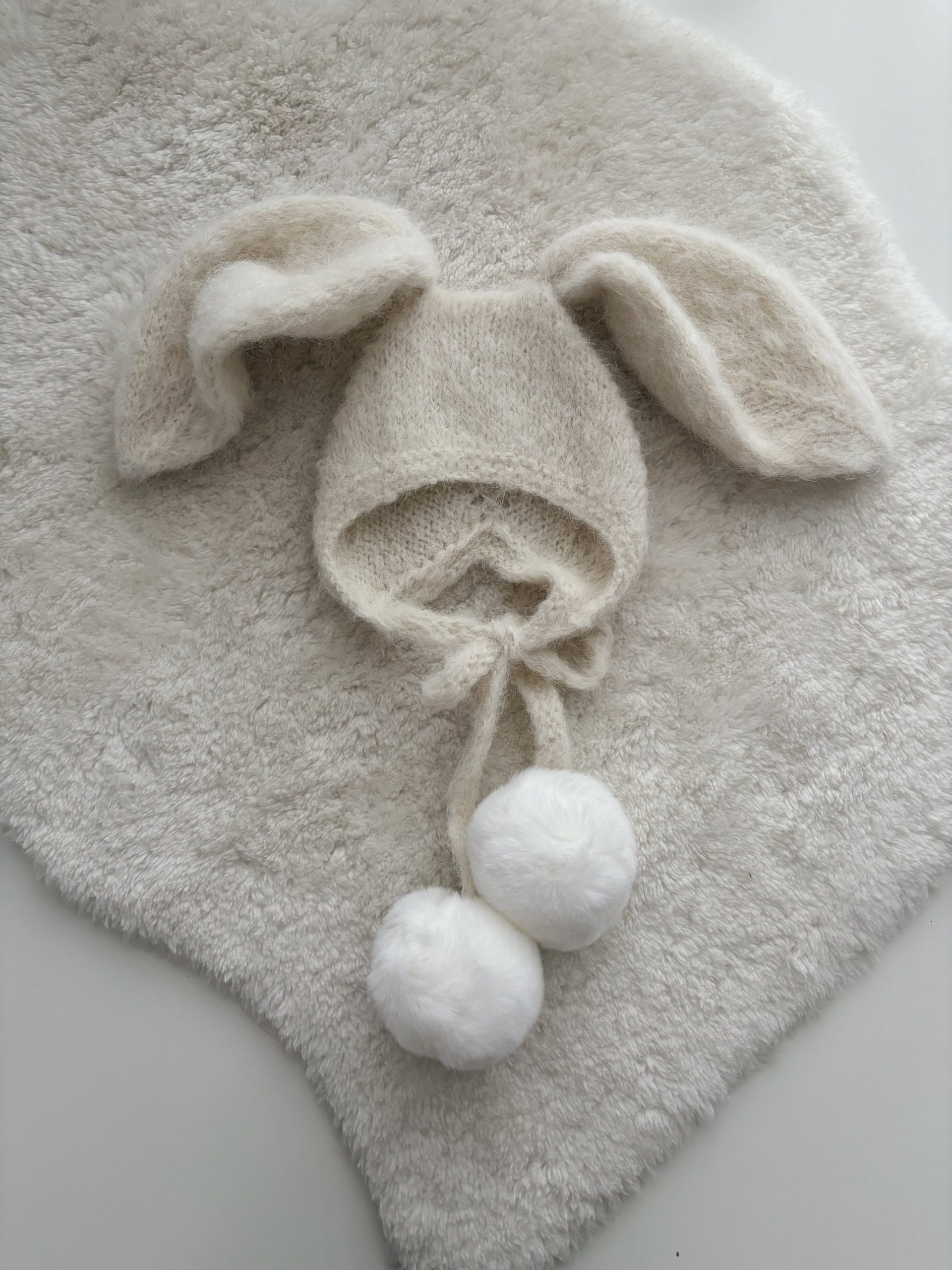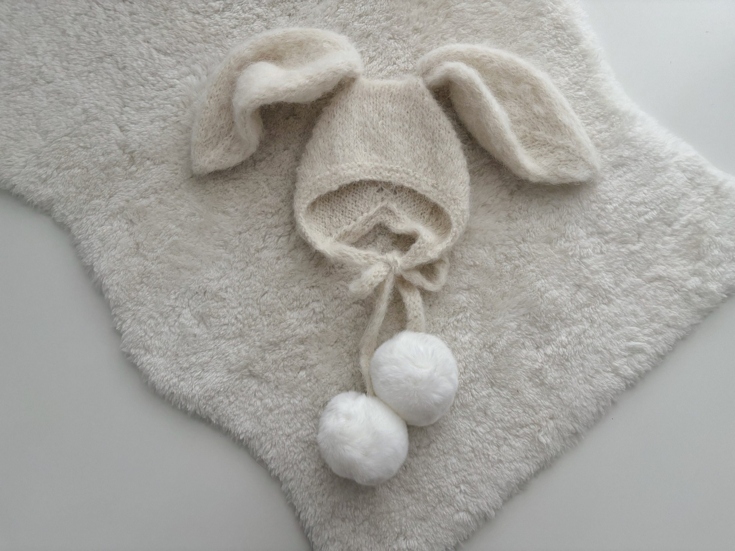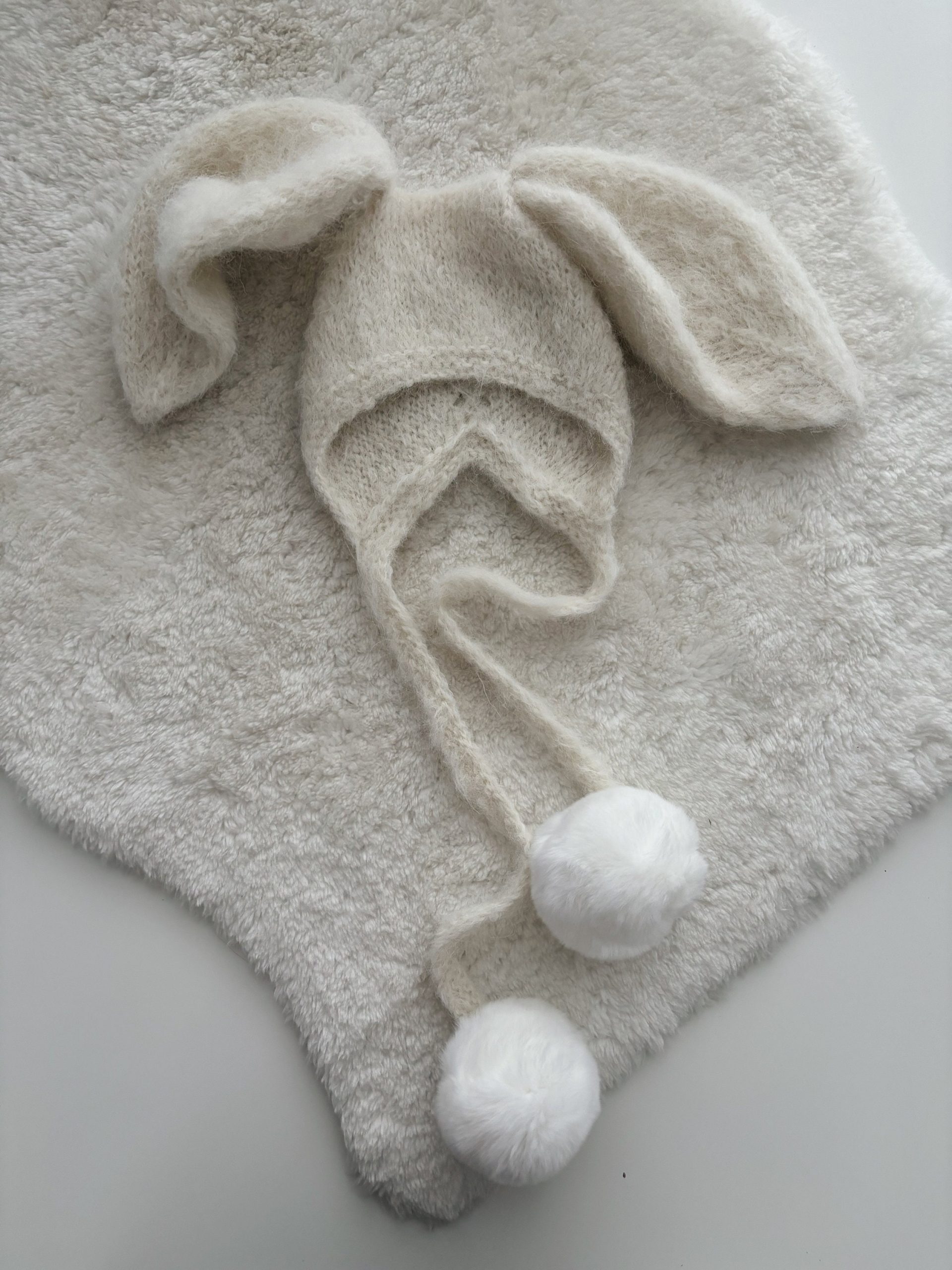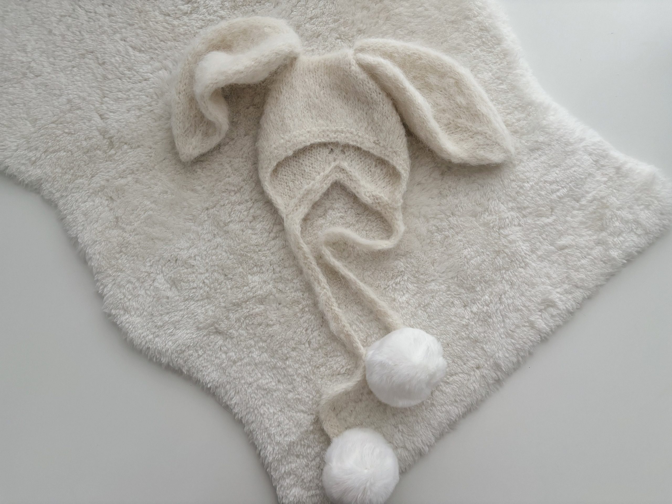 Alpaca Baby Bunny Bonnet – Rabbit Fur Pom Poms, Photo Prop