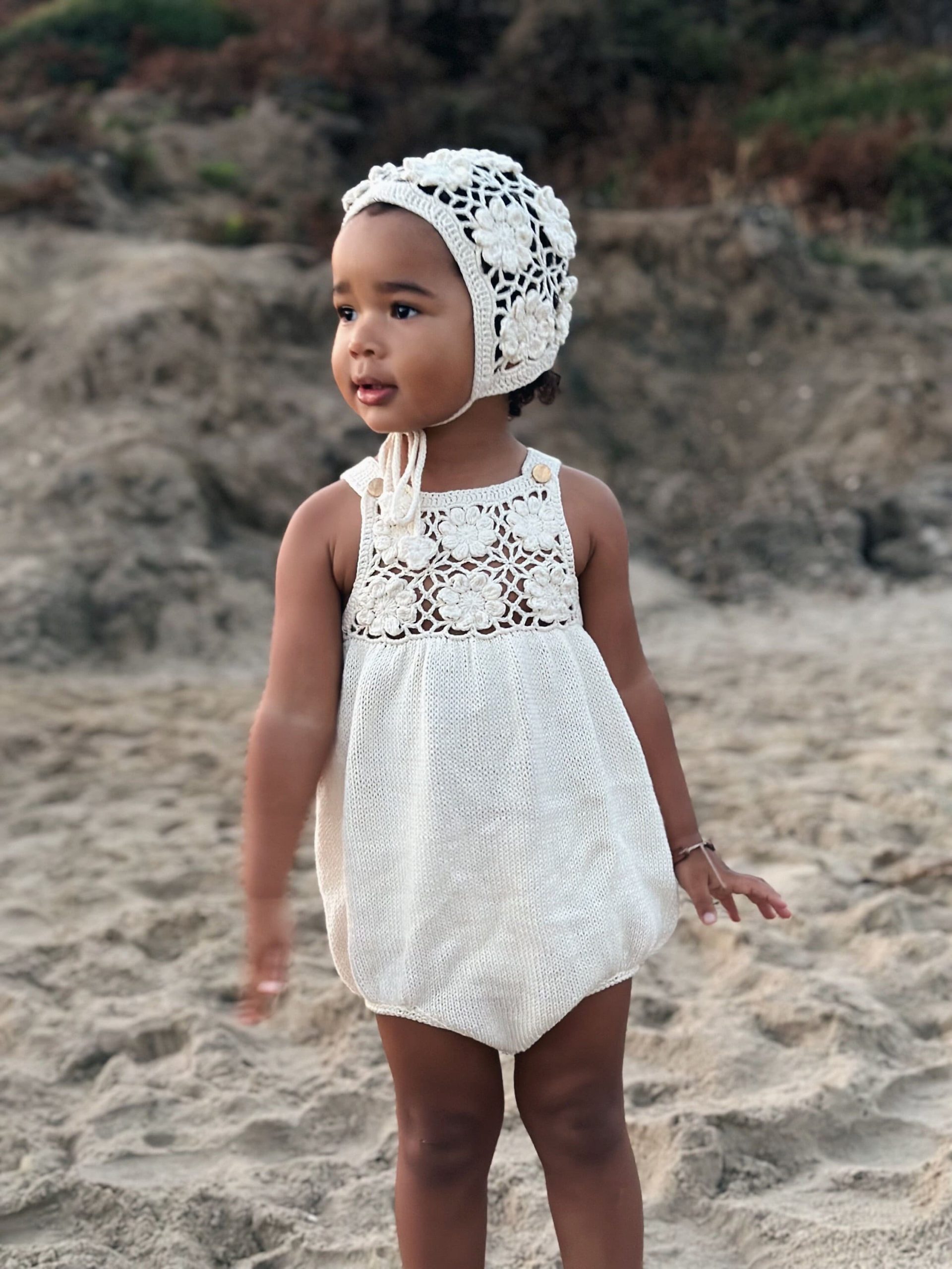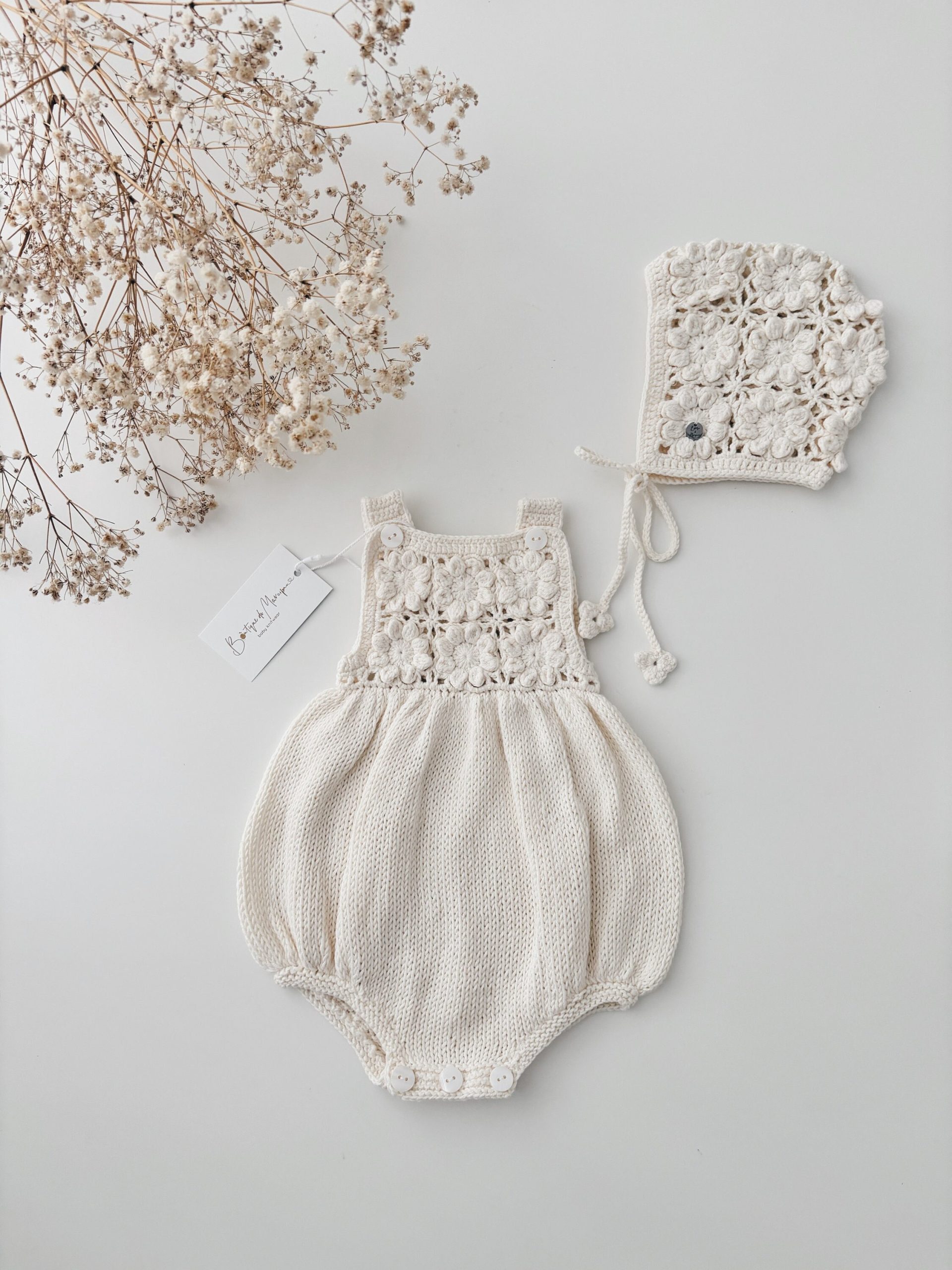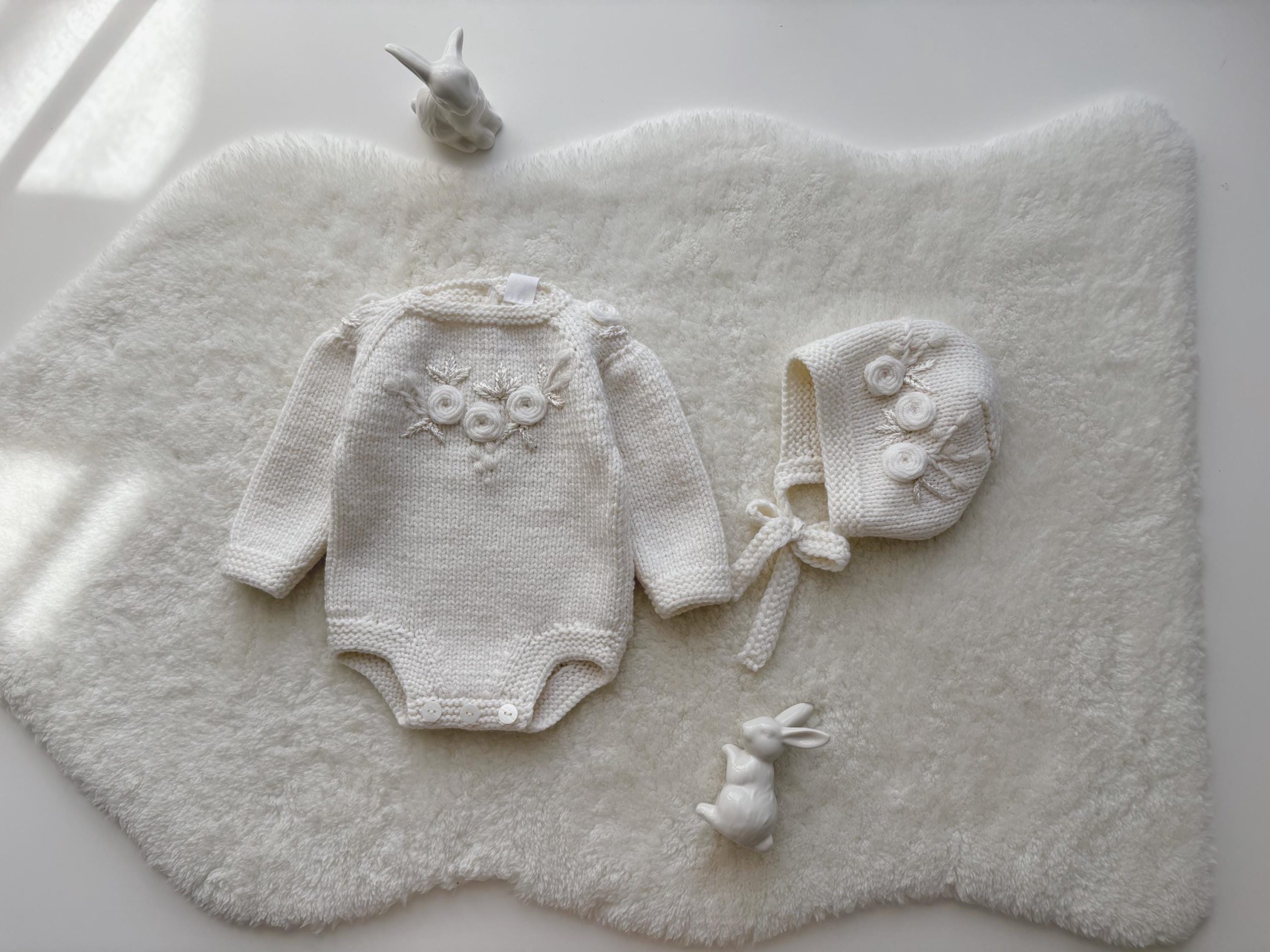 Embroidered Merino Baby Romper and Bonnet Set – Knitted Photo Prop