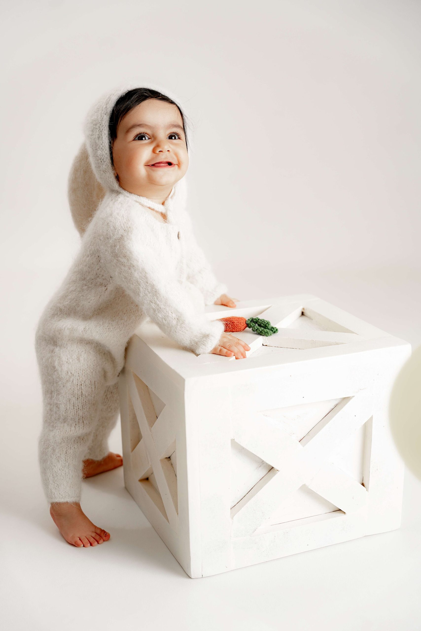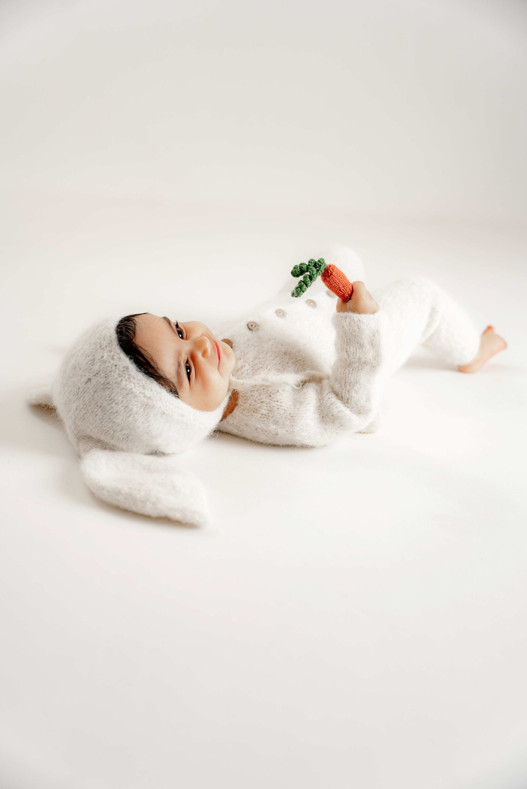 Cream alpaca romper bunny bonnet and bunny booties – Set of 3 – Photography props