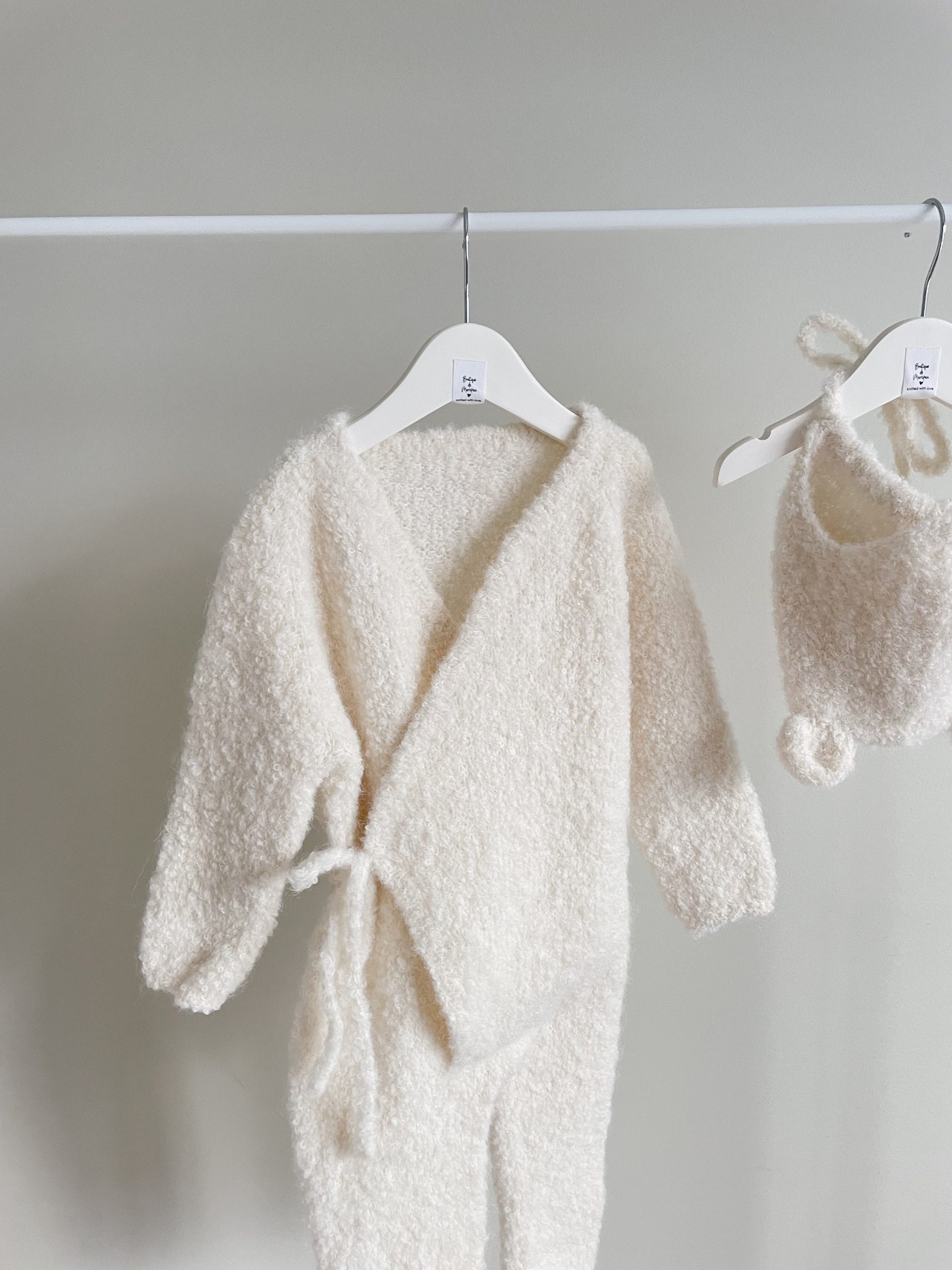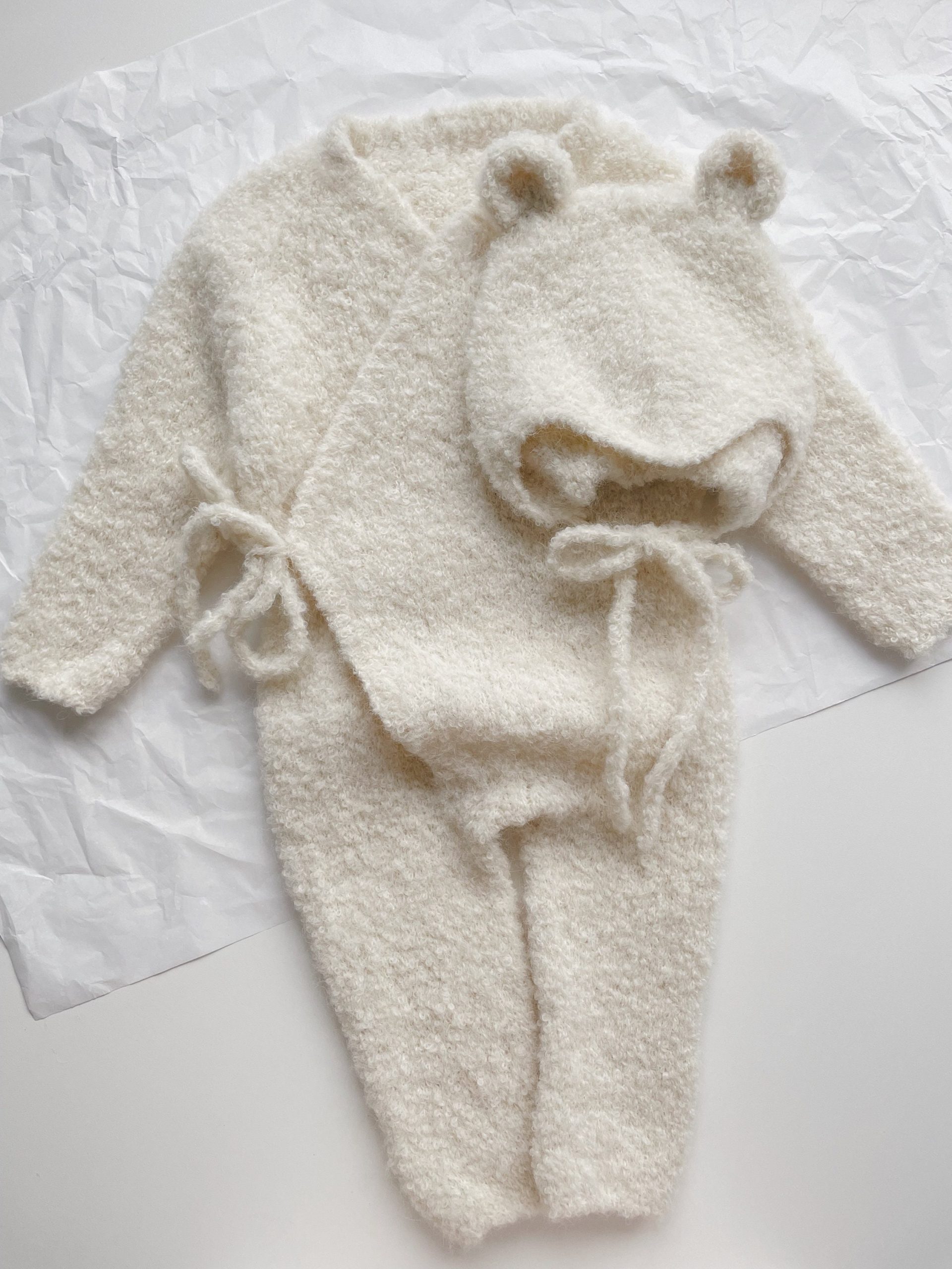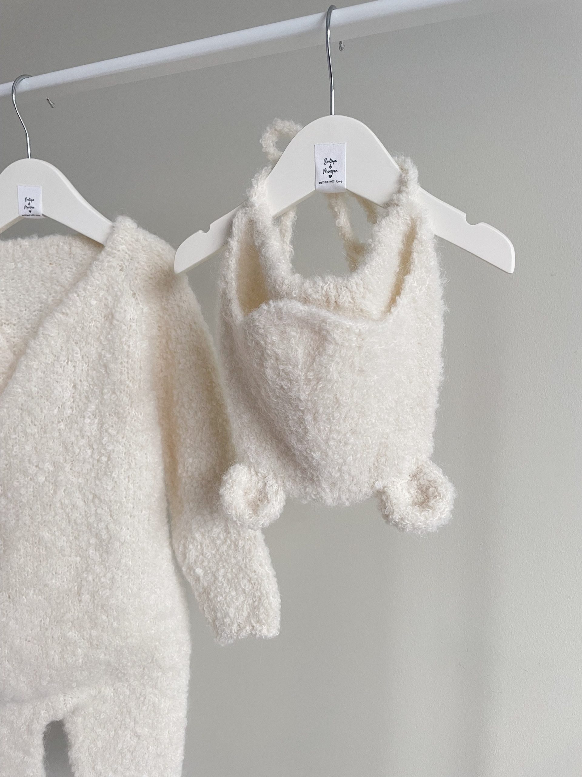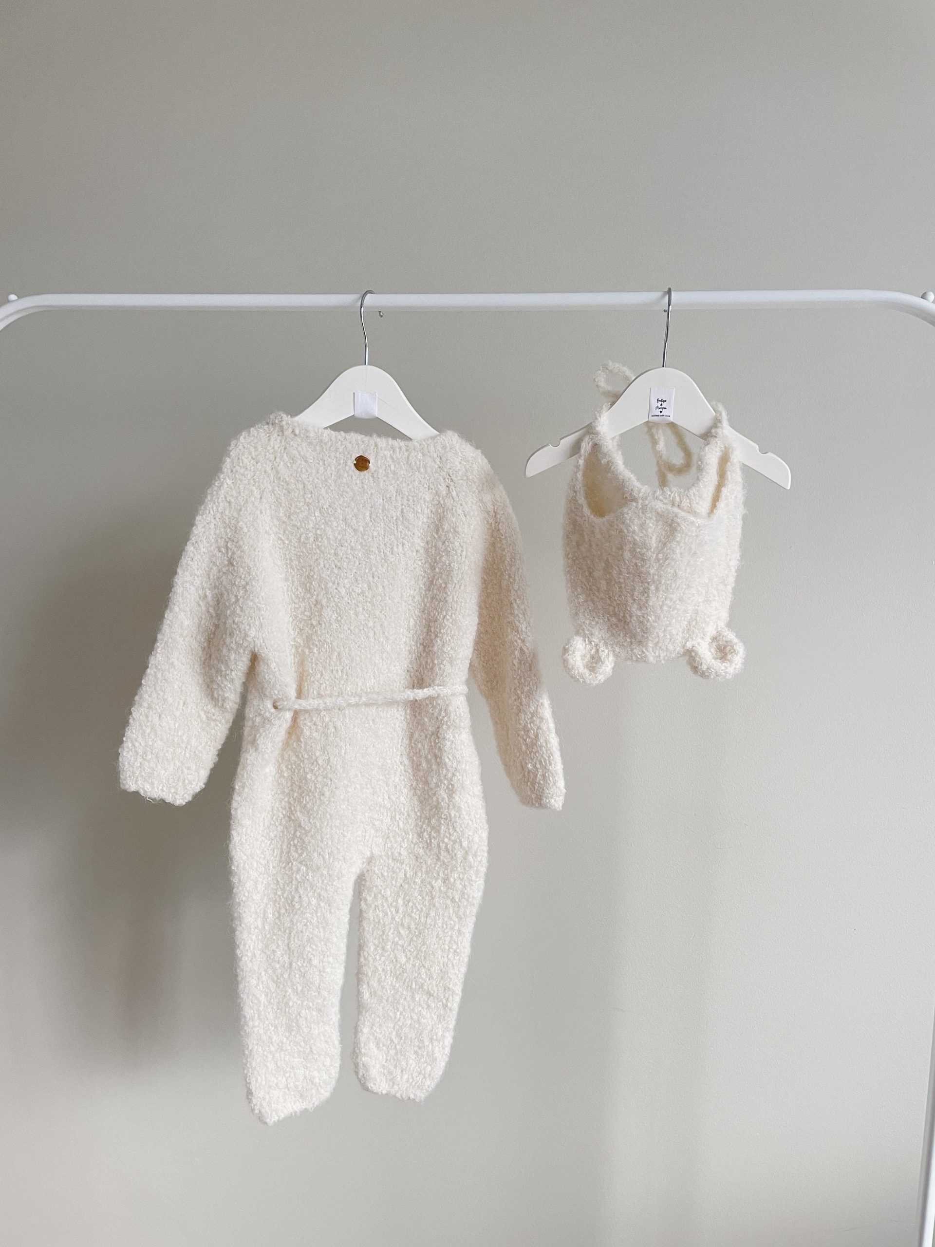 Alpaca Knit Baby Romper and Bonnet Set – Cream Outfit