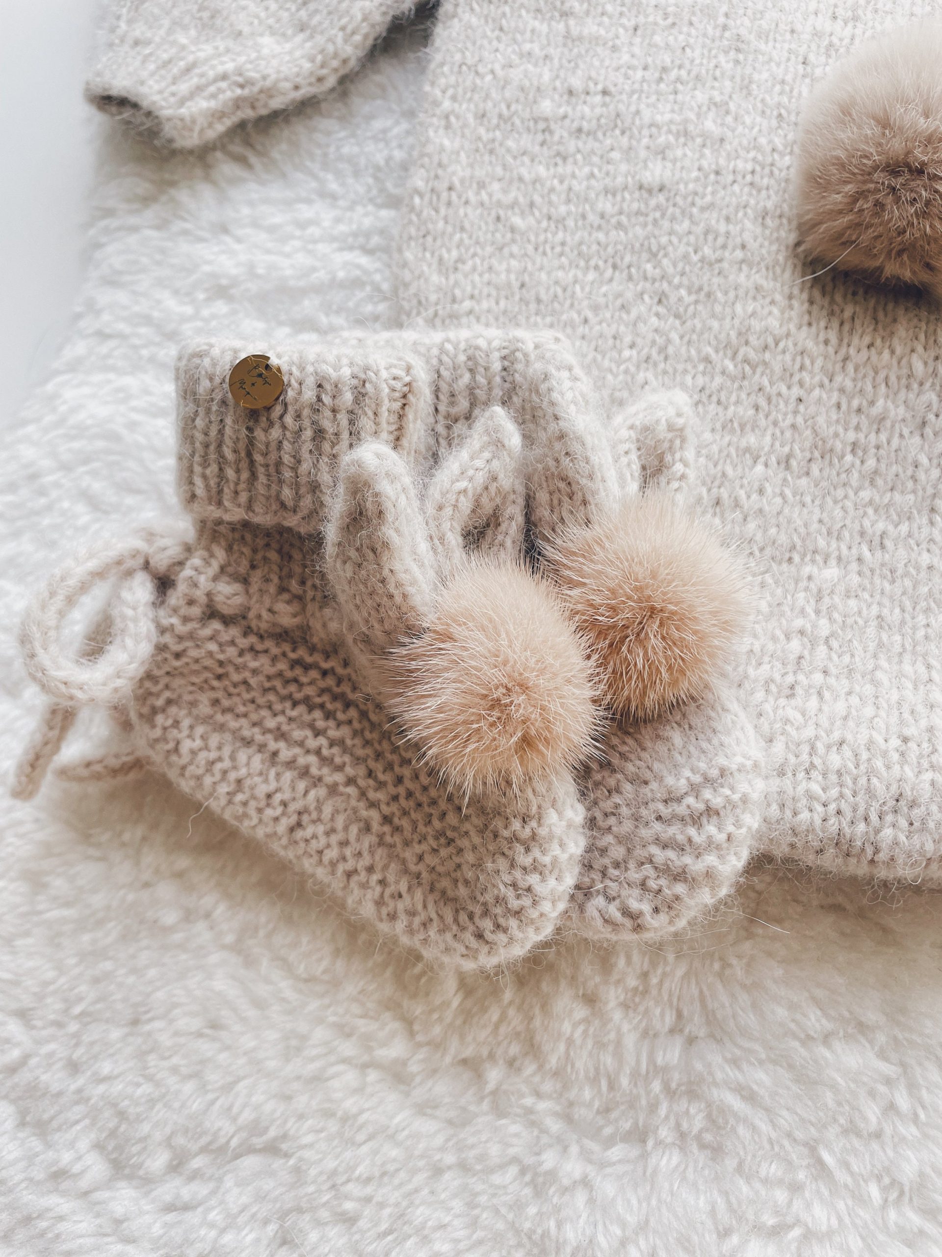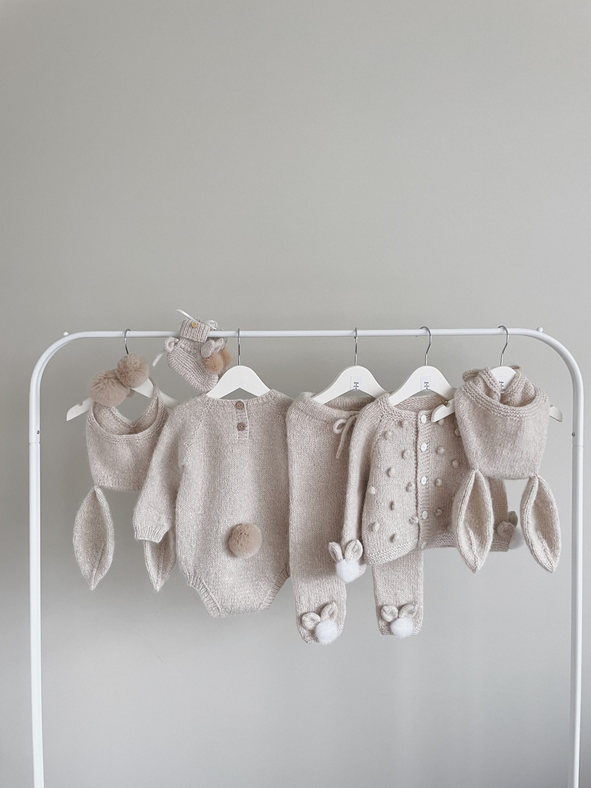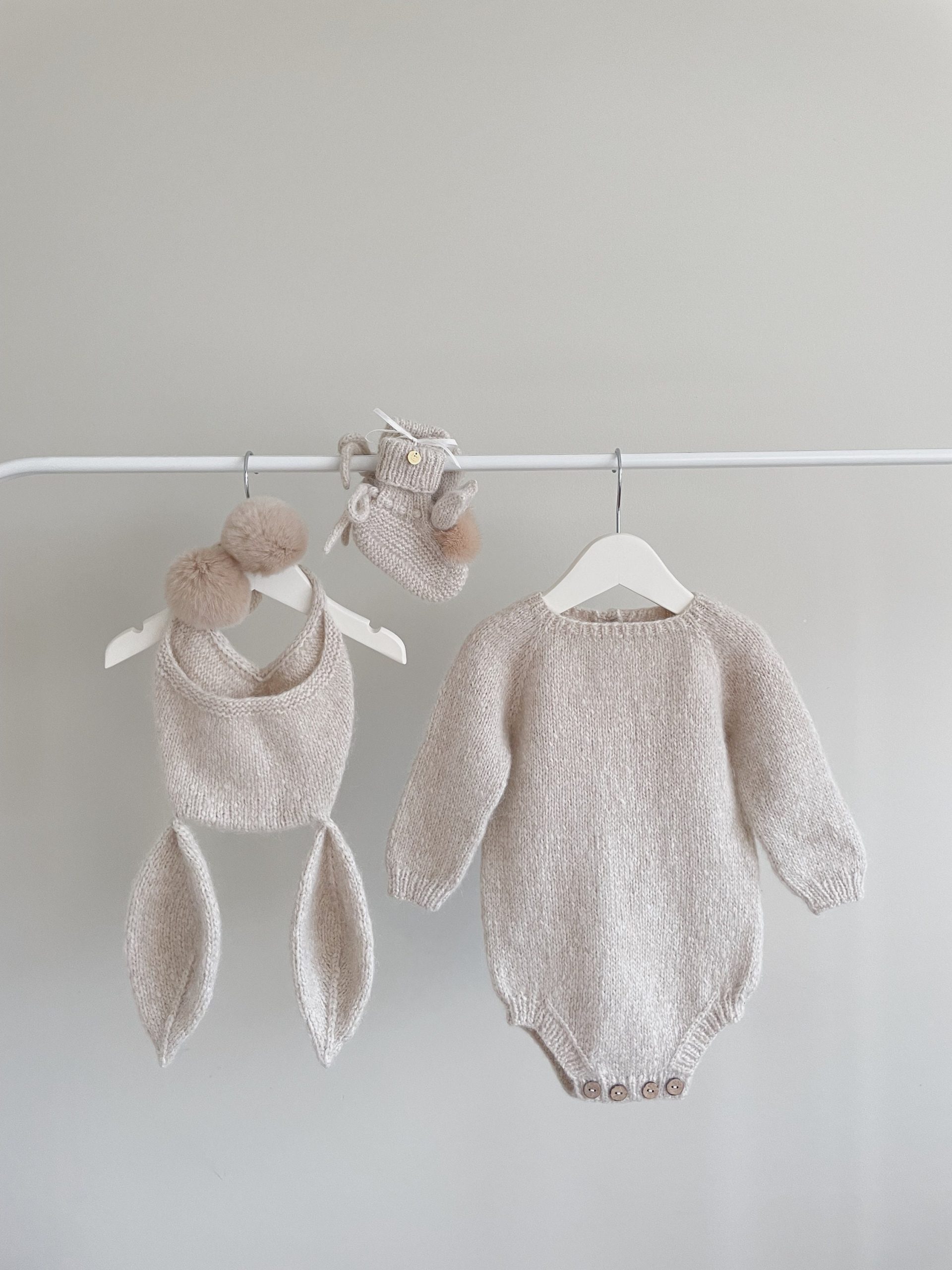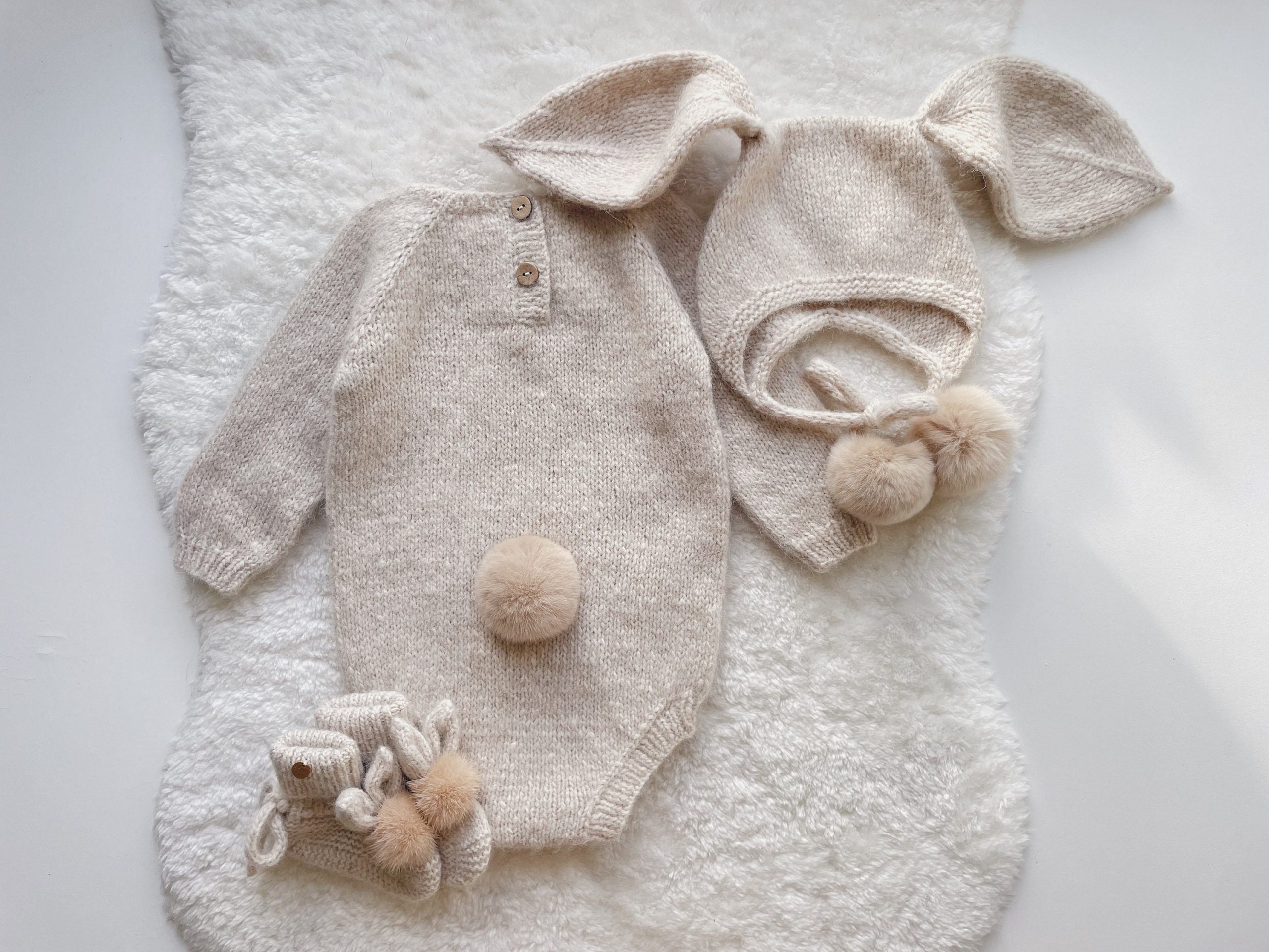 Alpaca Knit Bunny Outfit – Beige Romper, Bonnet & Booties