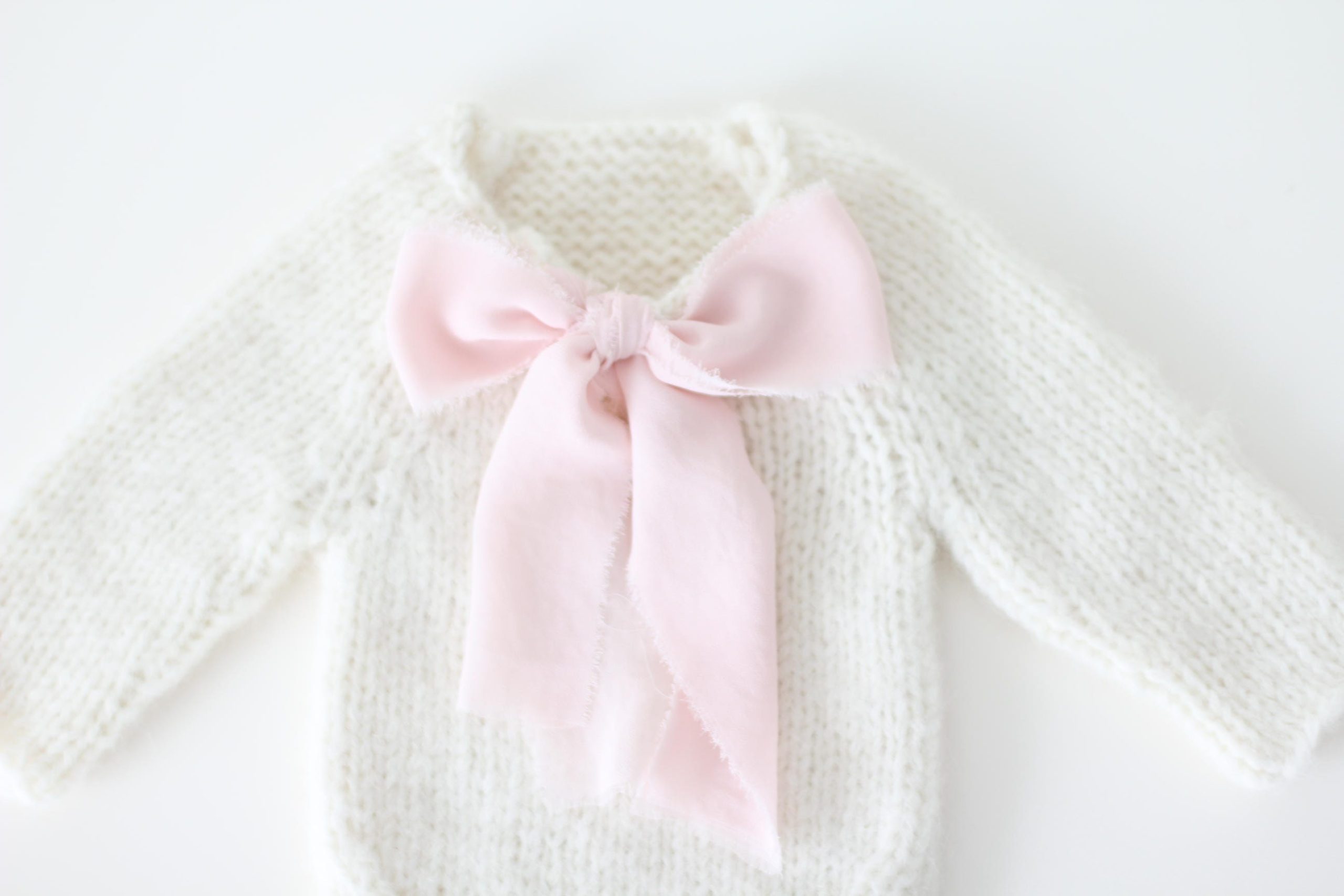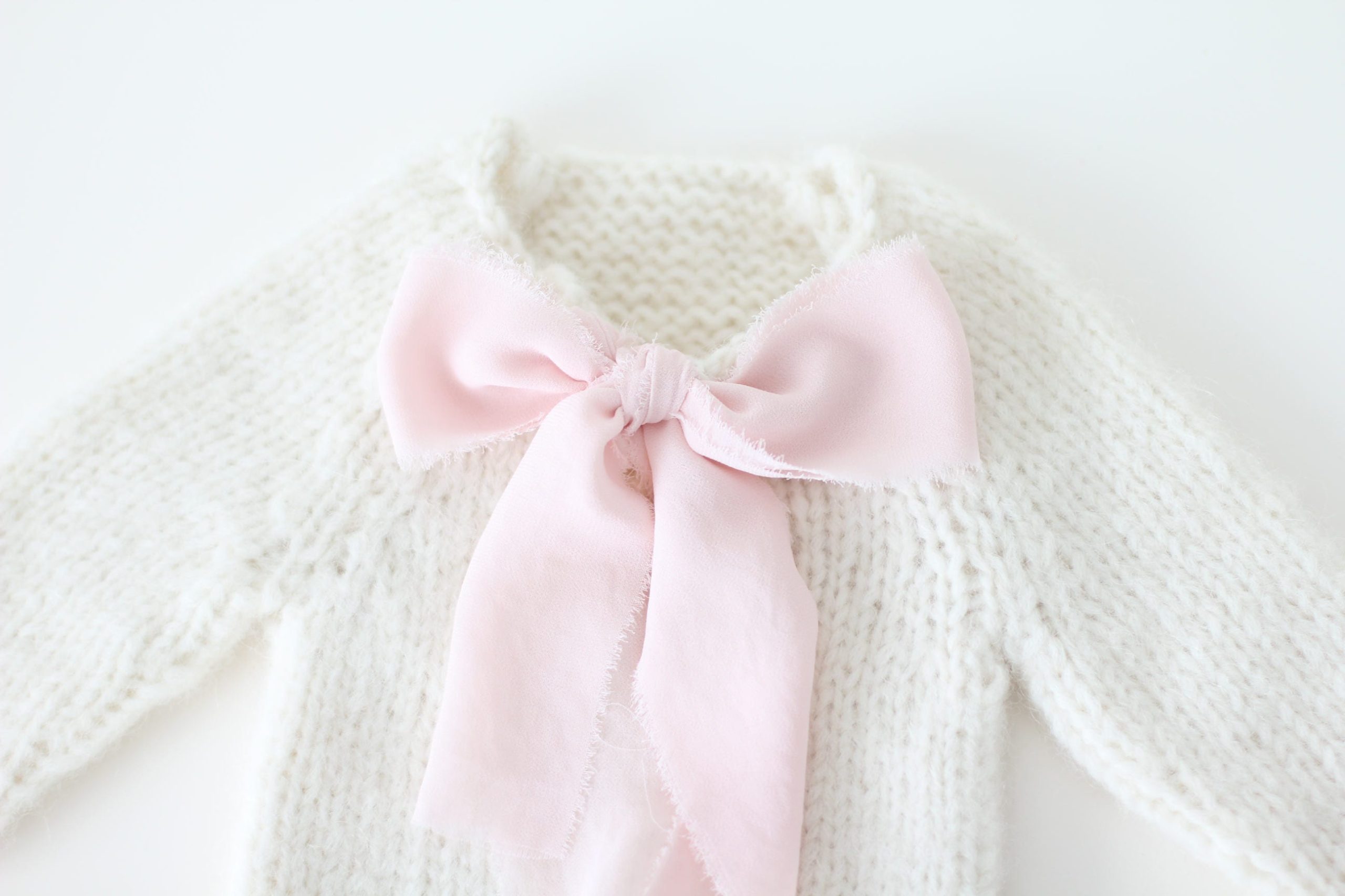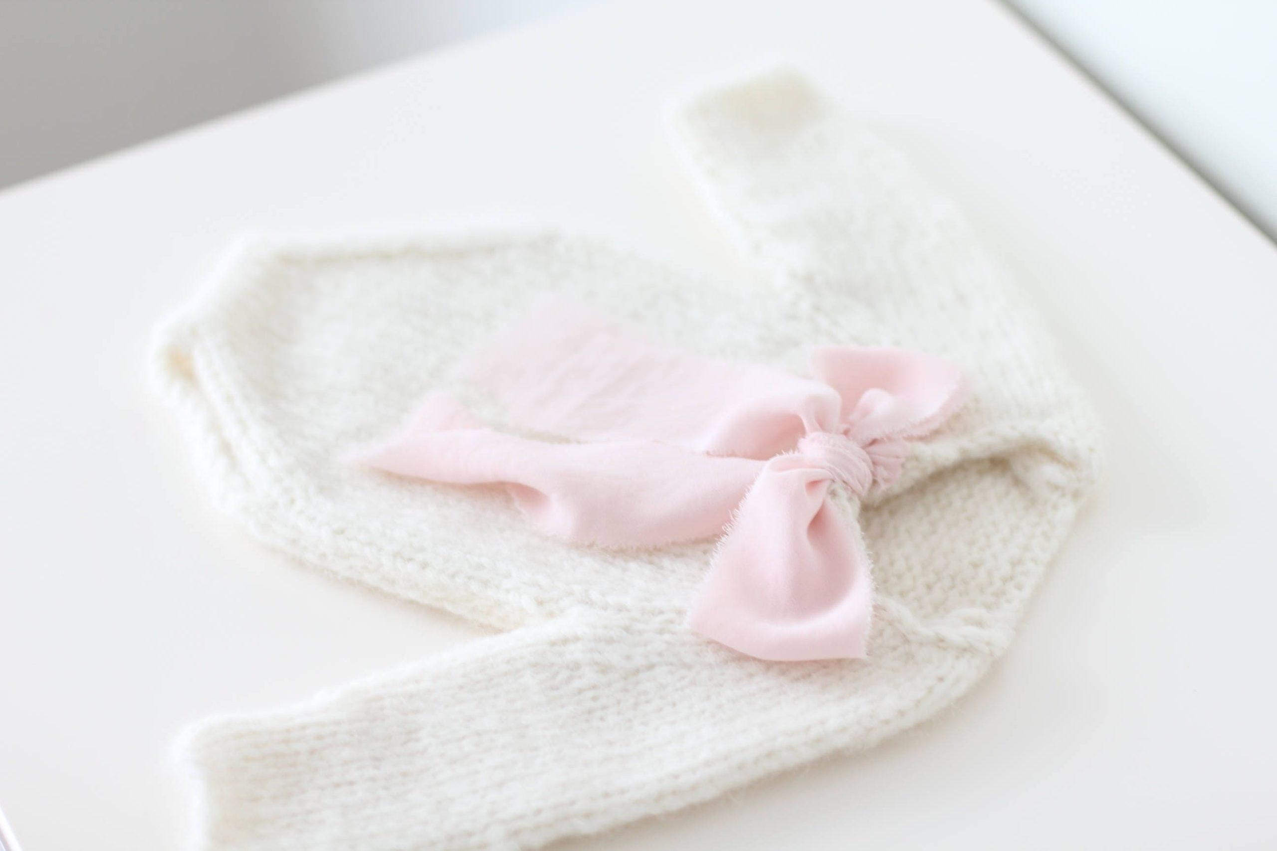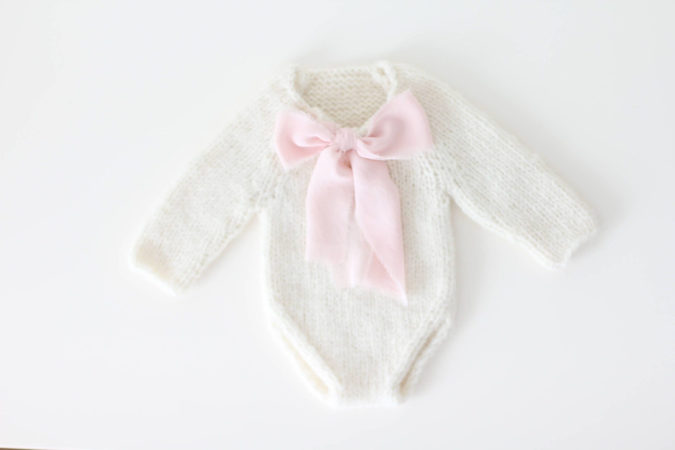 Alpaca Knit Newborn Romper – Cream Photo Prop with Pink Ribbon