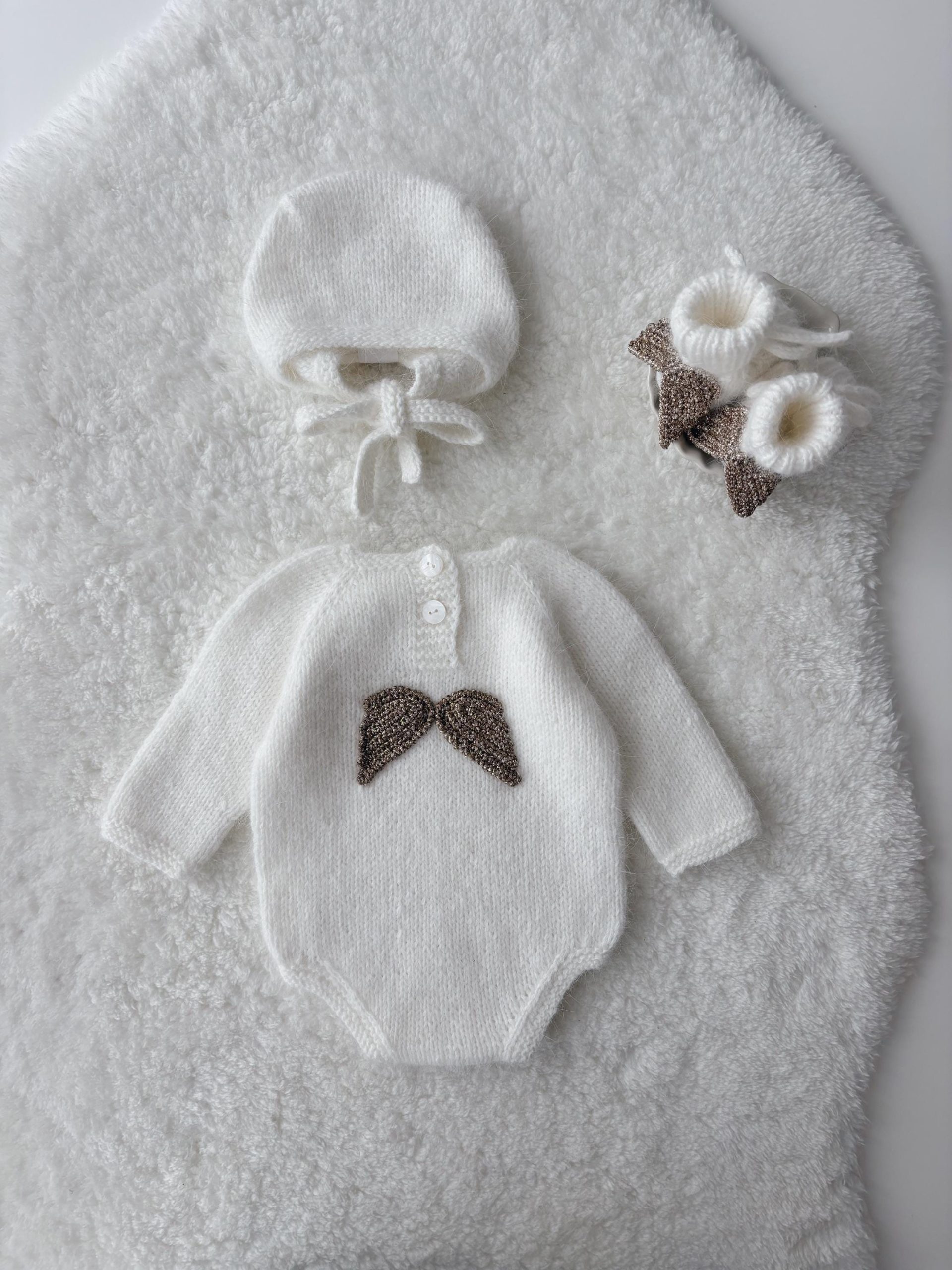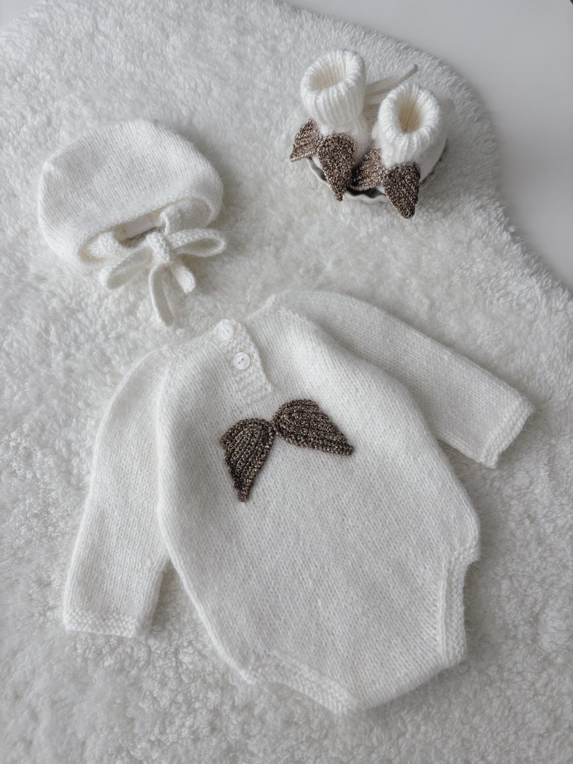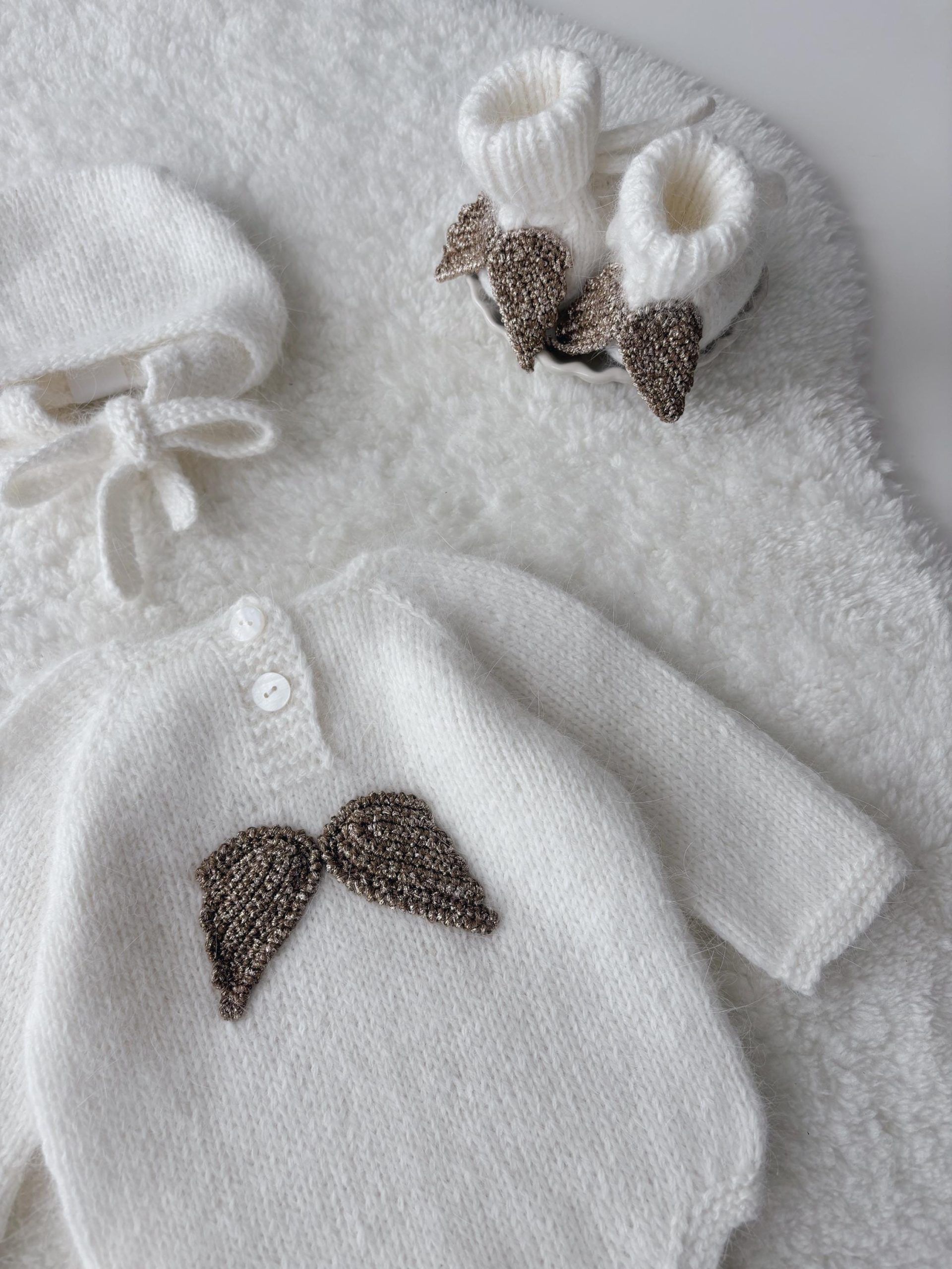 Merino Wool Baby Angel Outfit – Romper, Bonnet & Booties