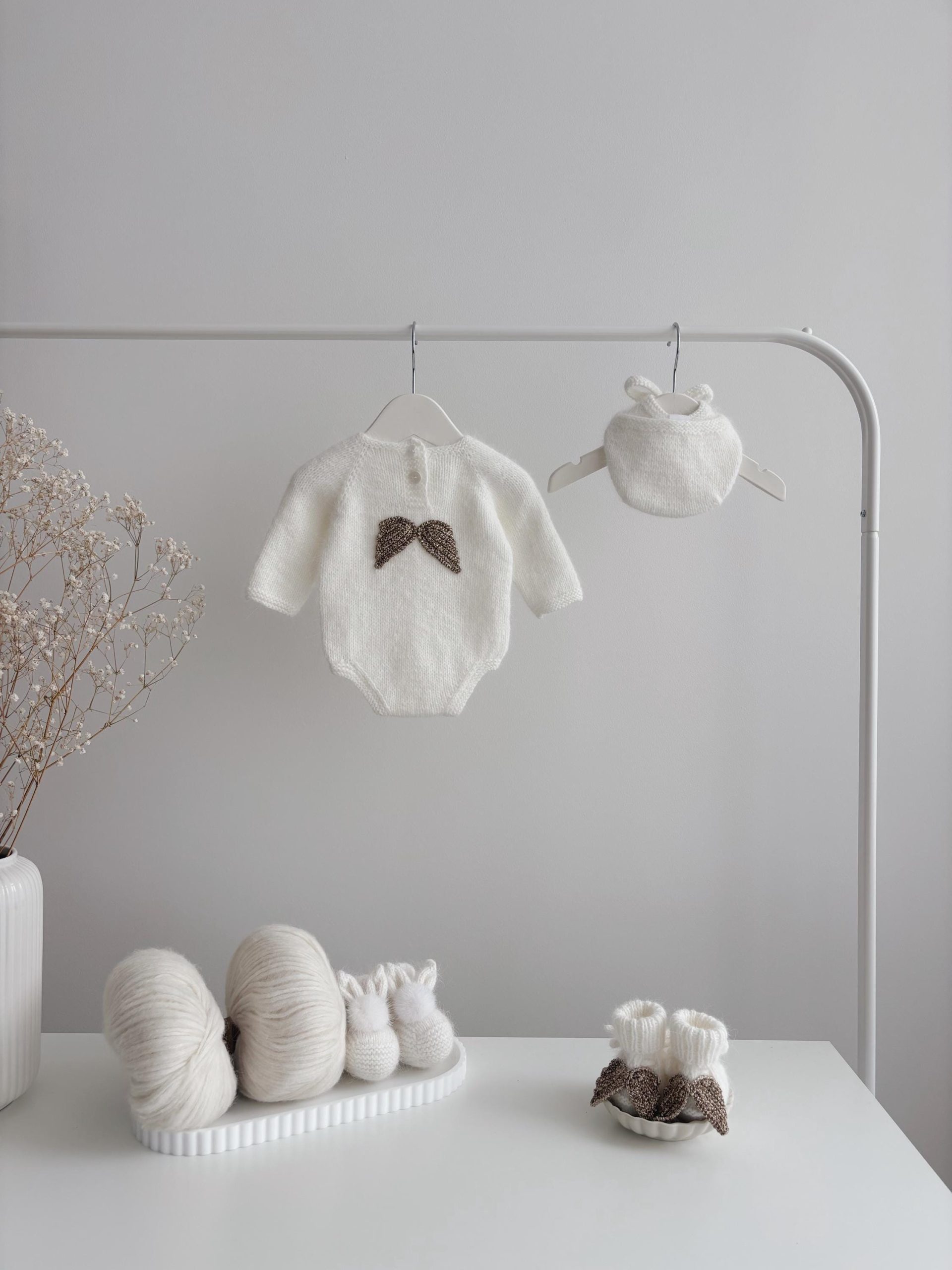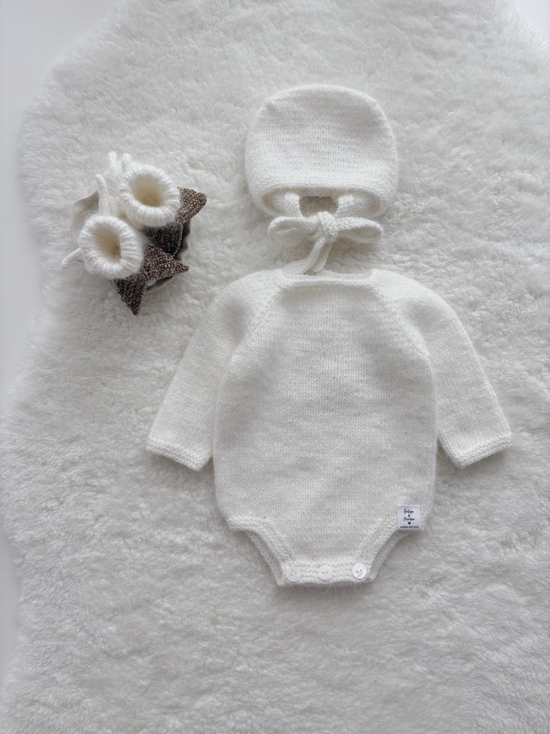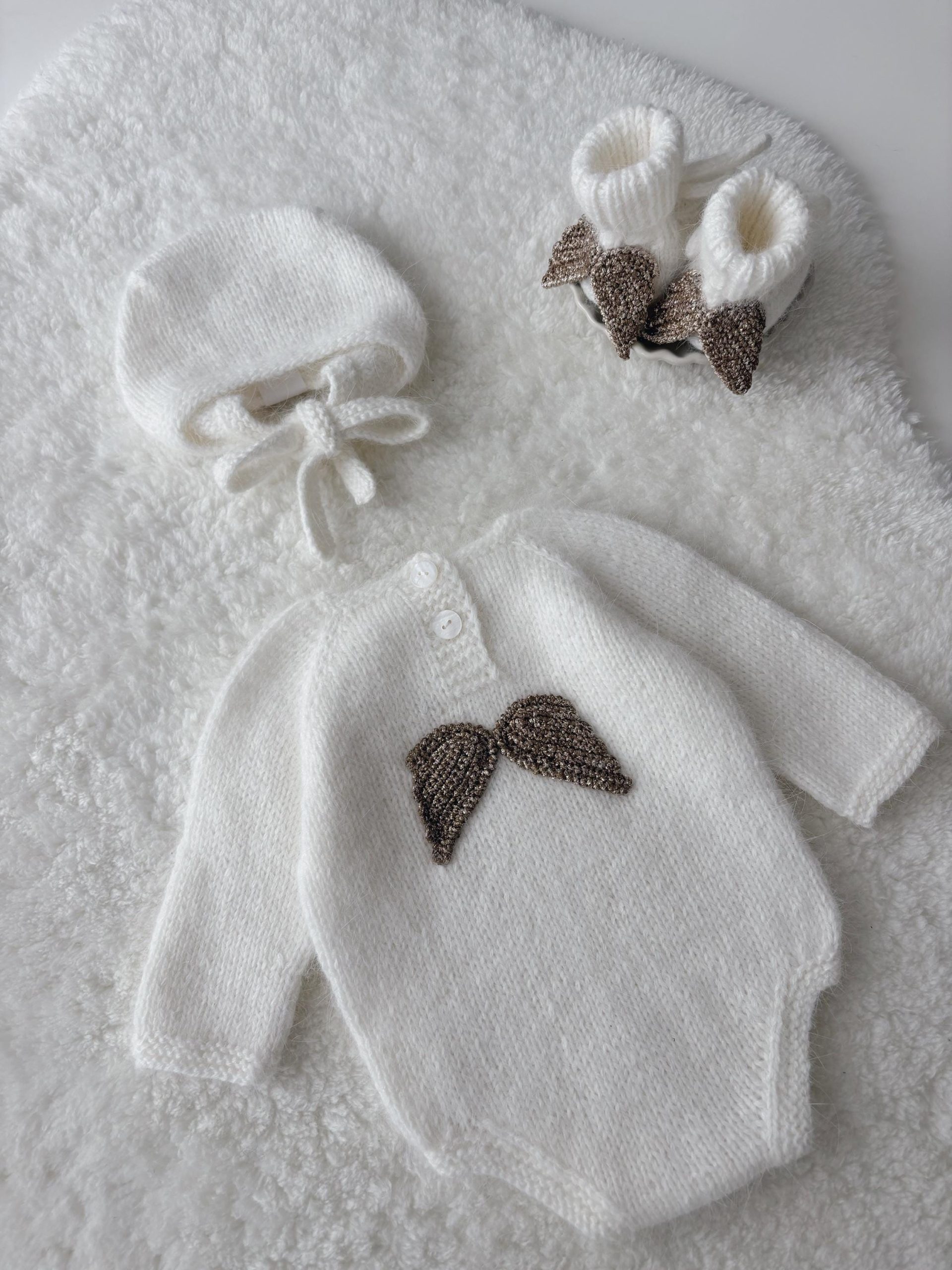 Merino Wool Baby Angel Outfit – Romper, Bonnet & Booties