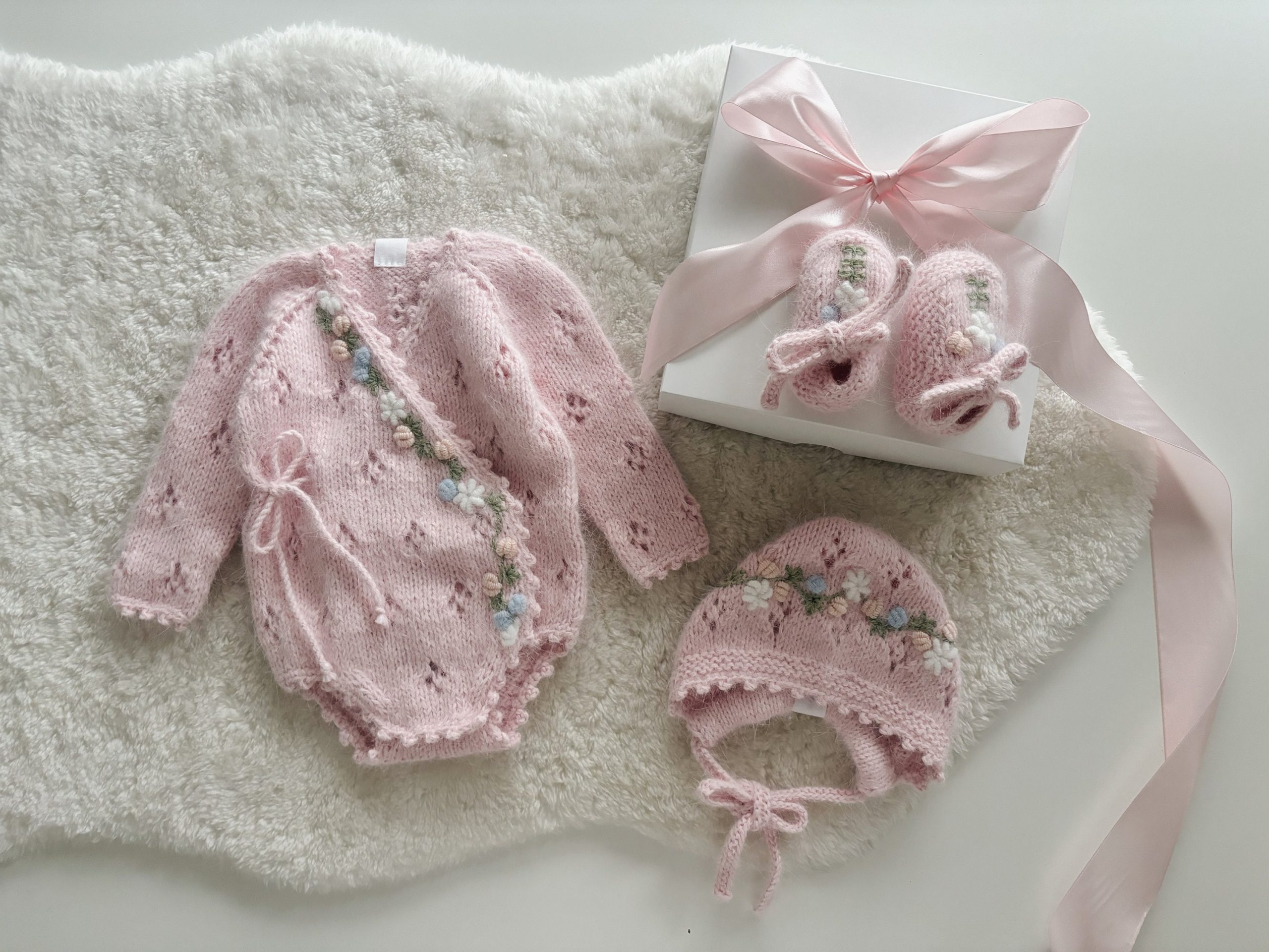 Hand-Knitted Merino Wool Baby Romper and Bonnet Set