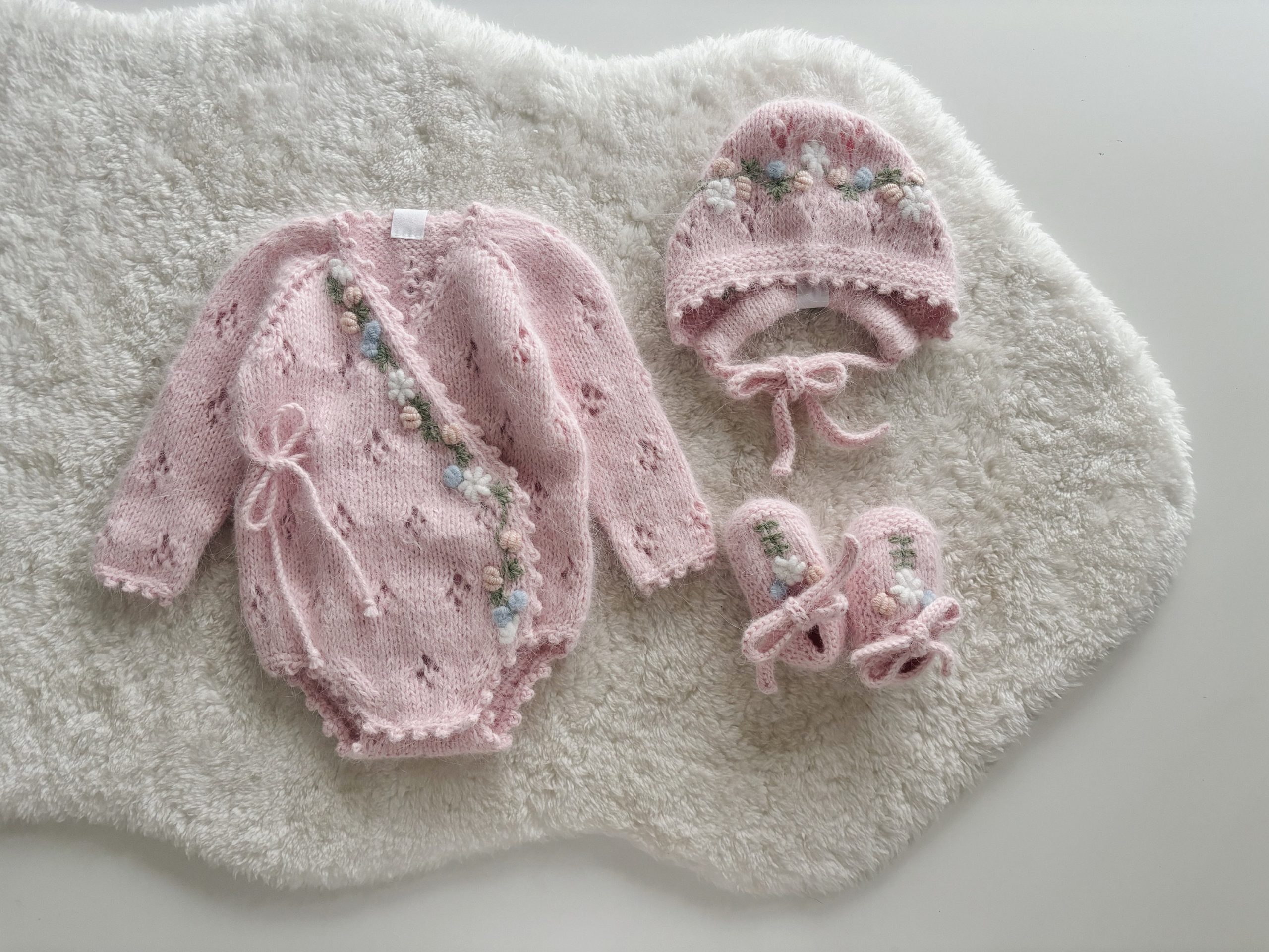 Angora Baby Girl Outfit – Embroidered Romper, Bonnet & Booties Set