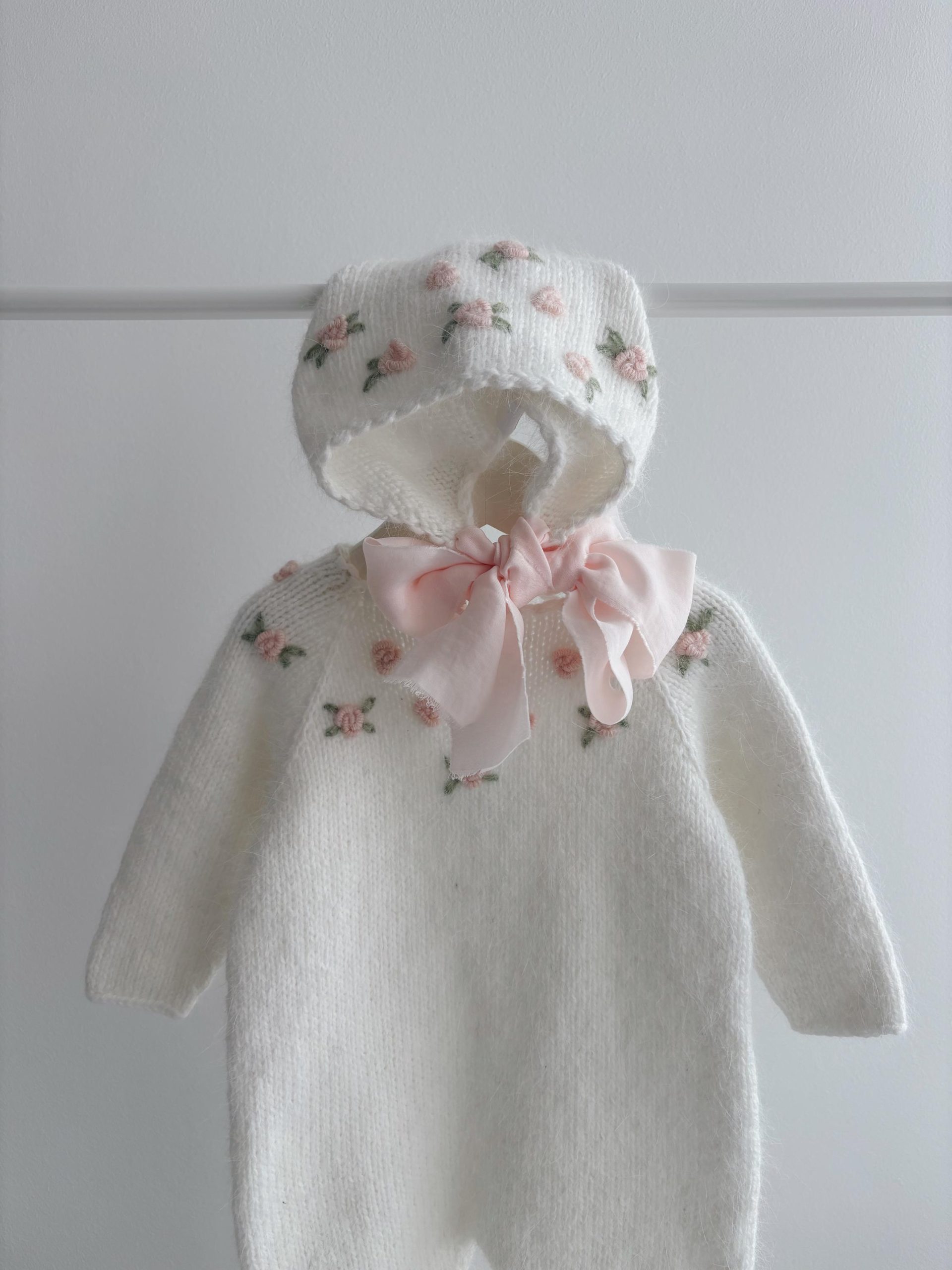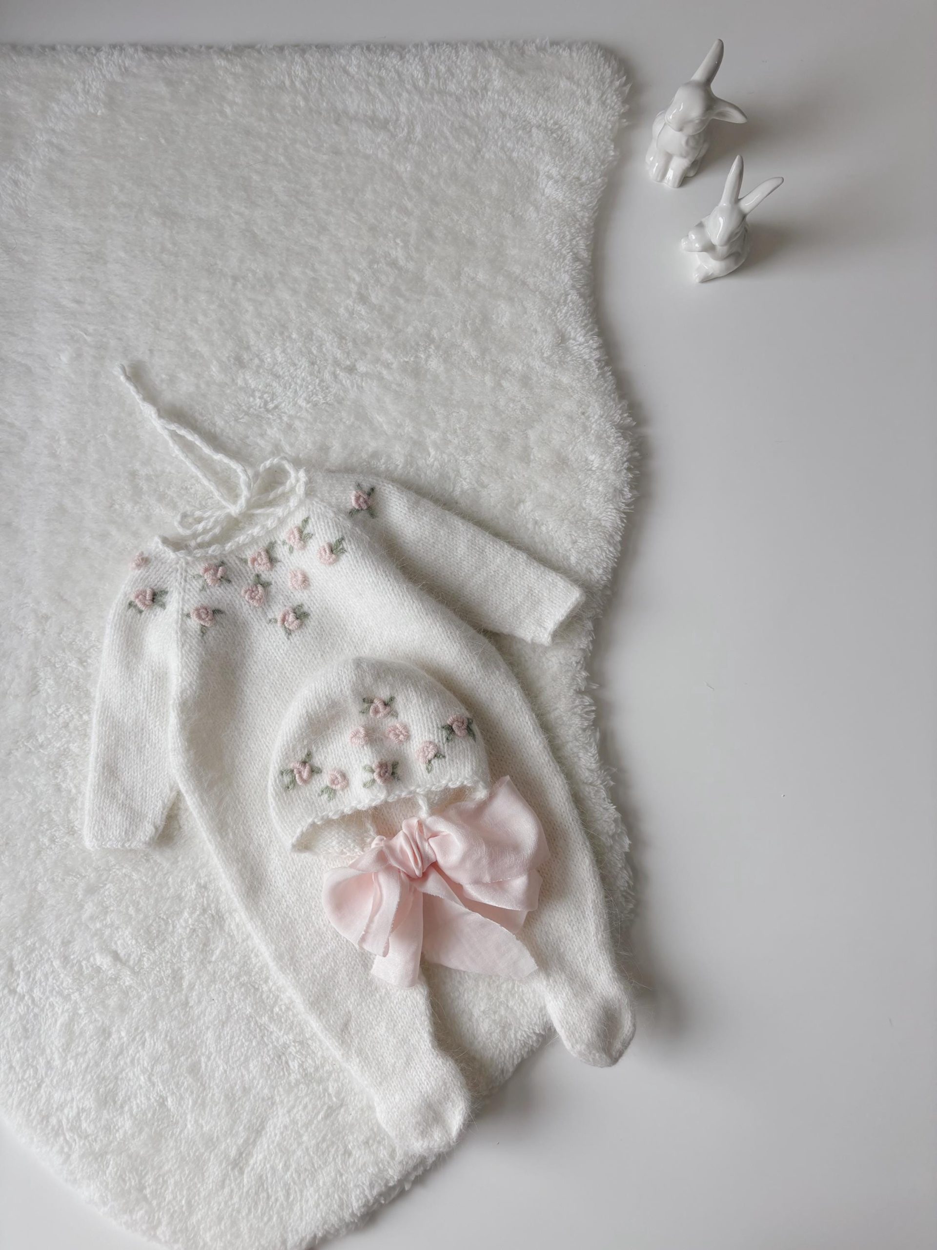 Alpaca Knit Baby Bunny Outfit – Romper and Bonnet Set