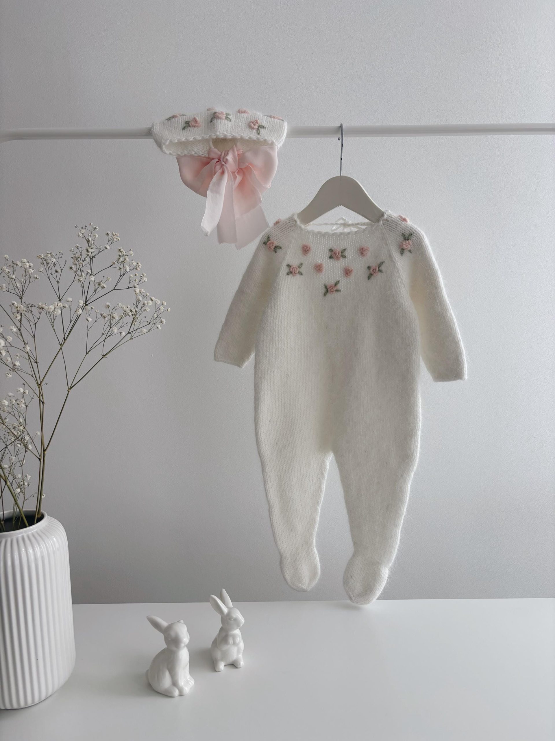 Hand Knitted Baby Alpaca Romper and Bonnet Set – Cream Popcorn Knit