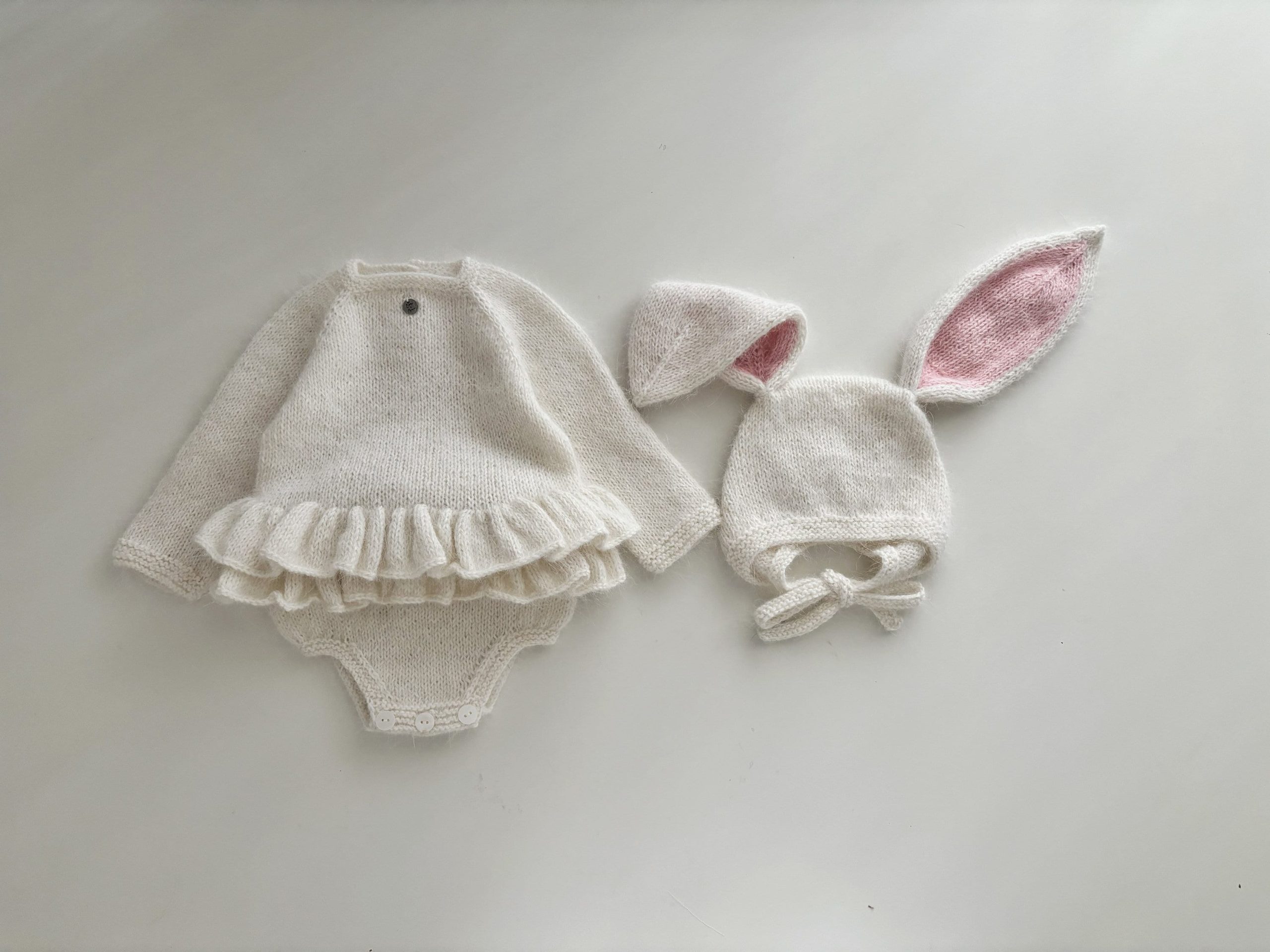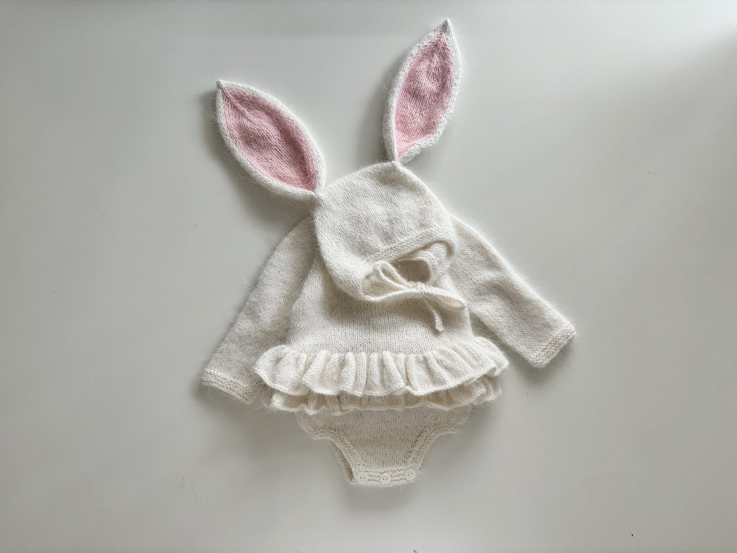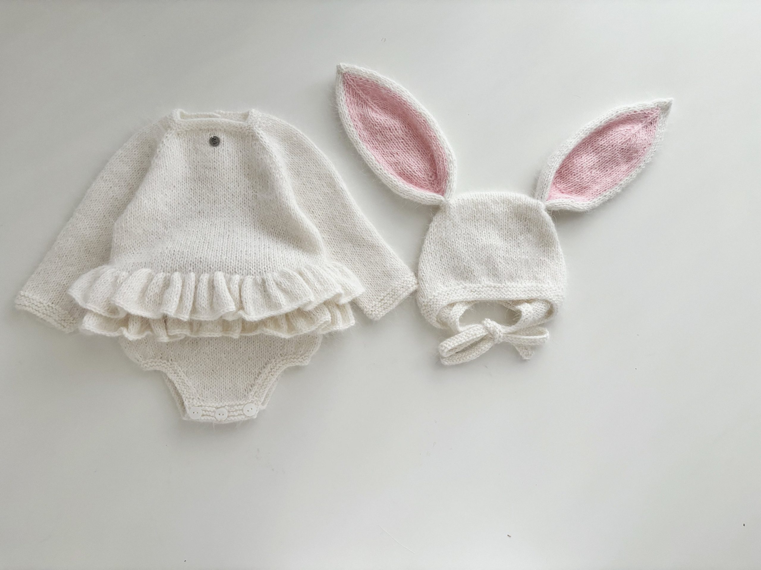 Angora Baby Romper and Bunny Bonnet Set – Ruffle Photo Props – READY TO SHIP