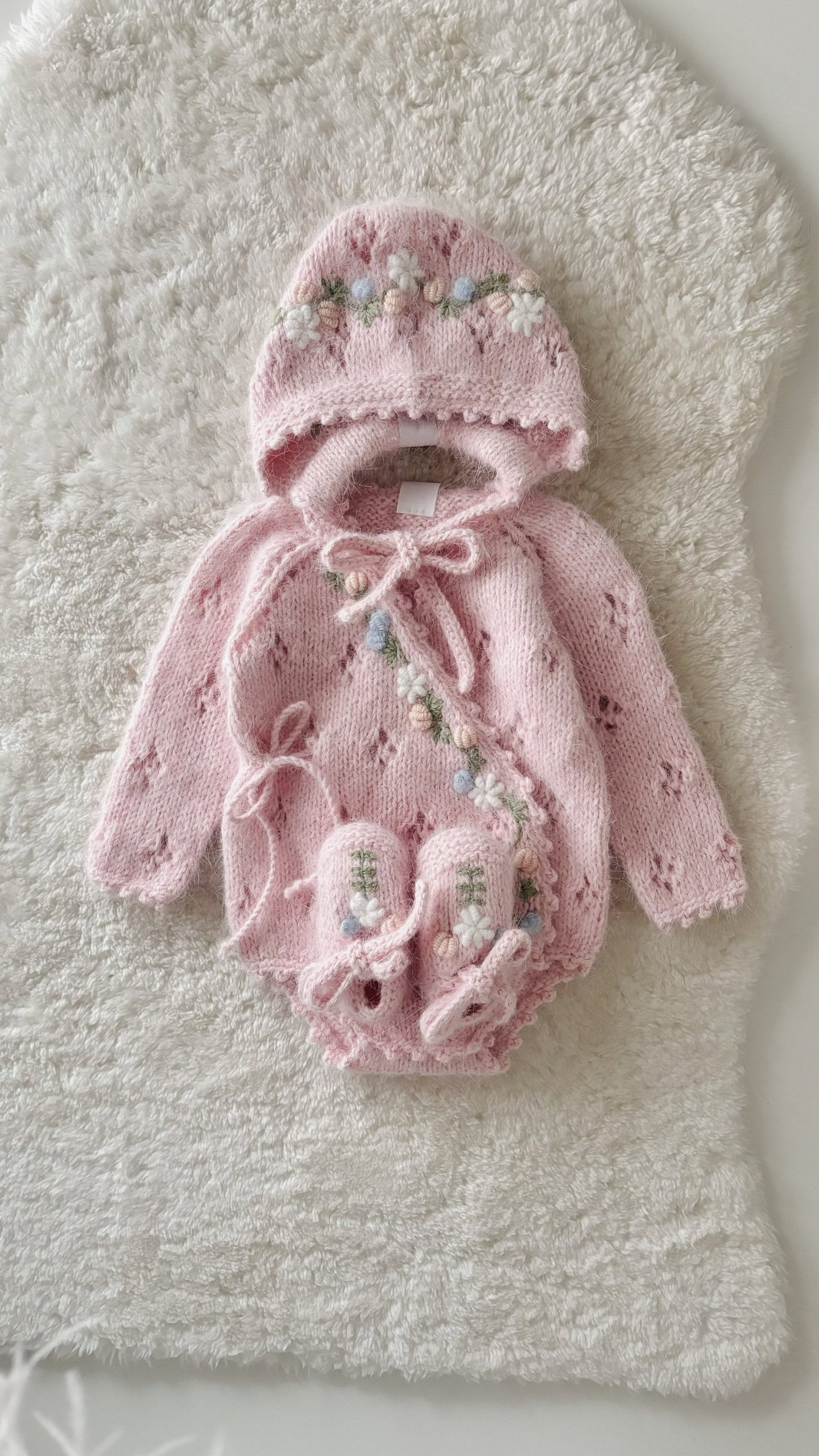Angora Baby Romper Set – Bonnet and Booties, Newborn Outfit