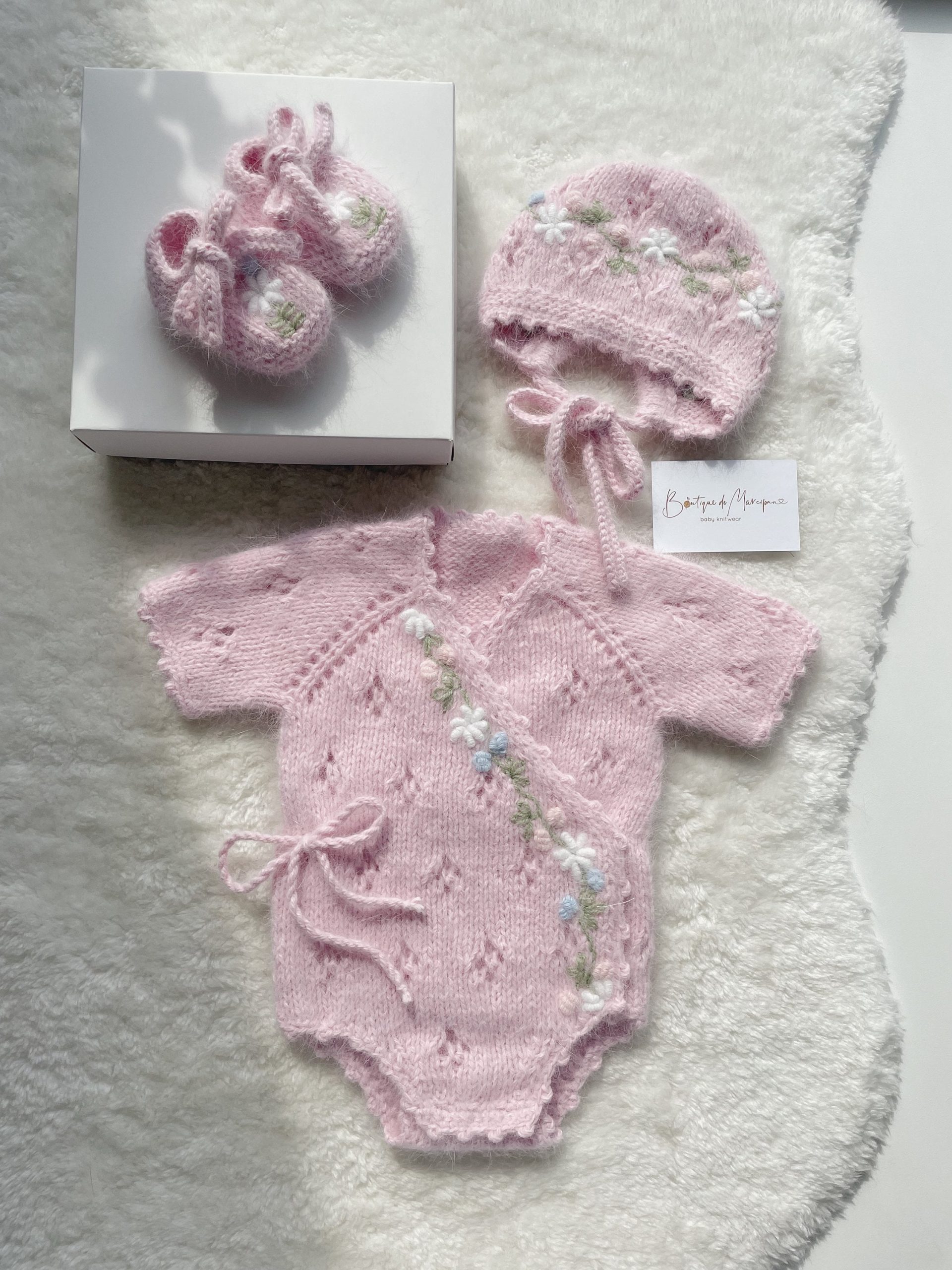 Embroidered Merino Baby Romper and Bonnet Set – Knitted Photo Prop