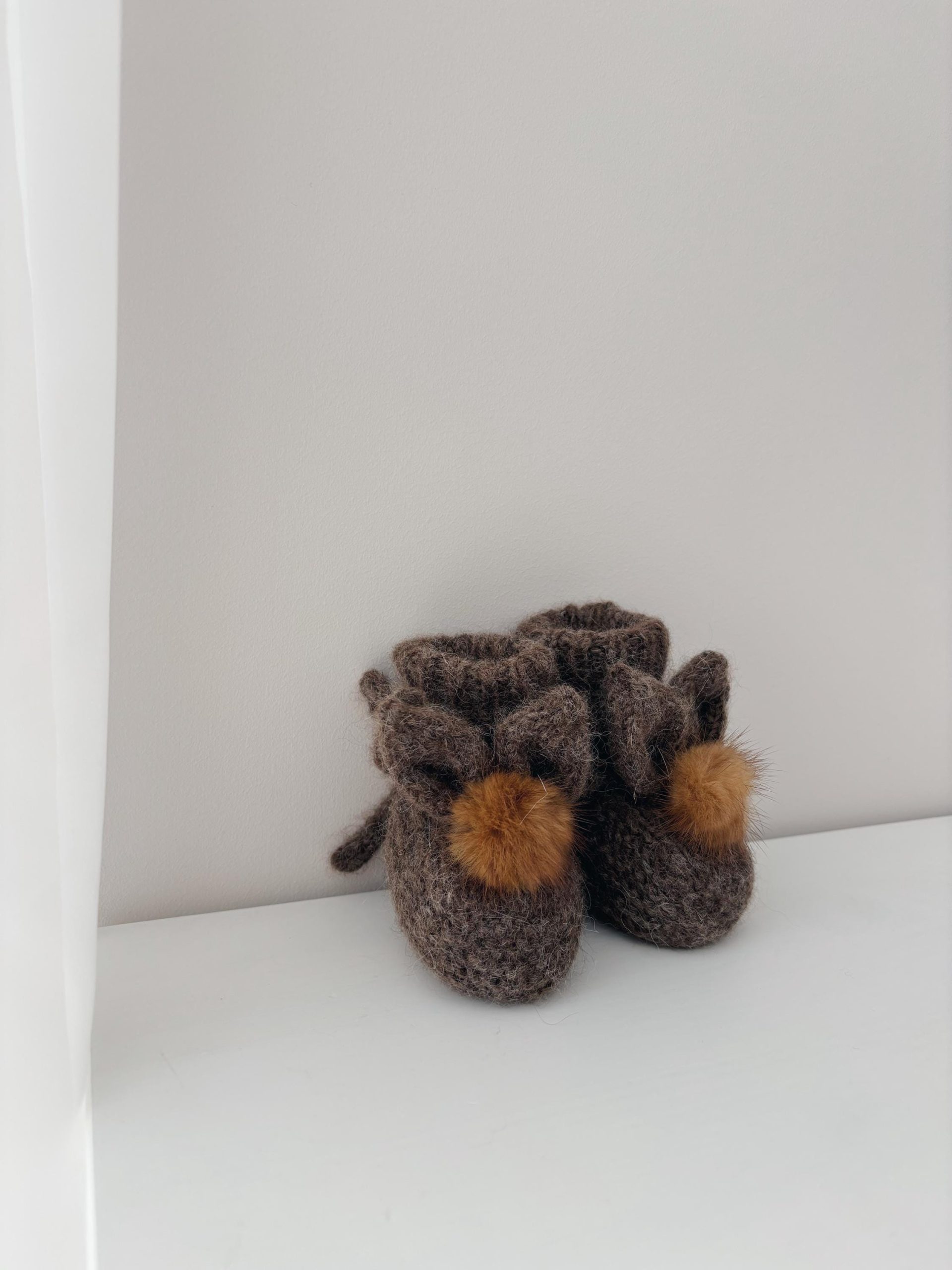Angora Bunny Booties (0-3 Months) – Baby Alpaca Knit, Genuine Fur Pom Poms