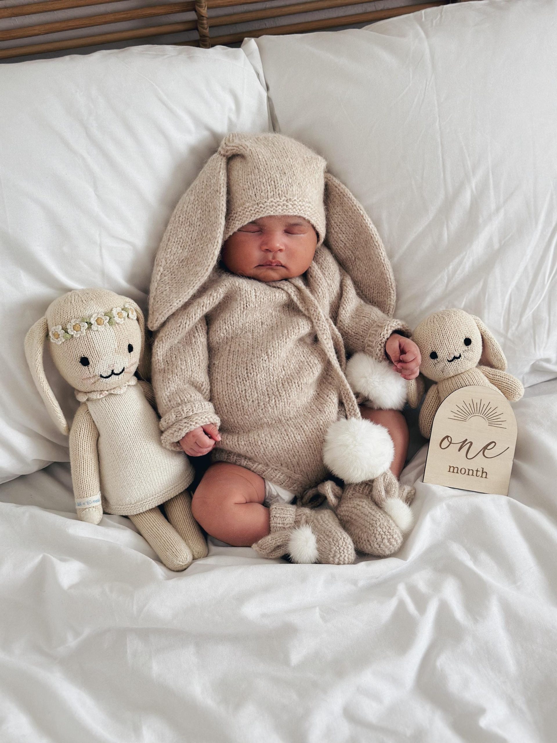 Alpaca Knit Baby Bunny Outfit – Romper and Bonnet Set
