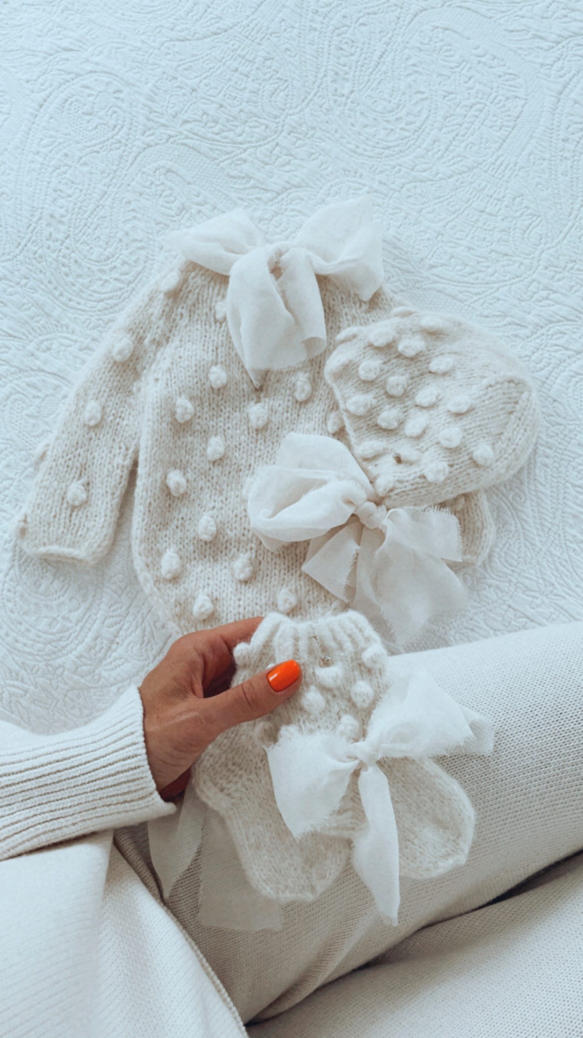 Knit Baby Romper Set – Alpaca Bonnet and Socks, Cream Photo Prop