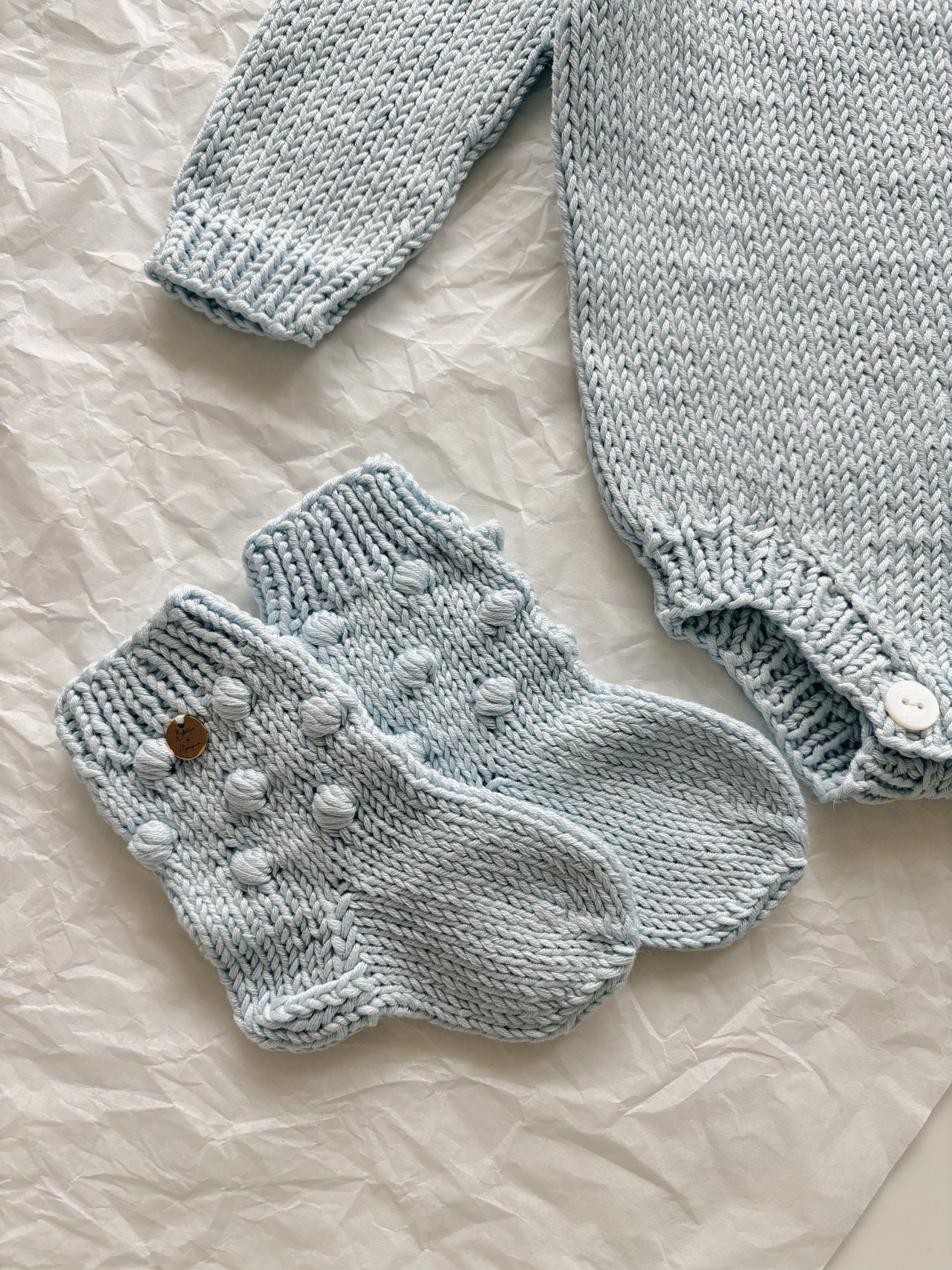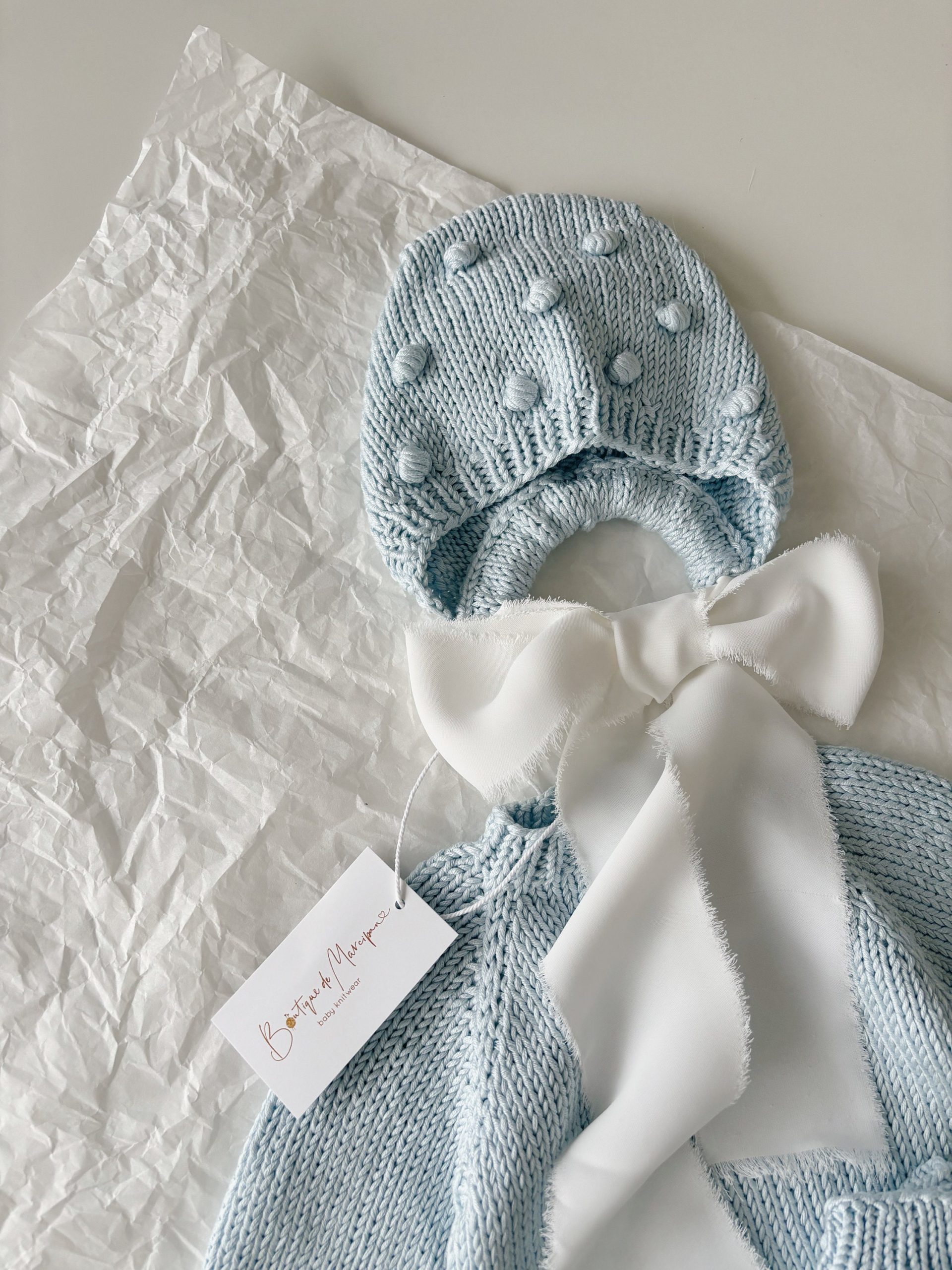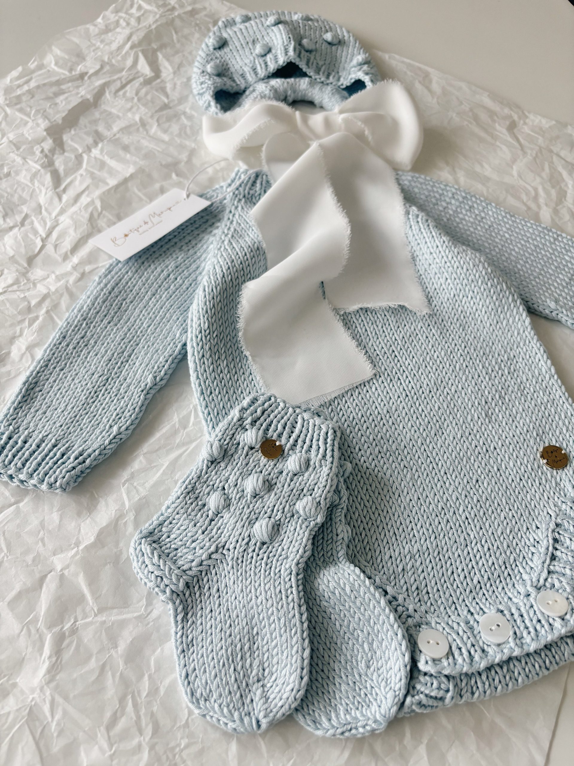 Knitted Baby Romper & Bonnet Set – Pale Blue Cotton Outfit