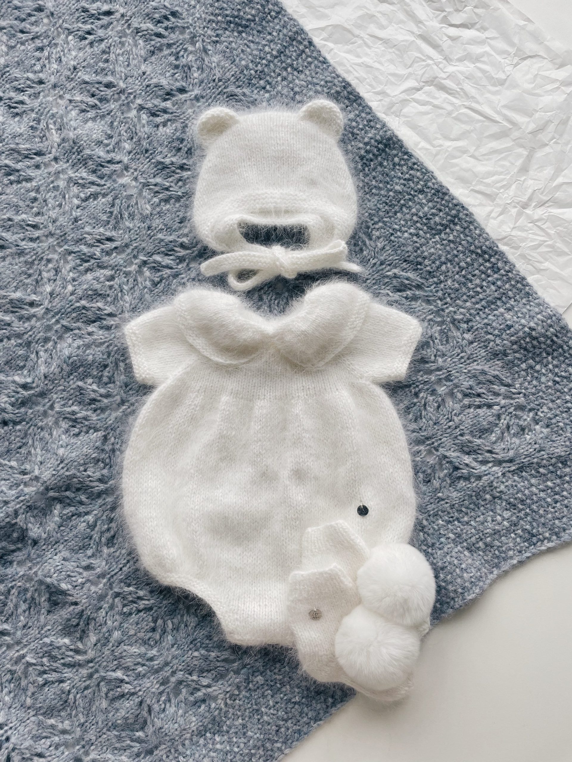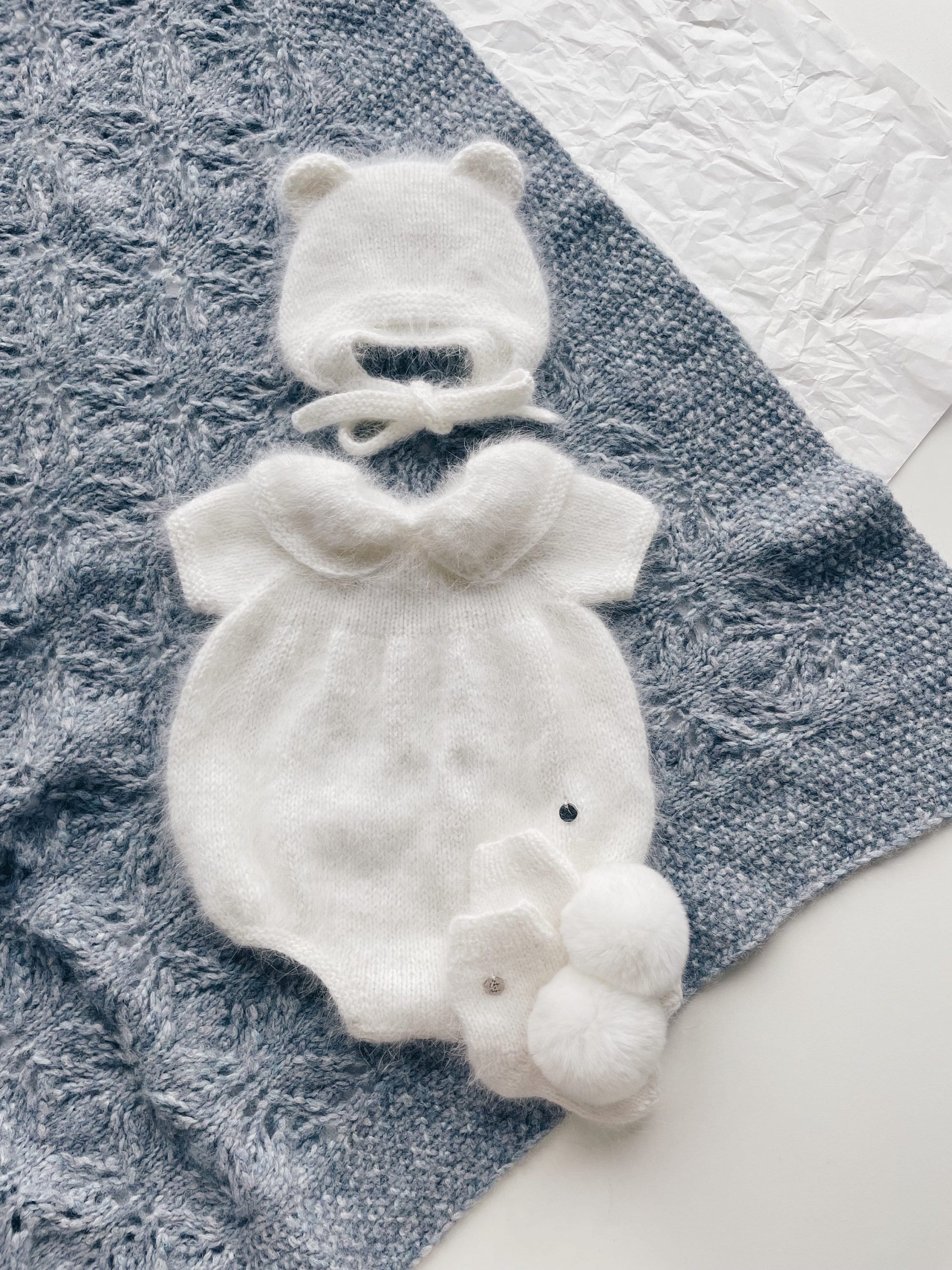 Embroidered Merino Baby Romper and Bonnet Set – Knitted Photo Prop