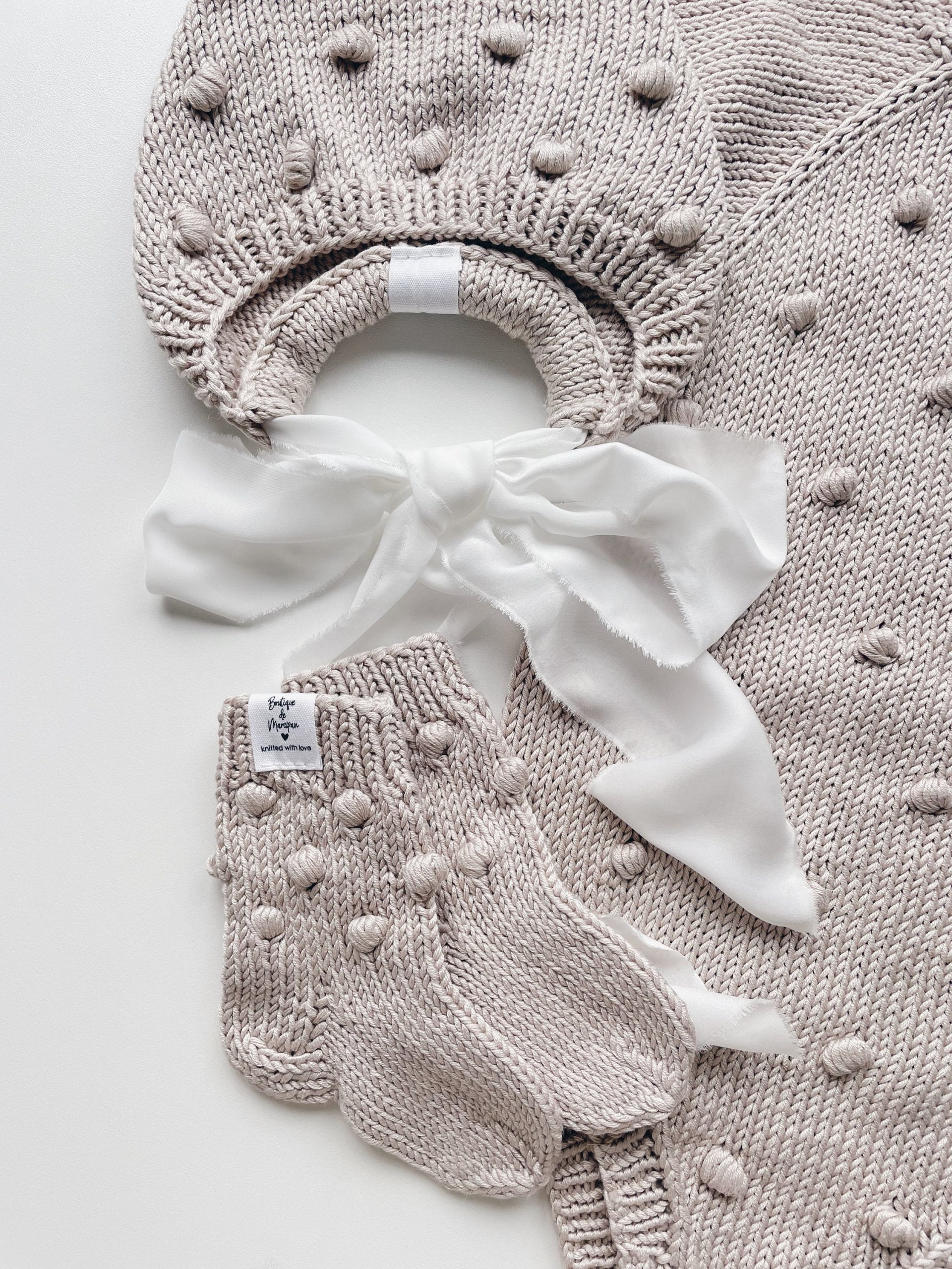 Knit Baby Romper Set – Alpaca Bonnet and Socks, Cream Photo Prop