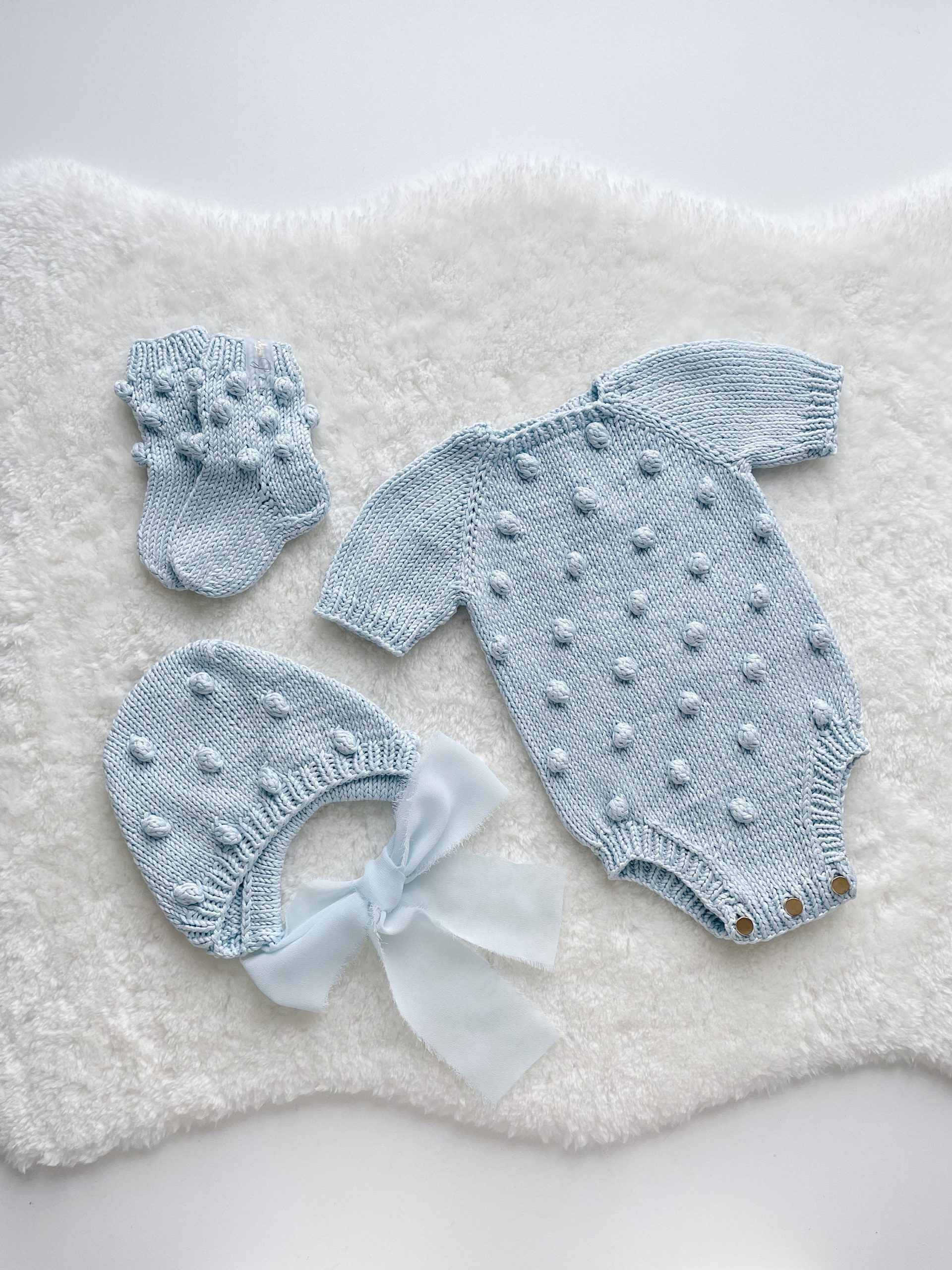 Merino Knit Baby Romper Set, Floral Bonnet & Booties