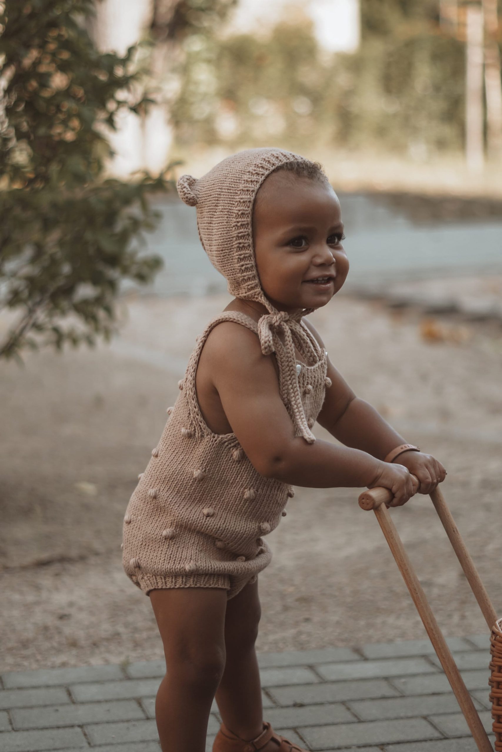 Cotton Baby Romper Set – Camel Knit Bonnet & Booties, Mink Pom Poms