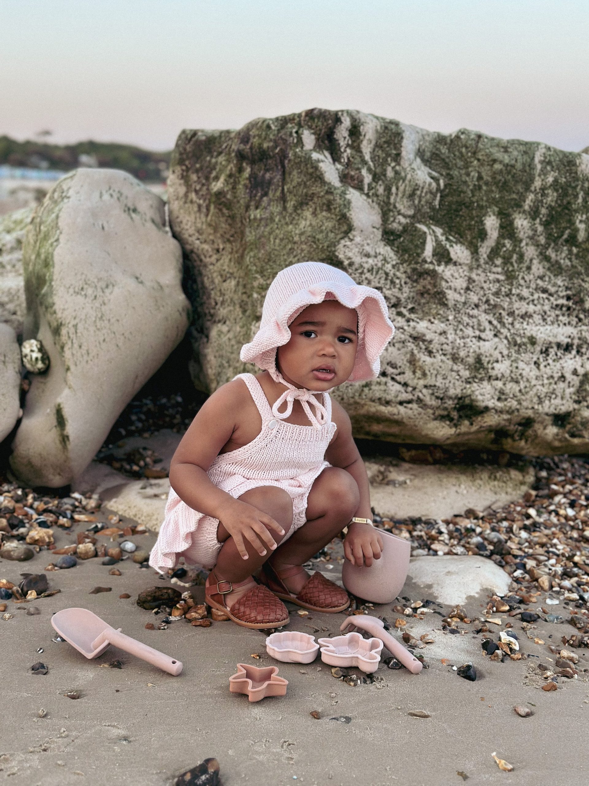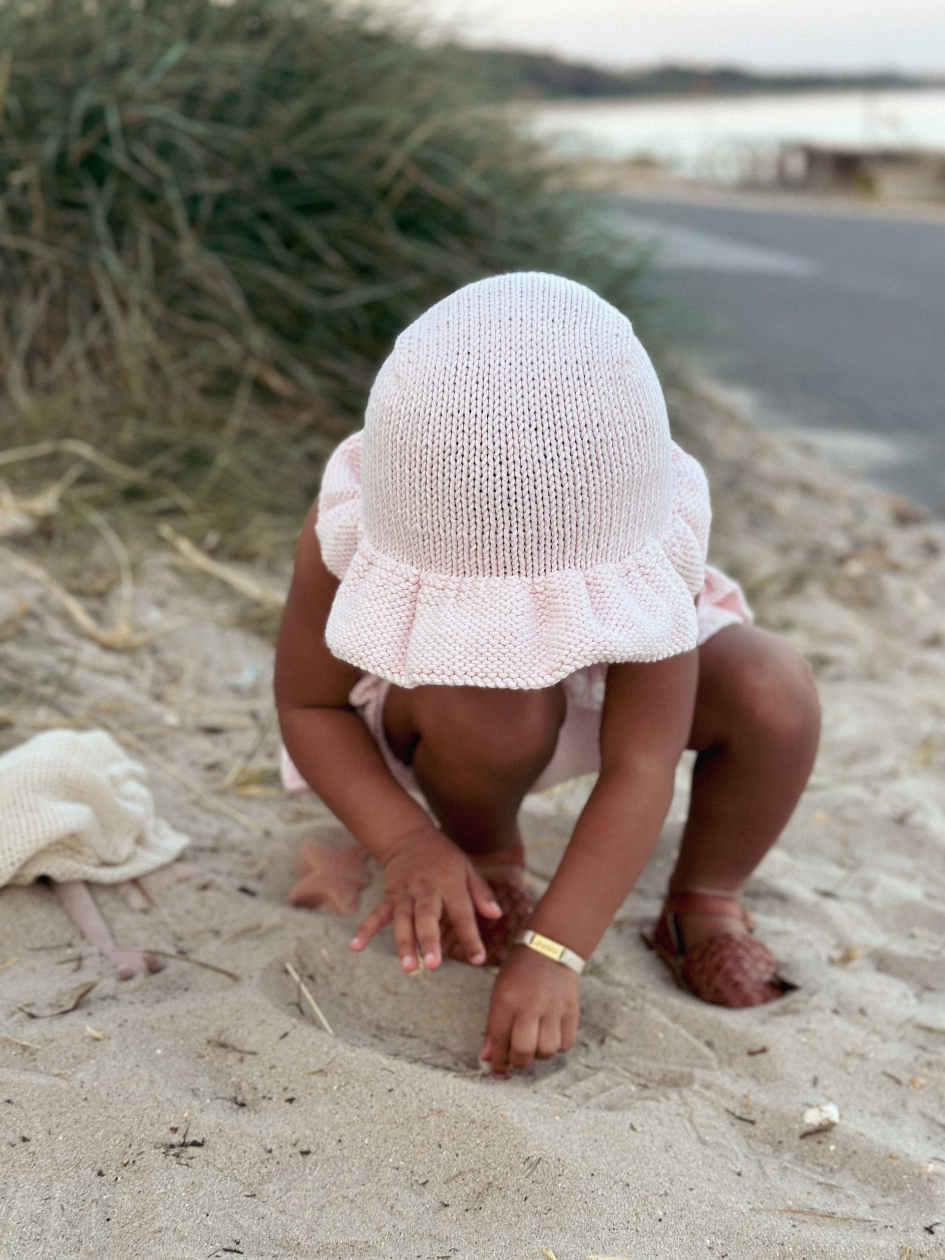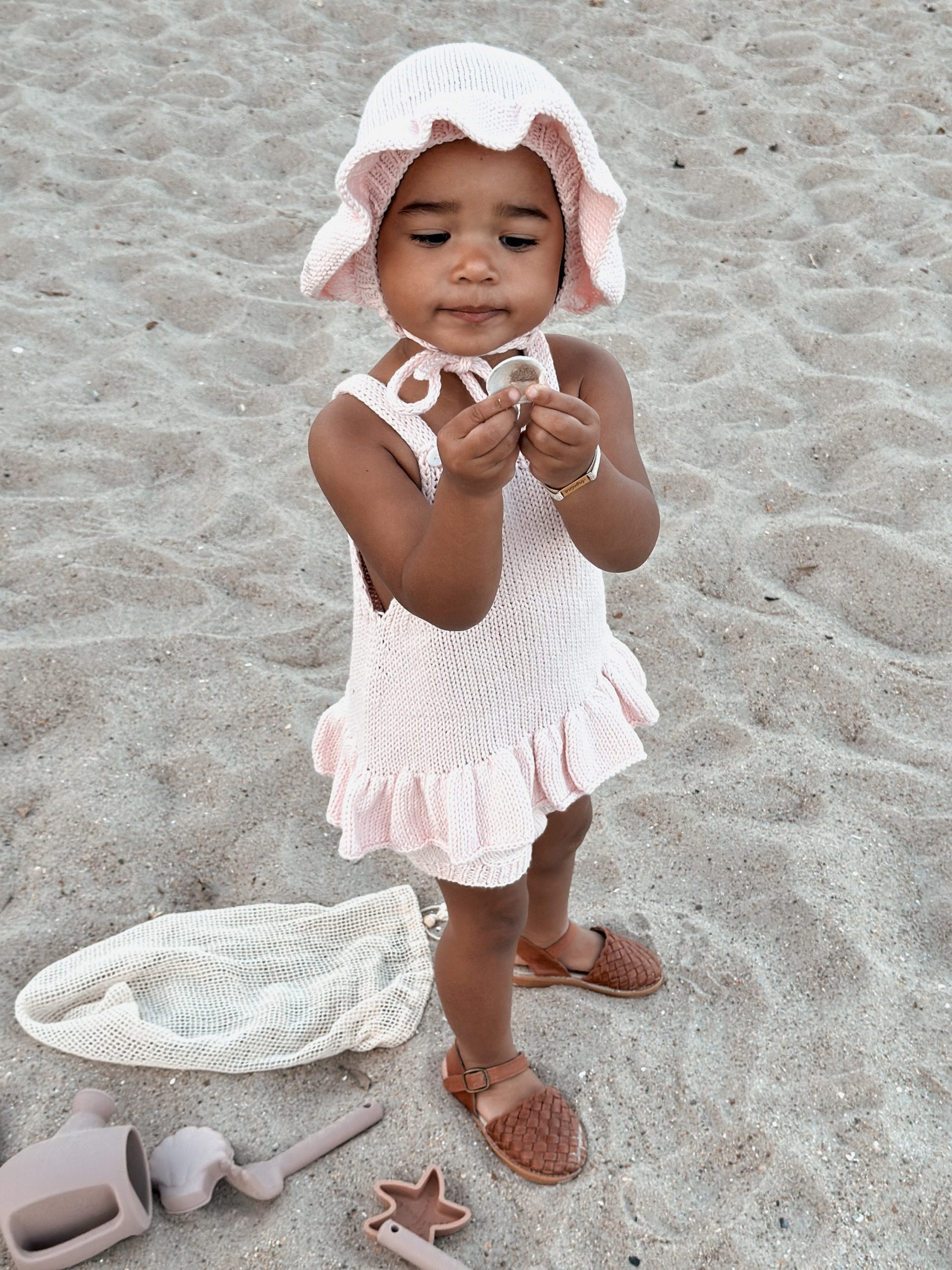 Cotton Popcorn Knit Baby Romper & Bonnet Set – Pale Pink Ruffle