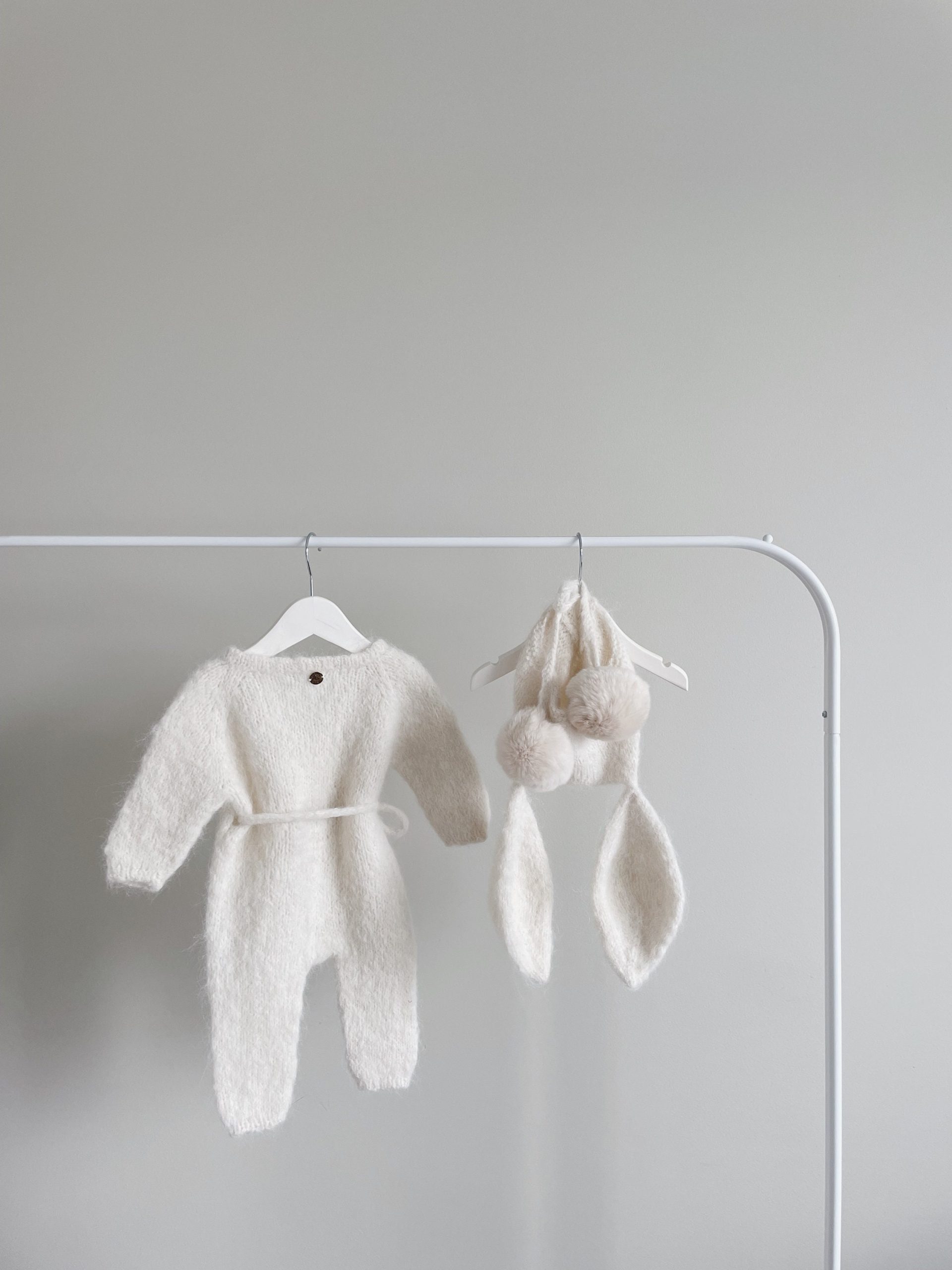 Cream Alpaca Knit Baby Romper and Bunny Bonnet Set