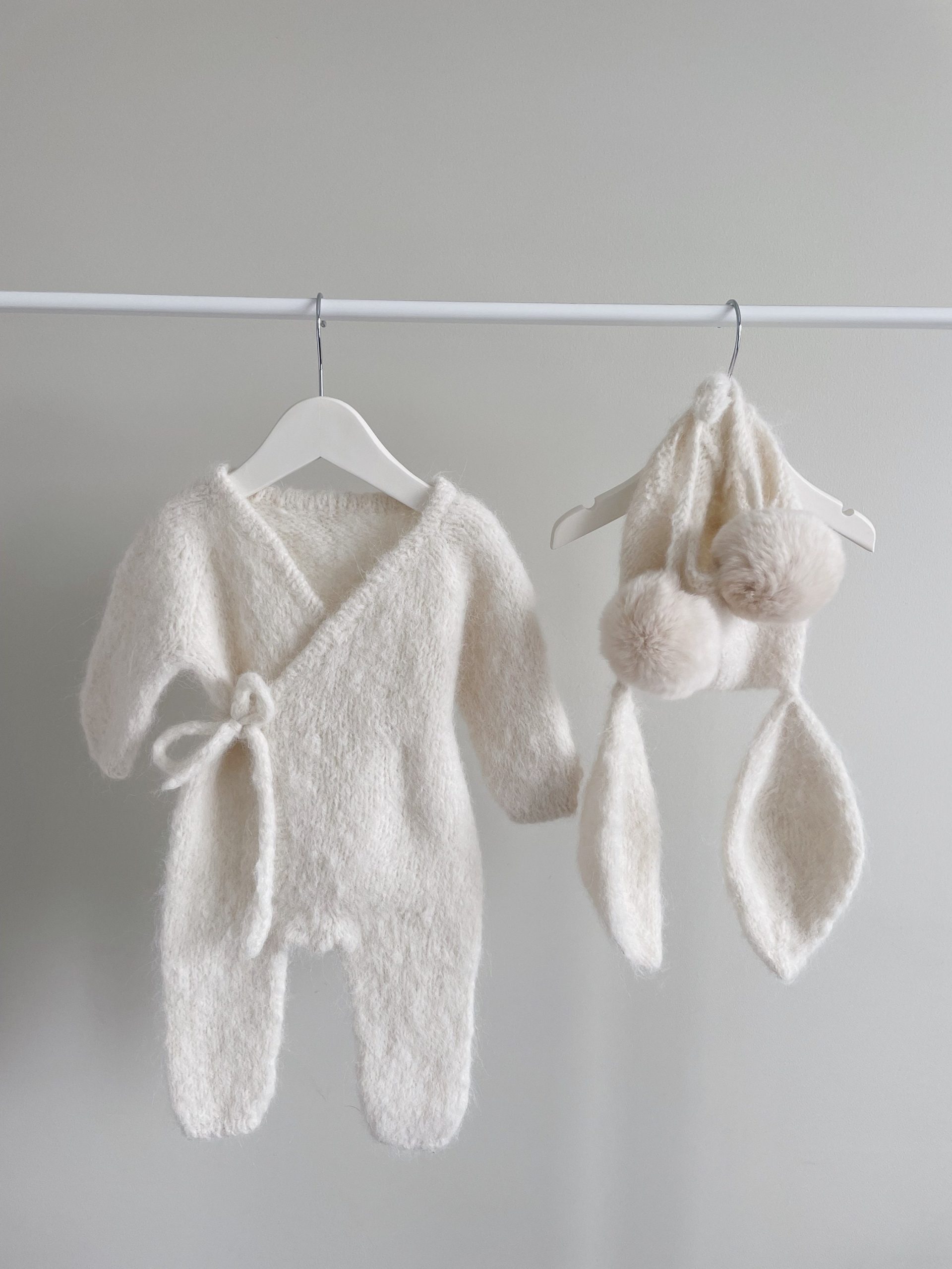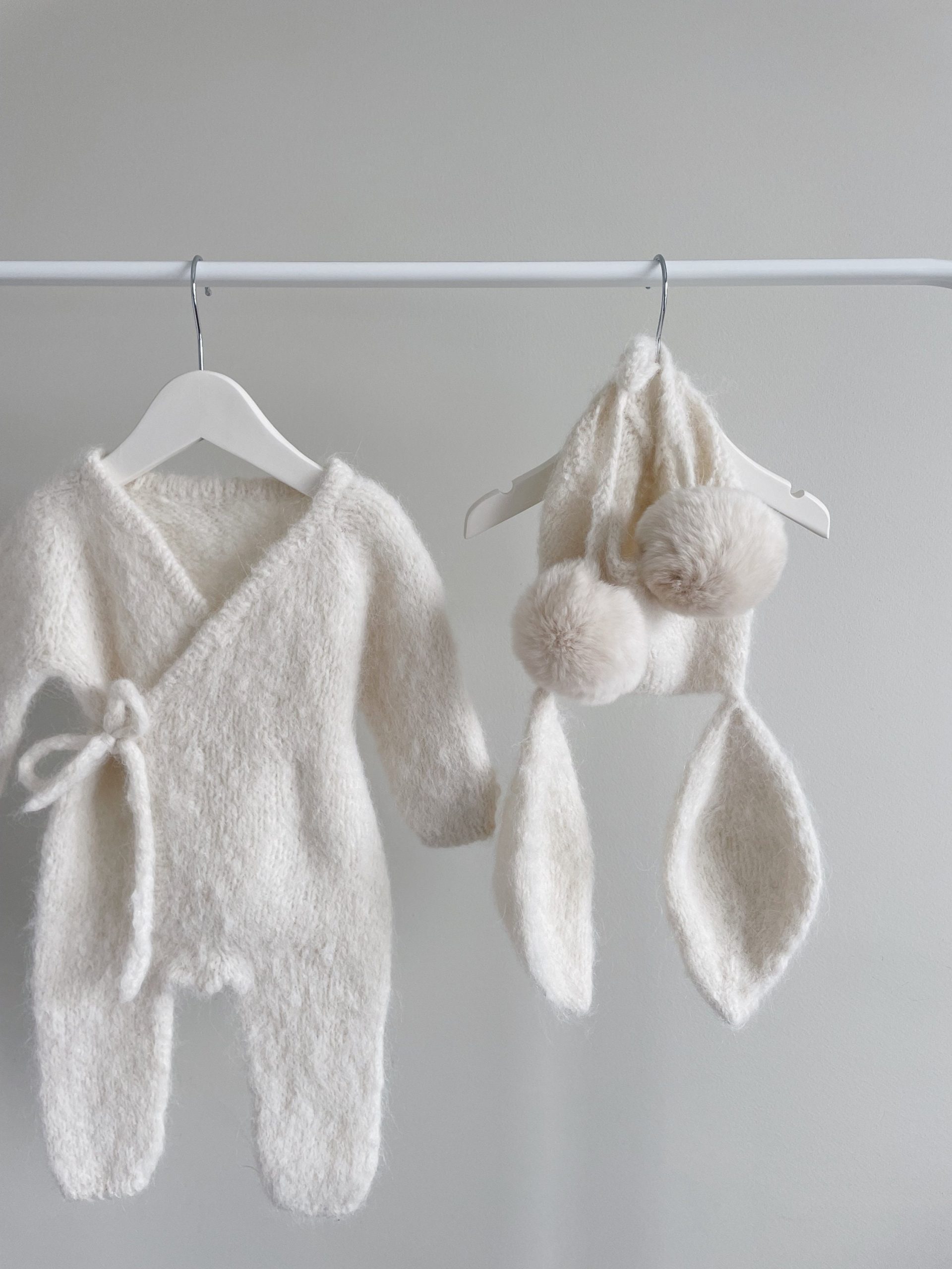 Cream alpaca romper bunny bonnet and bunny booties – Set of 3 – Photography props