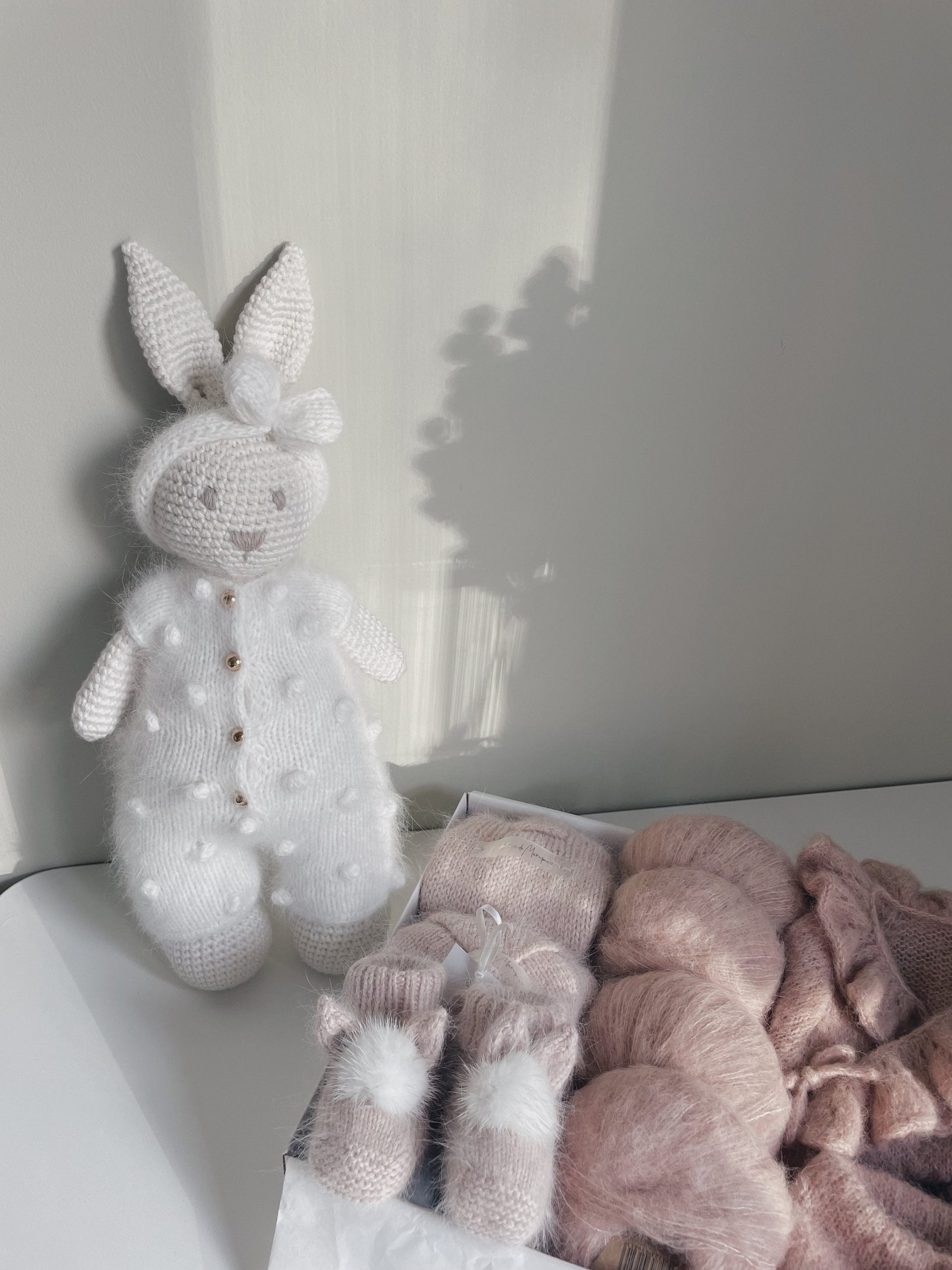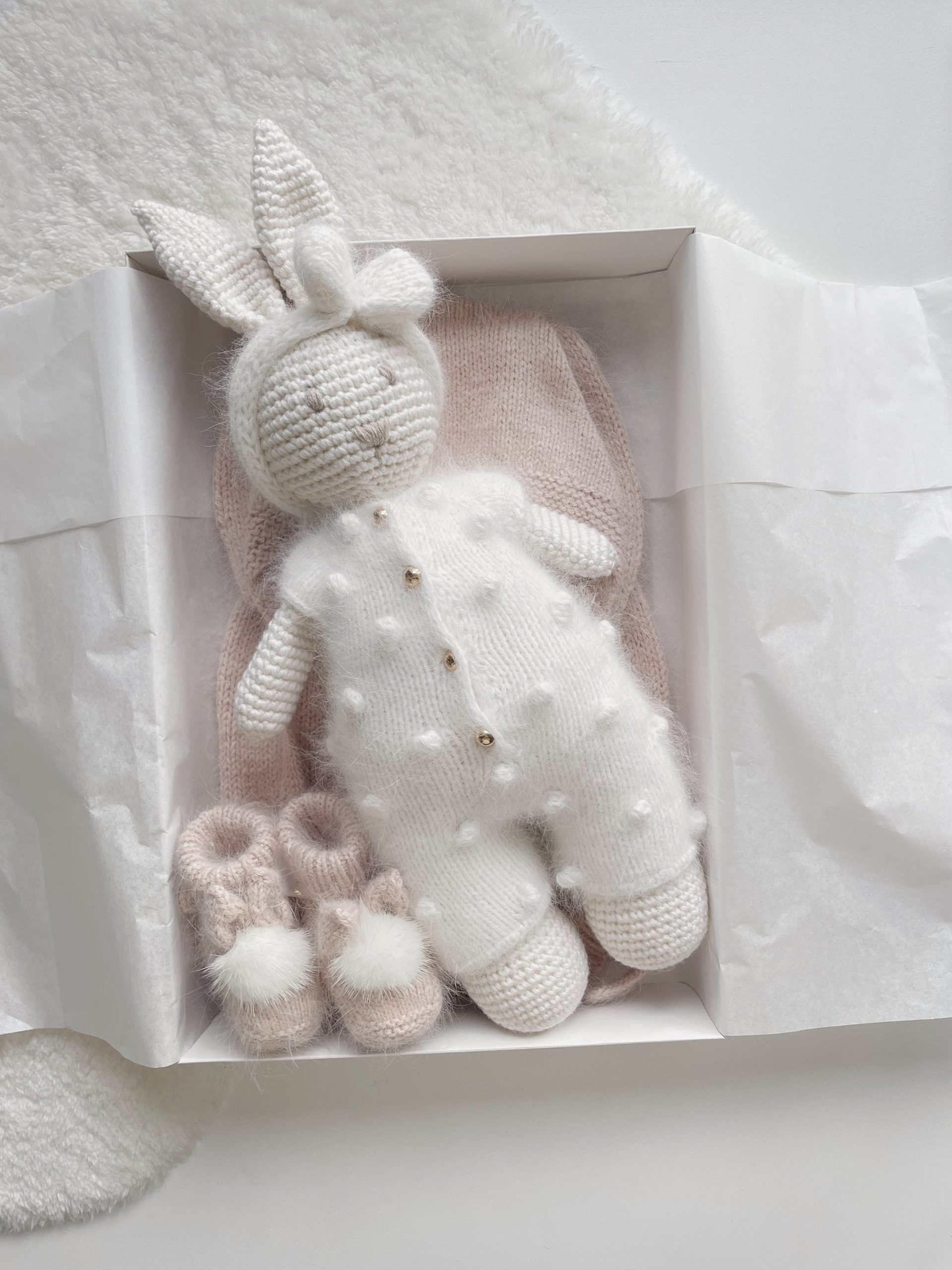 Crochet bunny in white popcorn angora romper with bow on head – Cuddle toy