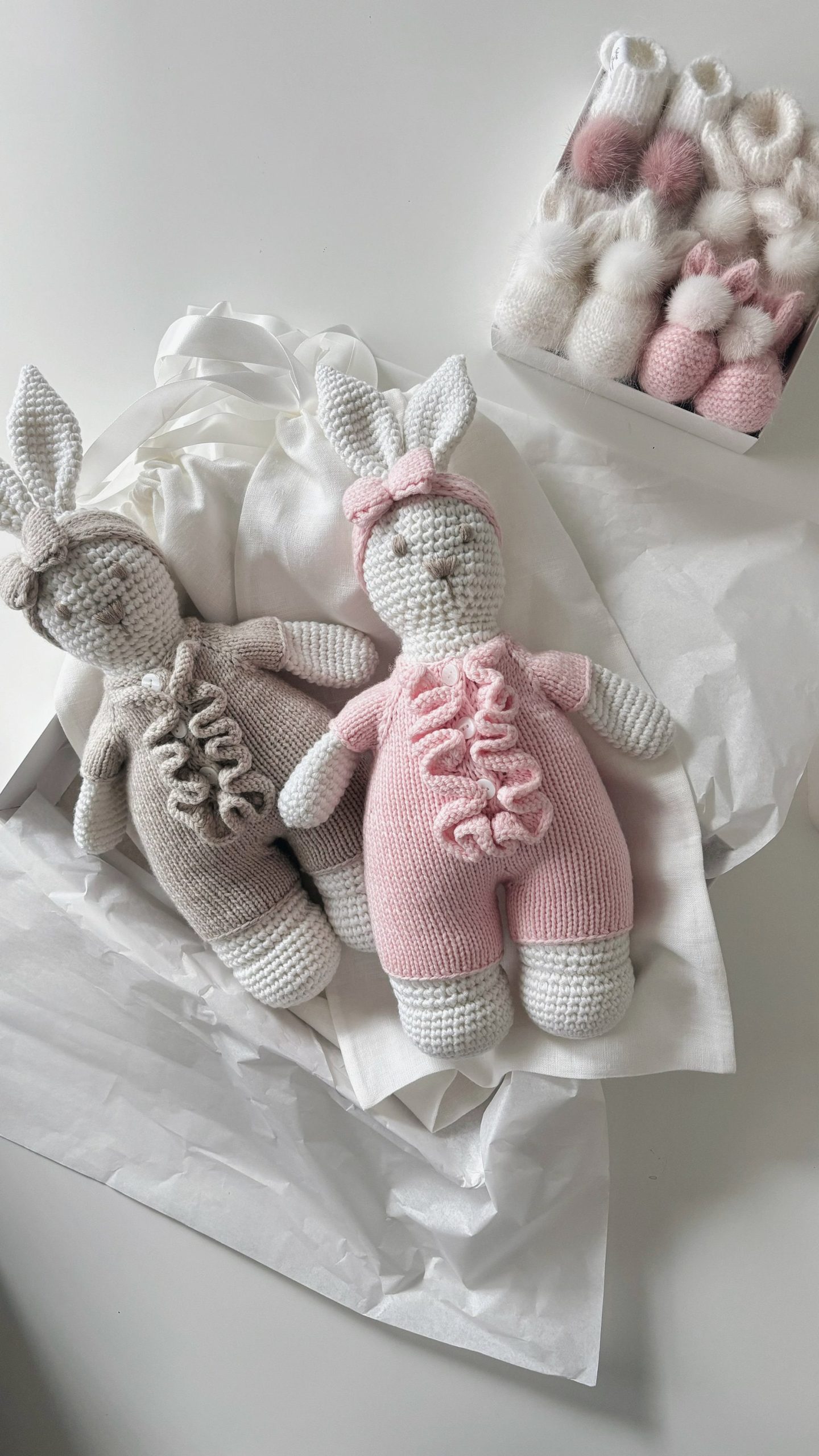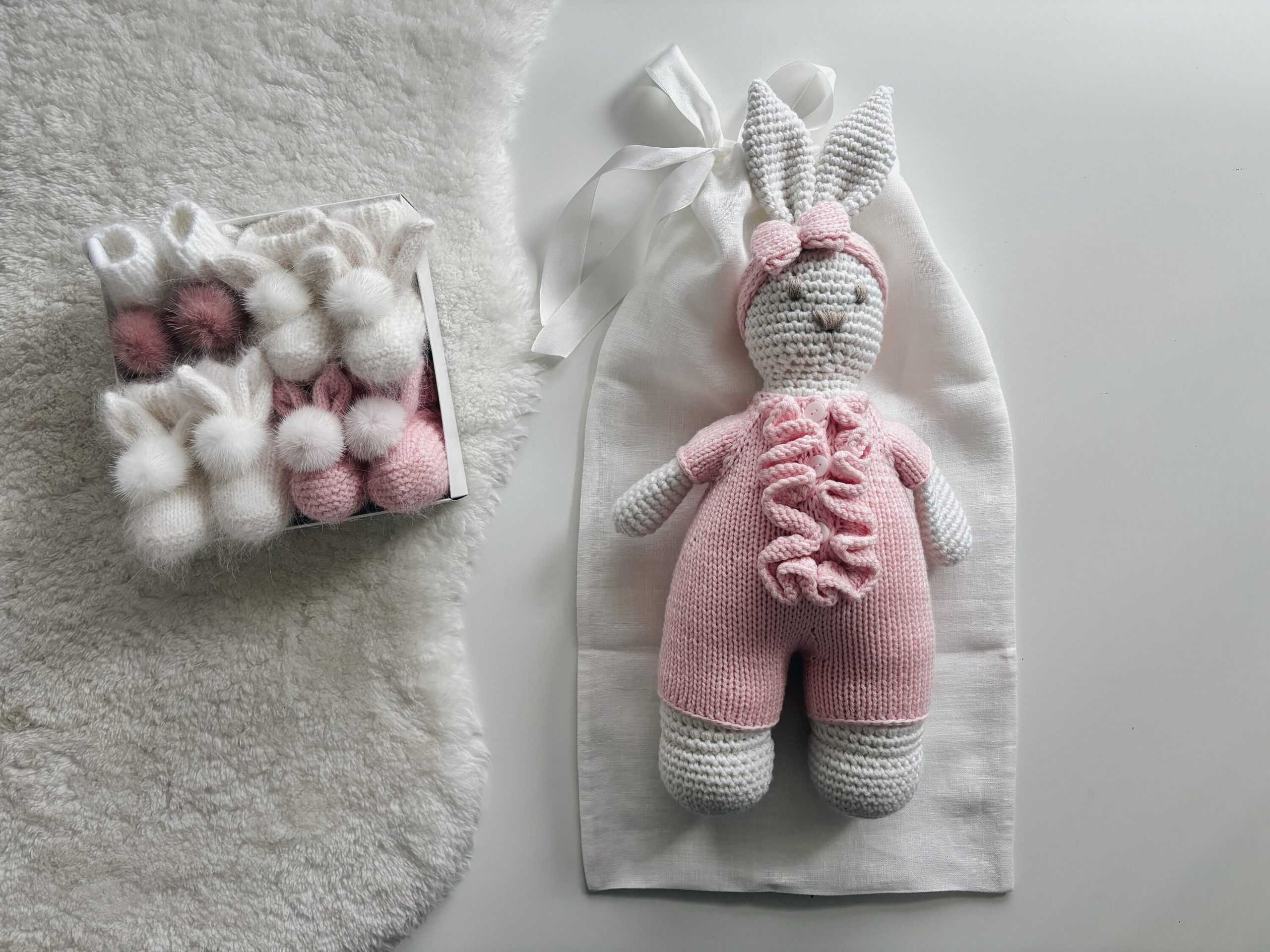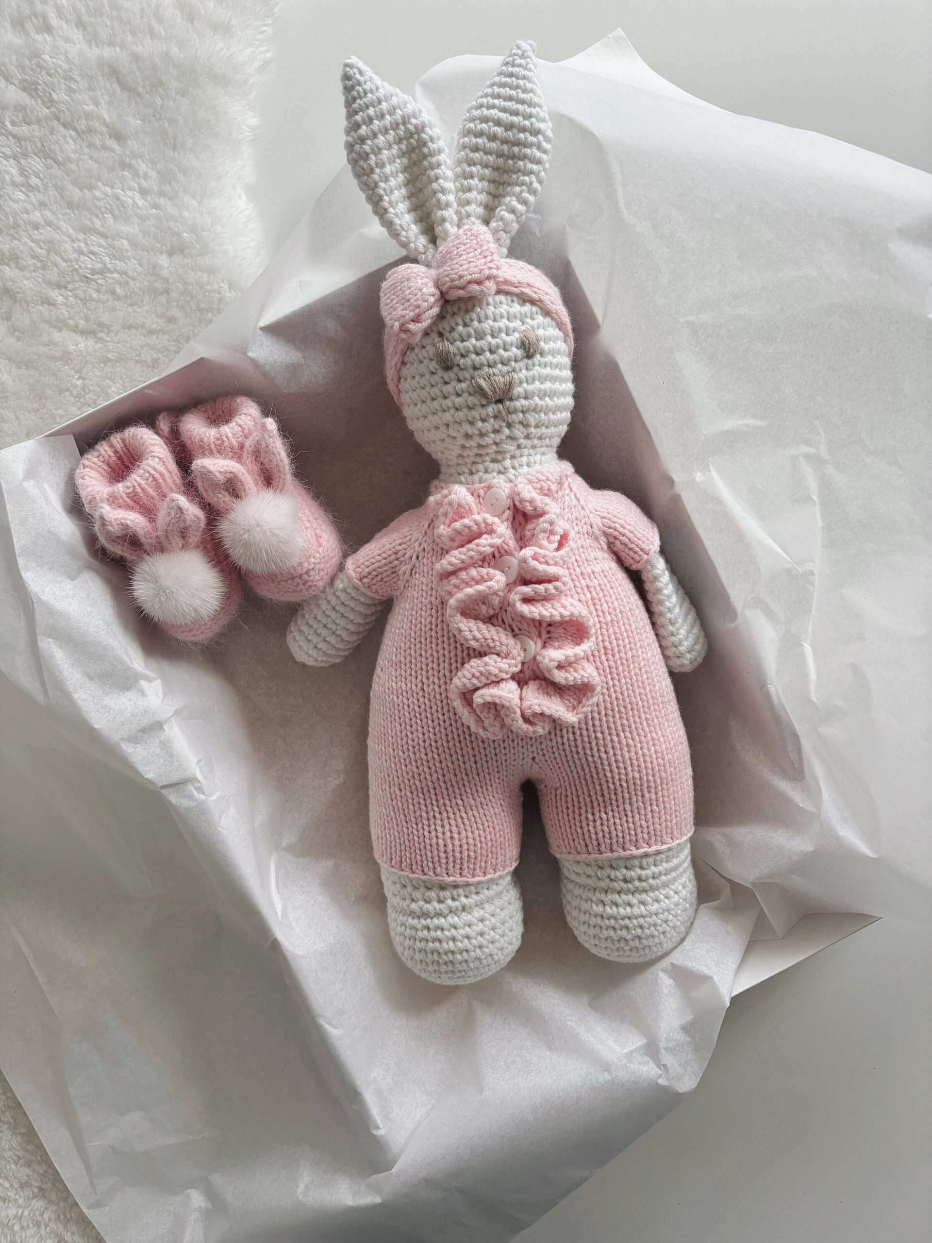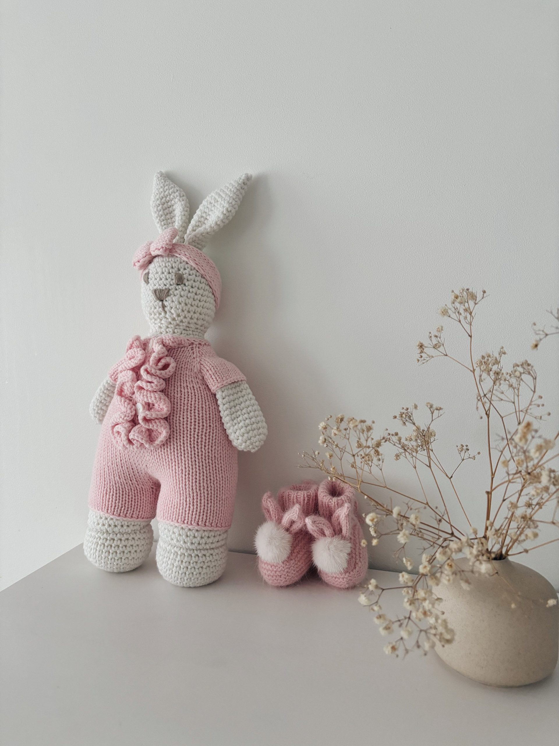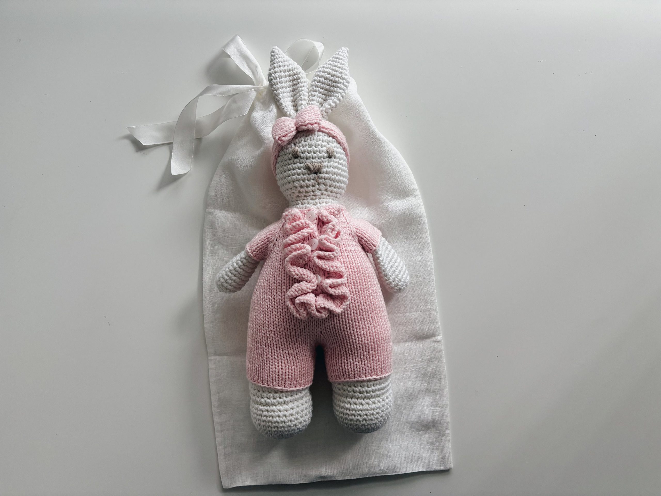 Crochet Bunny Toy – 100% Merino Wool, Pink Outfit