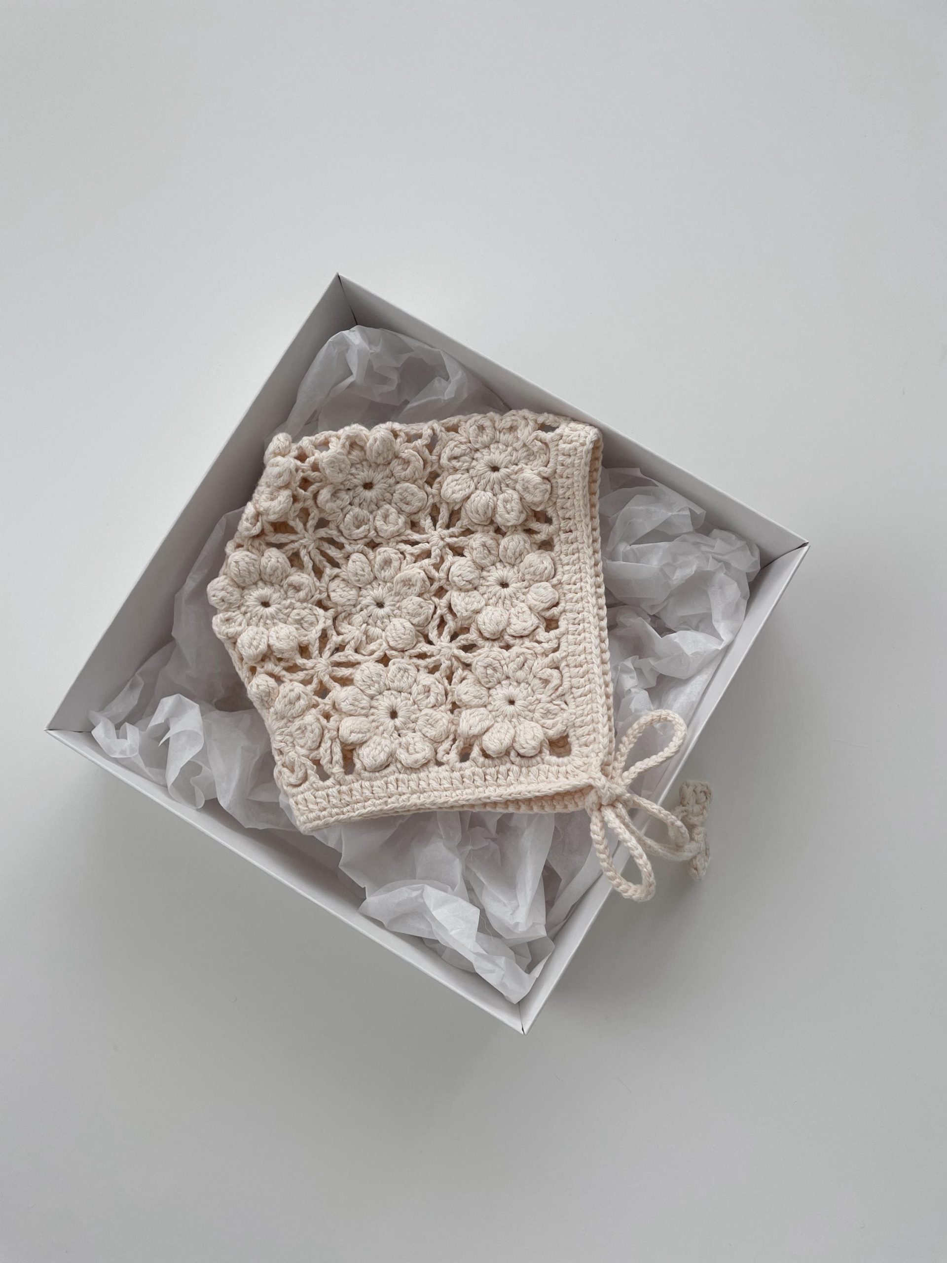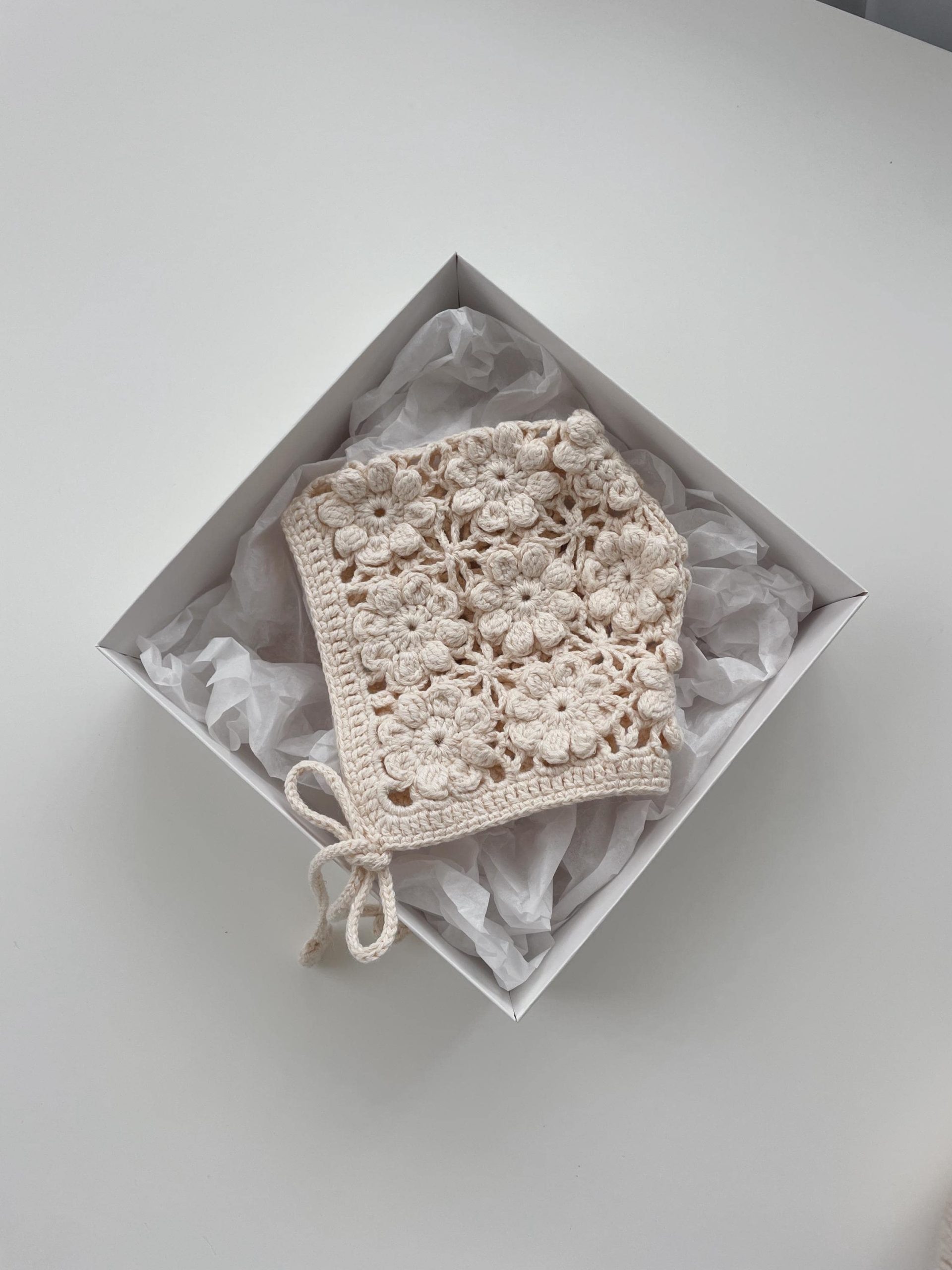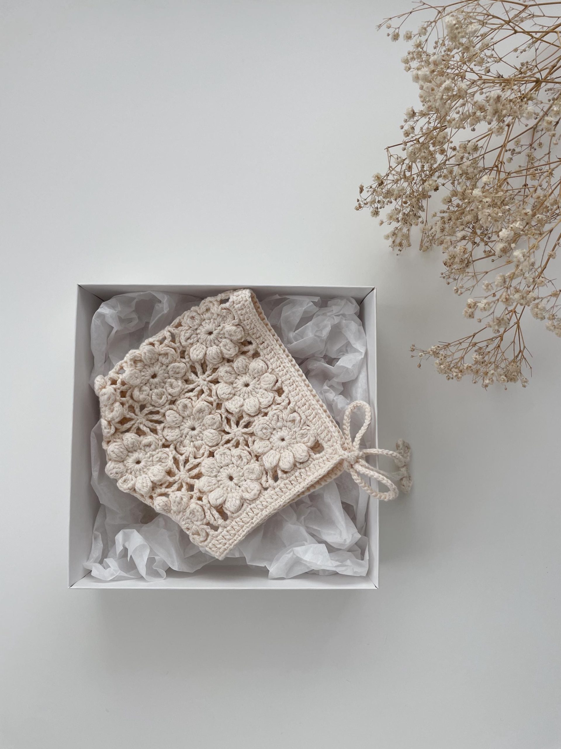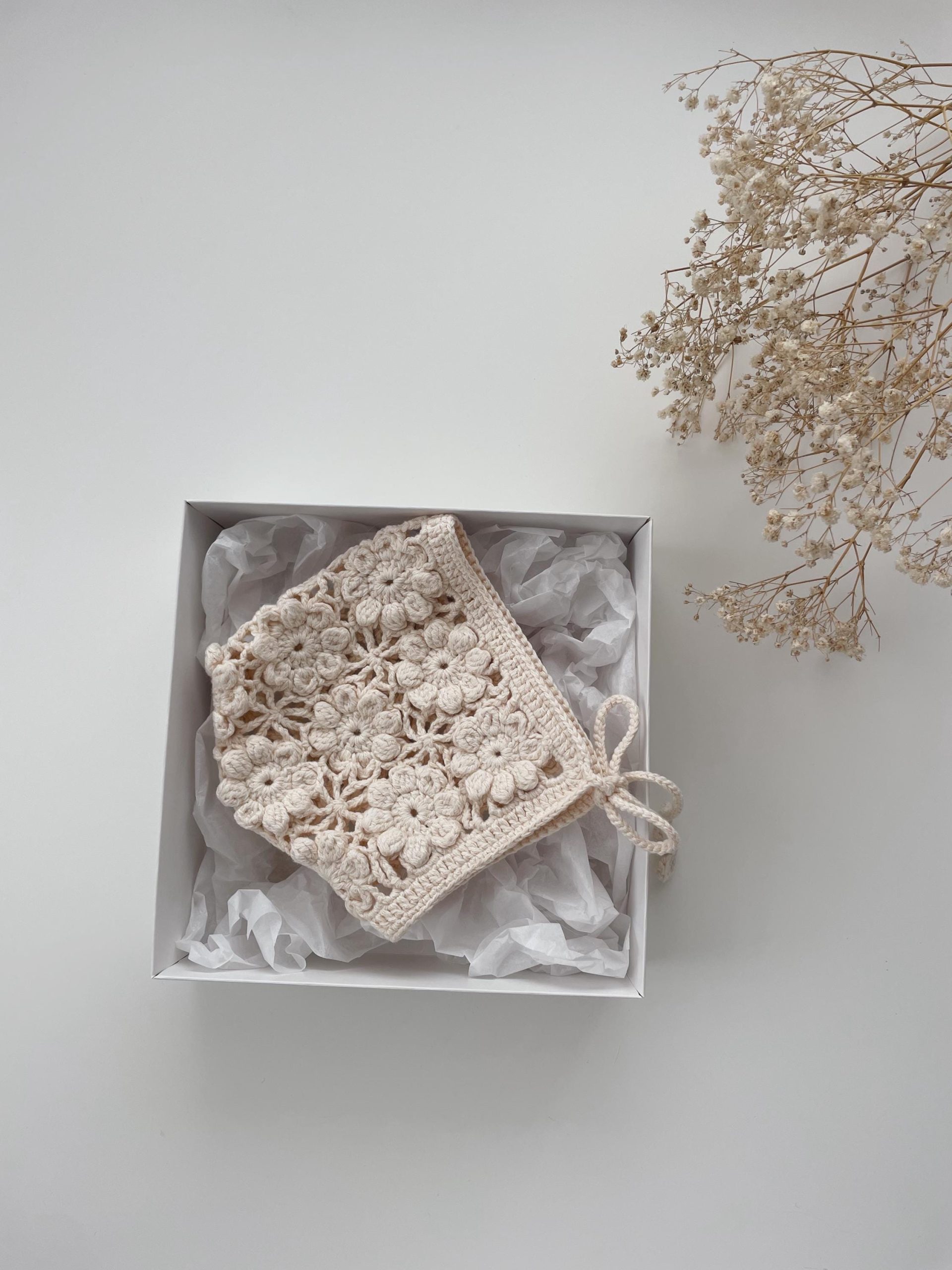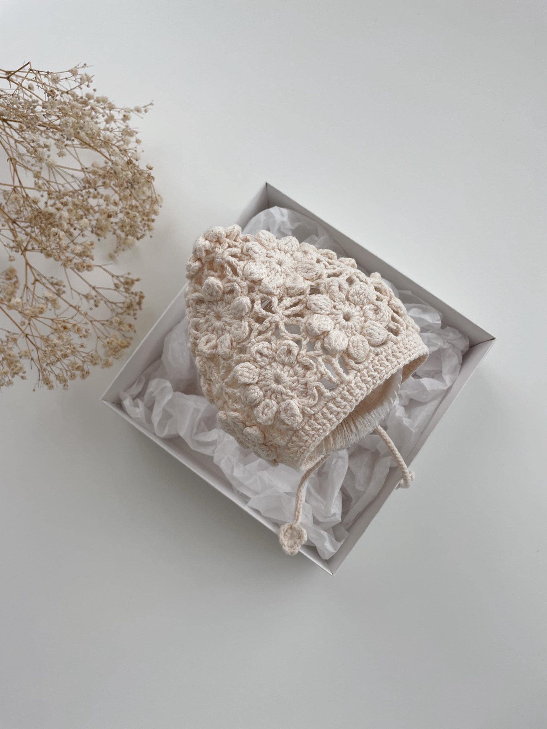 Hand Crochet Flower Baby Bonnet – Cream Cotton, 0-6 Months