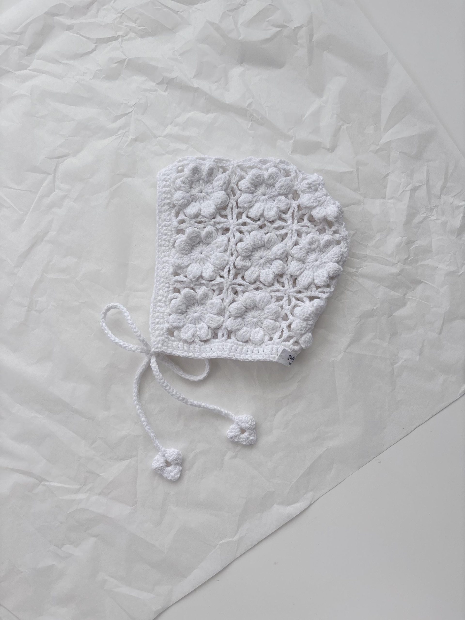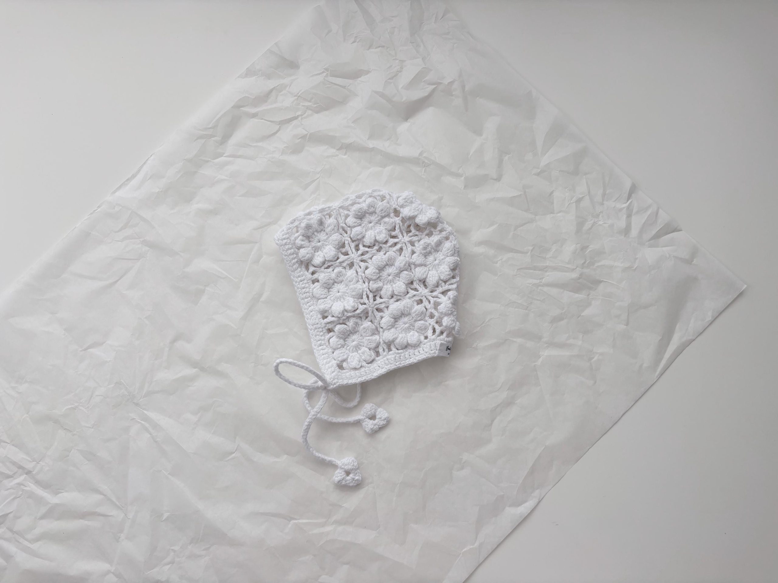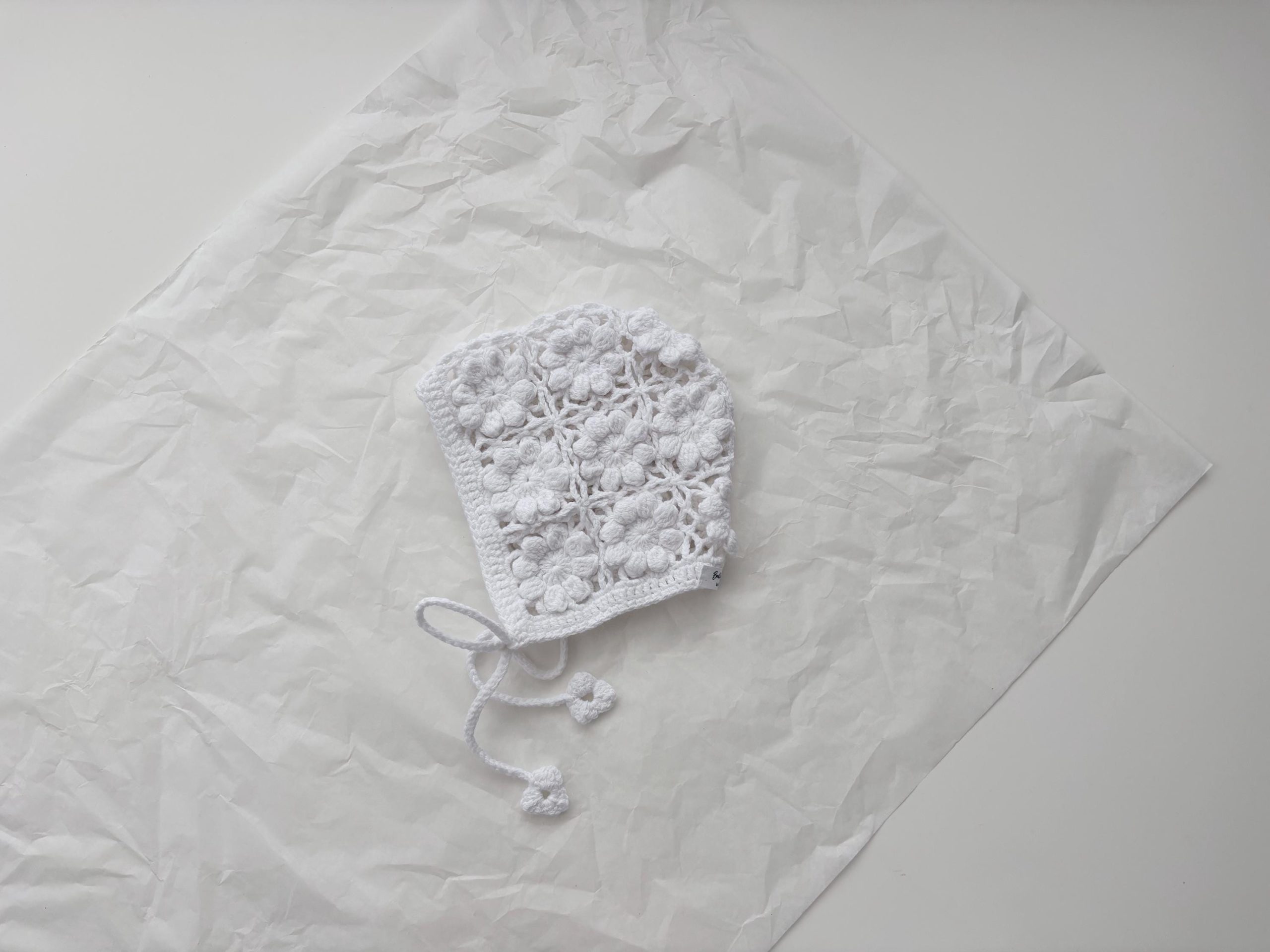 Hand Crochet Flower Baby Bonnet – White Cotton, 12-18 Months