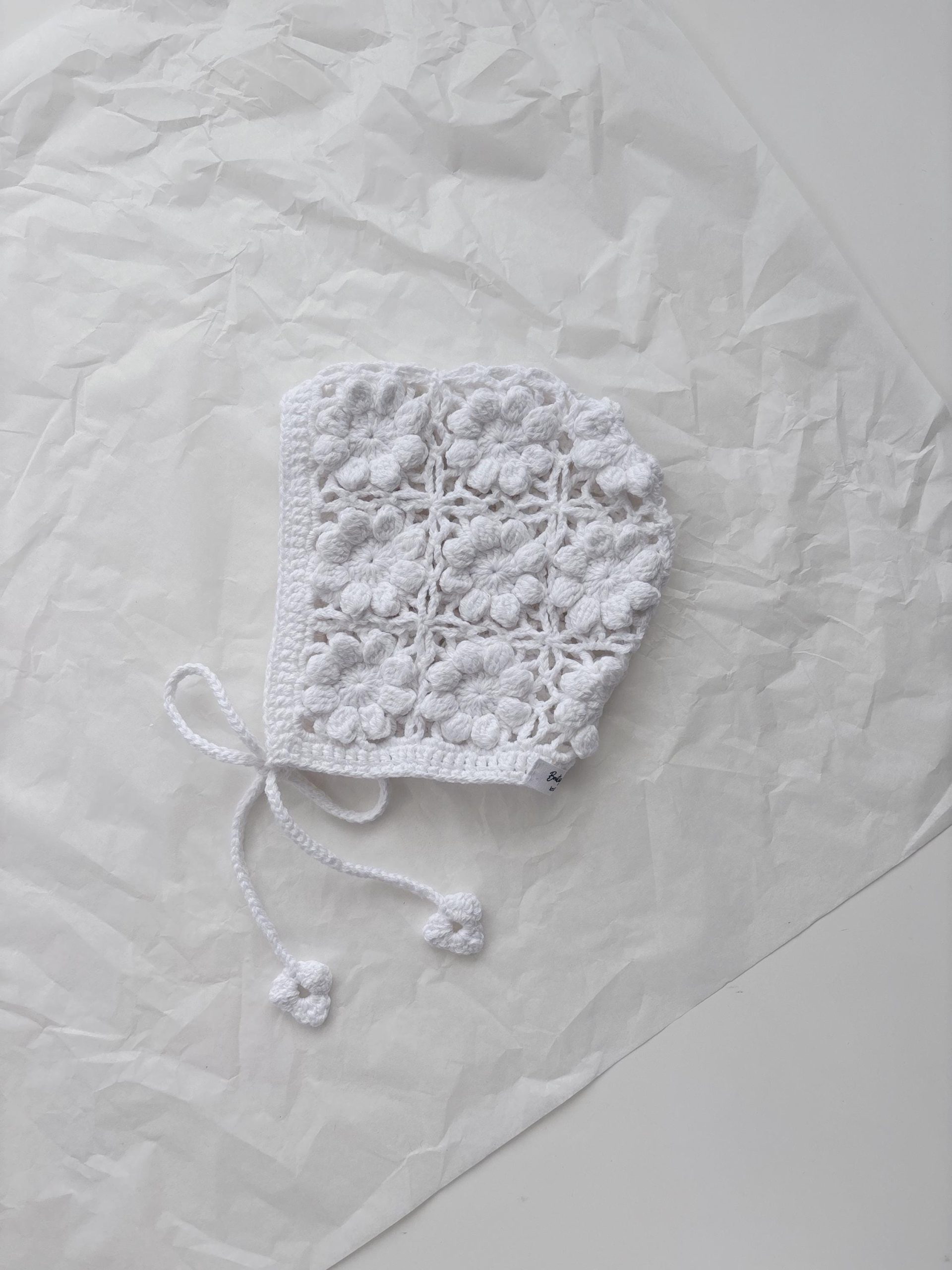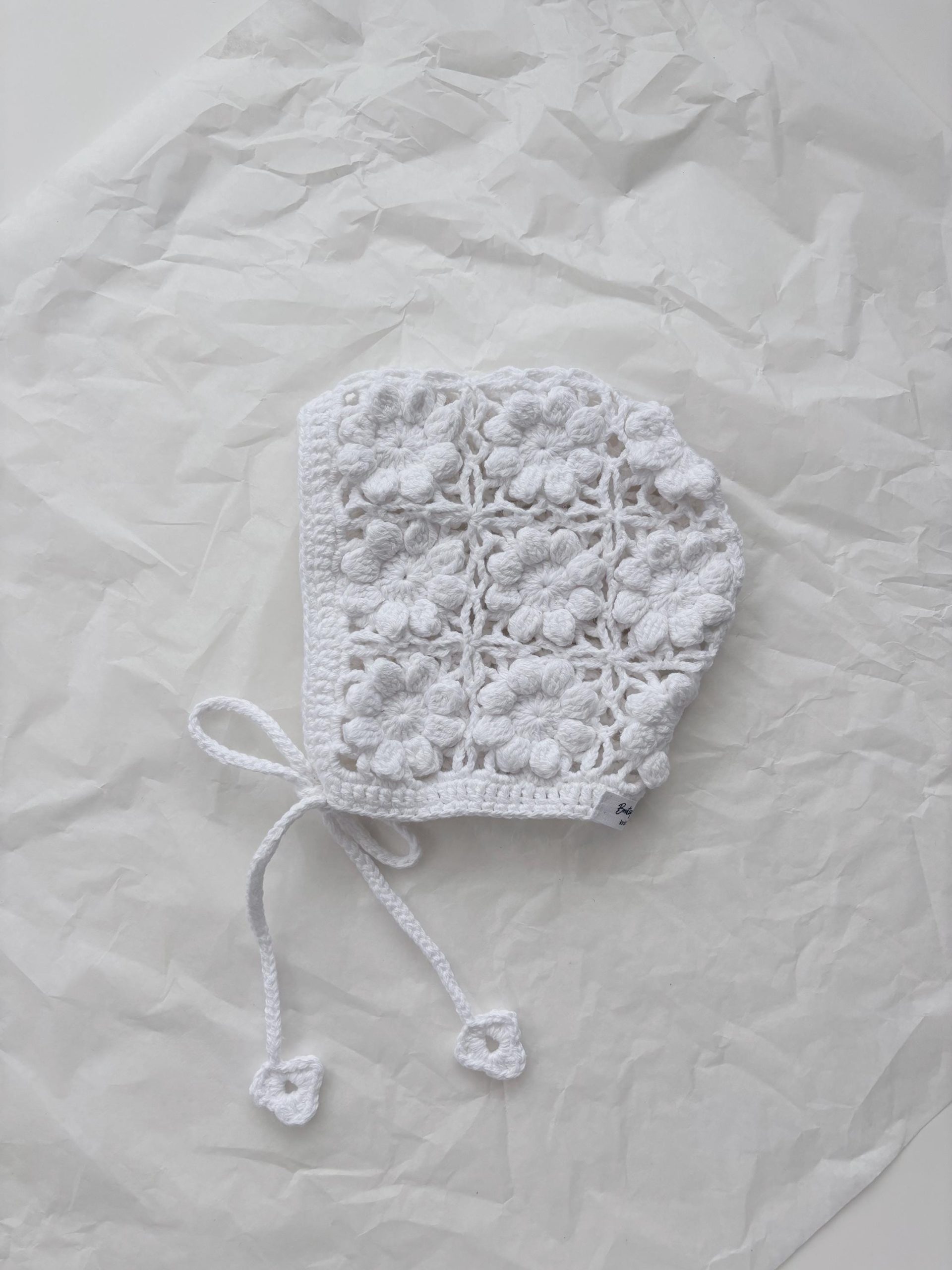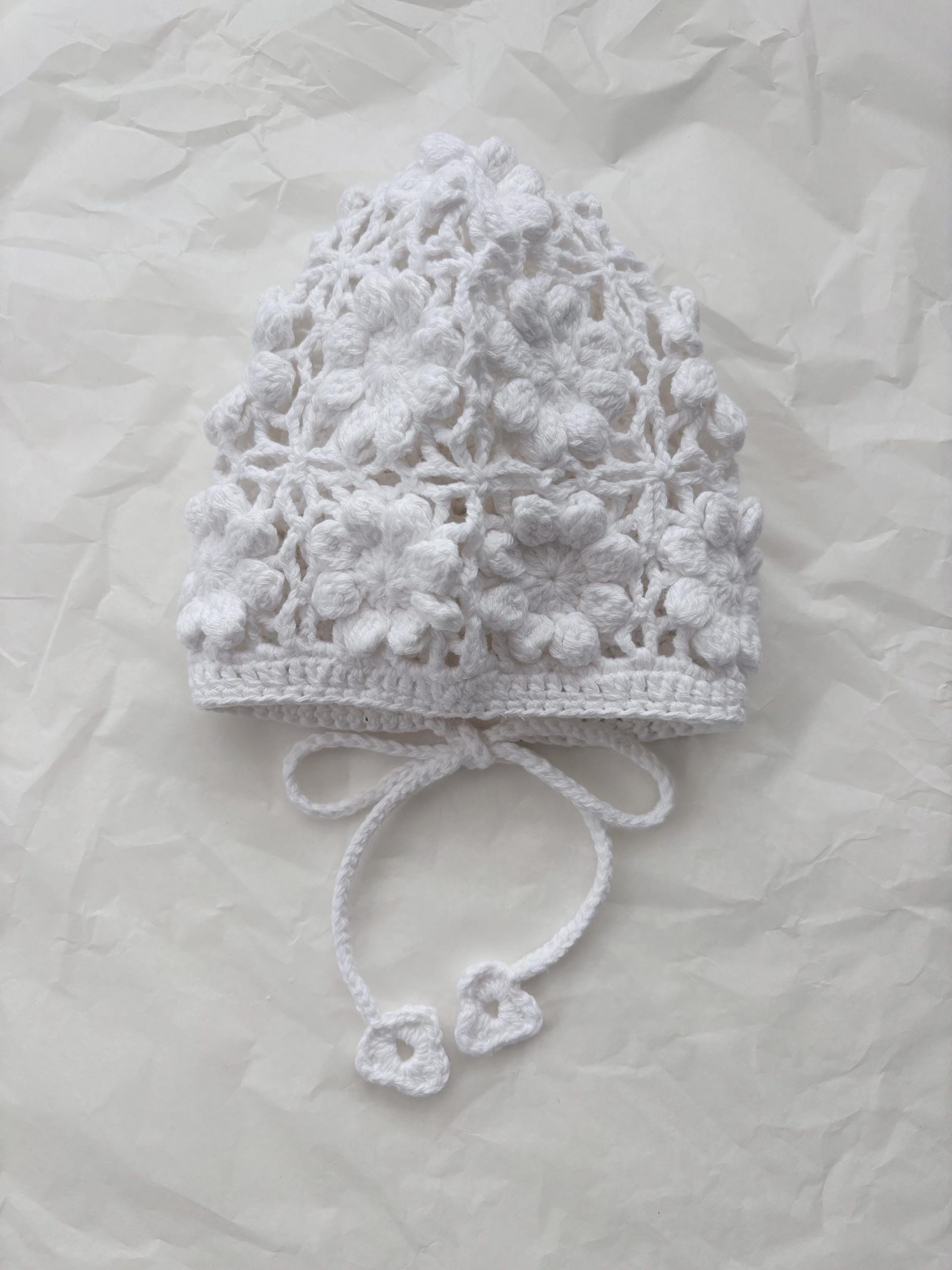 Hand Crochet Flower Baby Bonnet – White Cotton, 12-18 Months