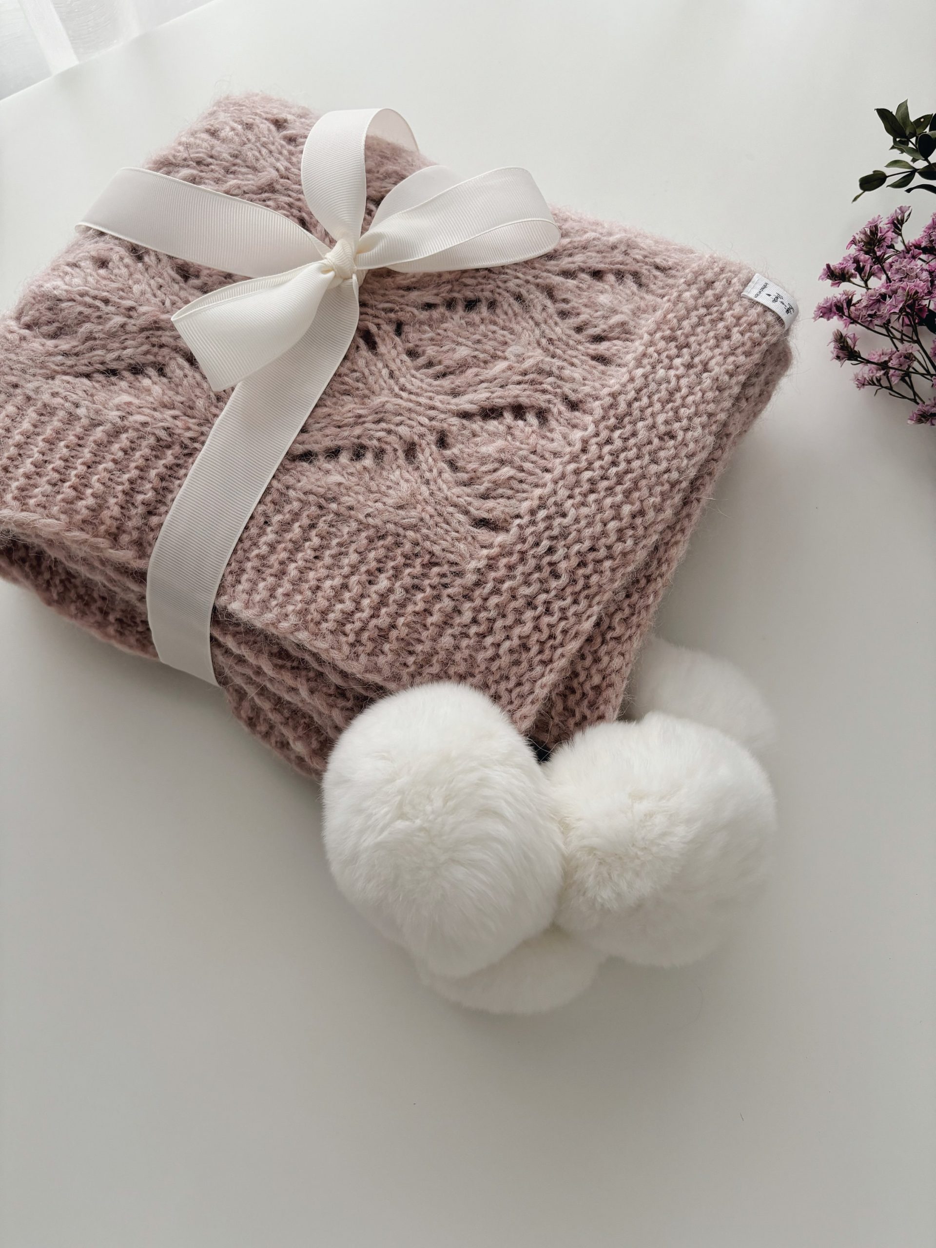Hand Knit Alpaca Baby Blanket – Pink Marble, Genuine Fur Pom Poms