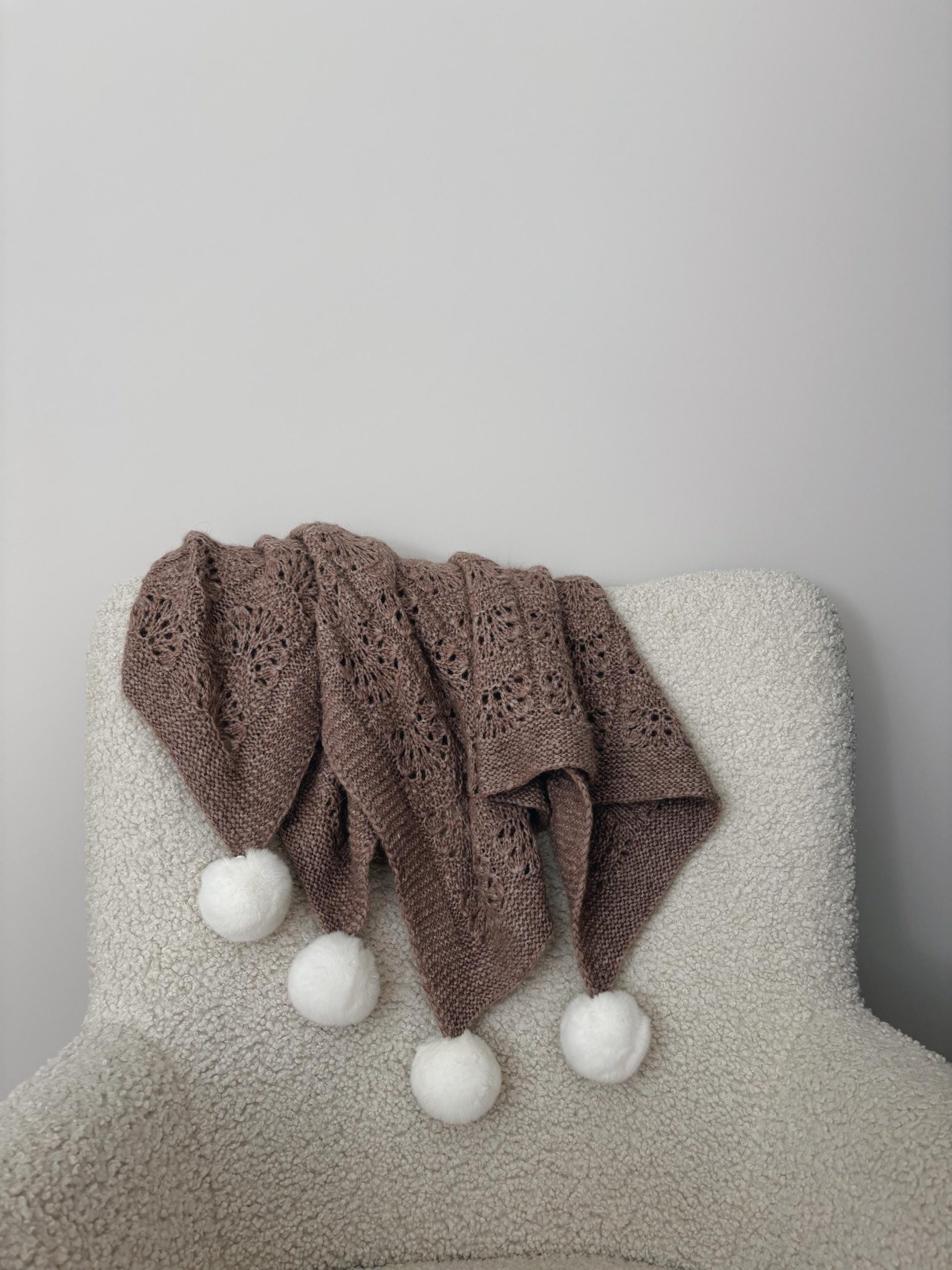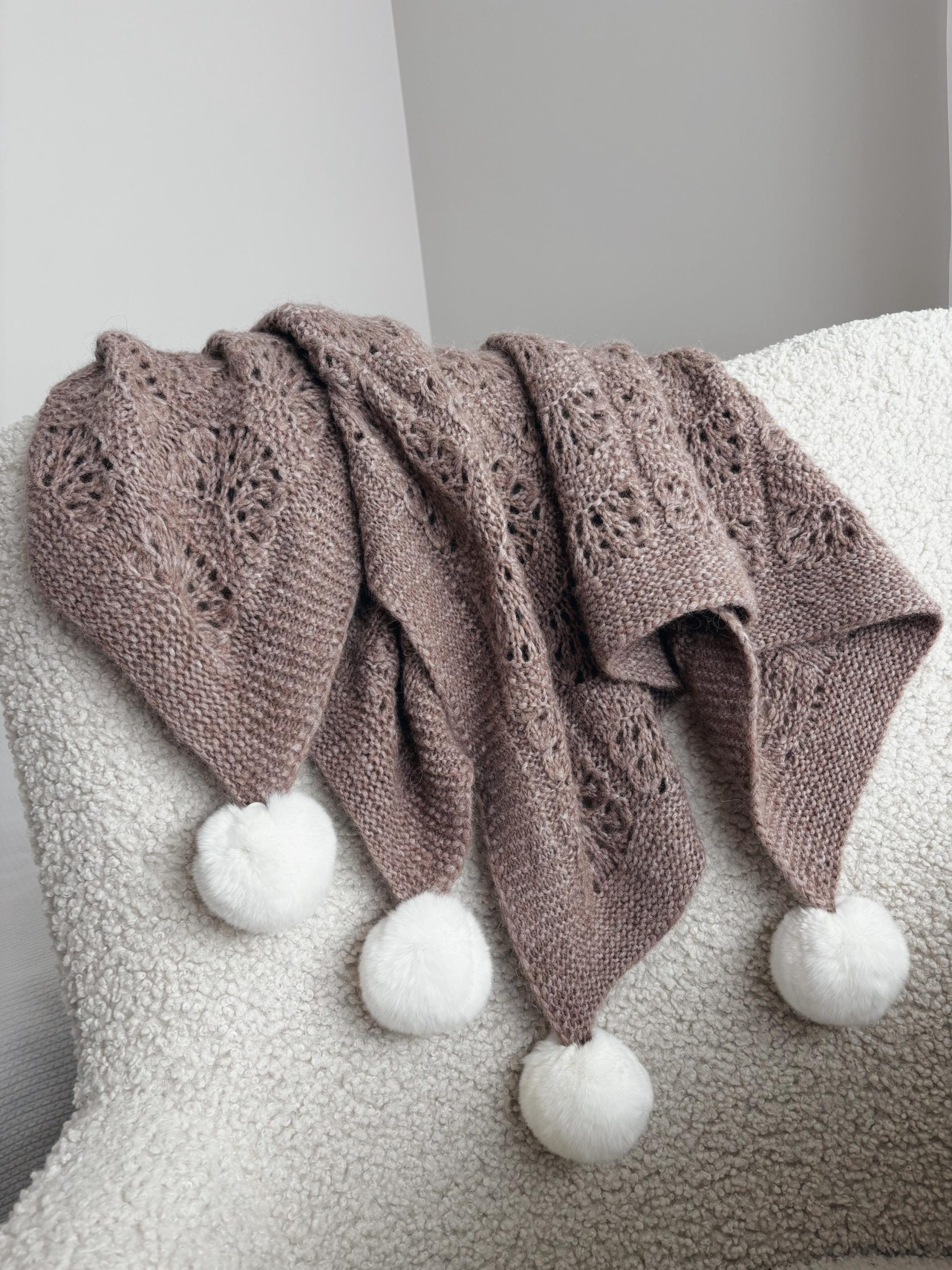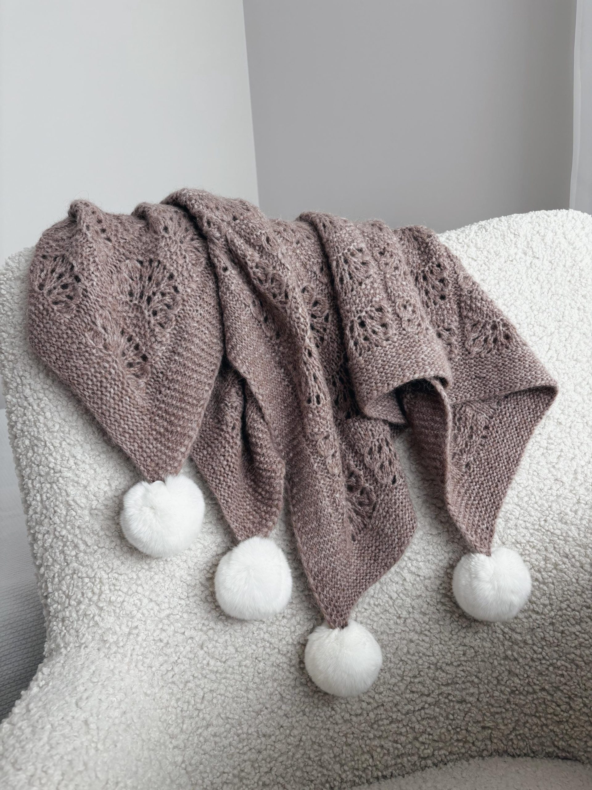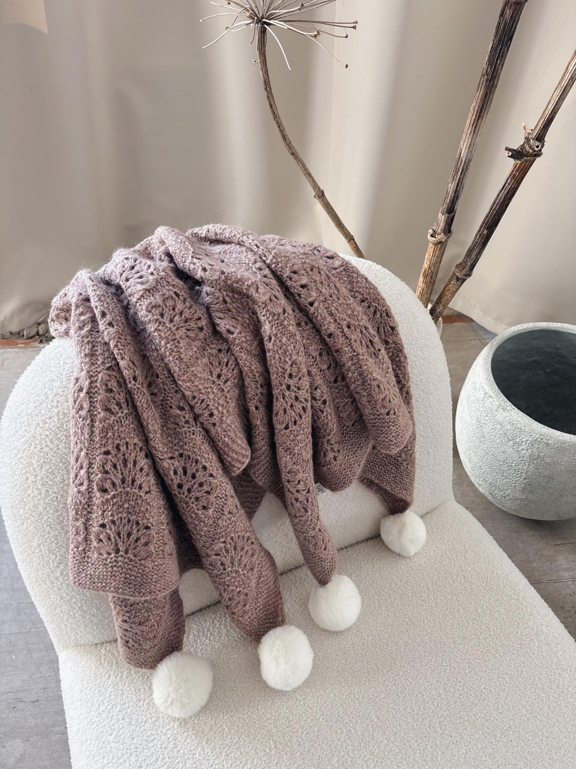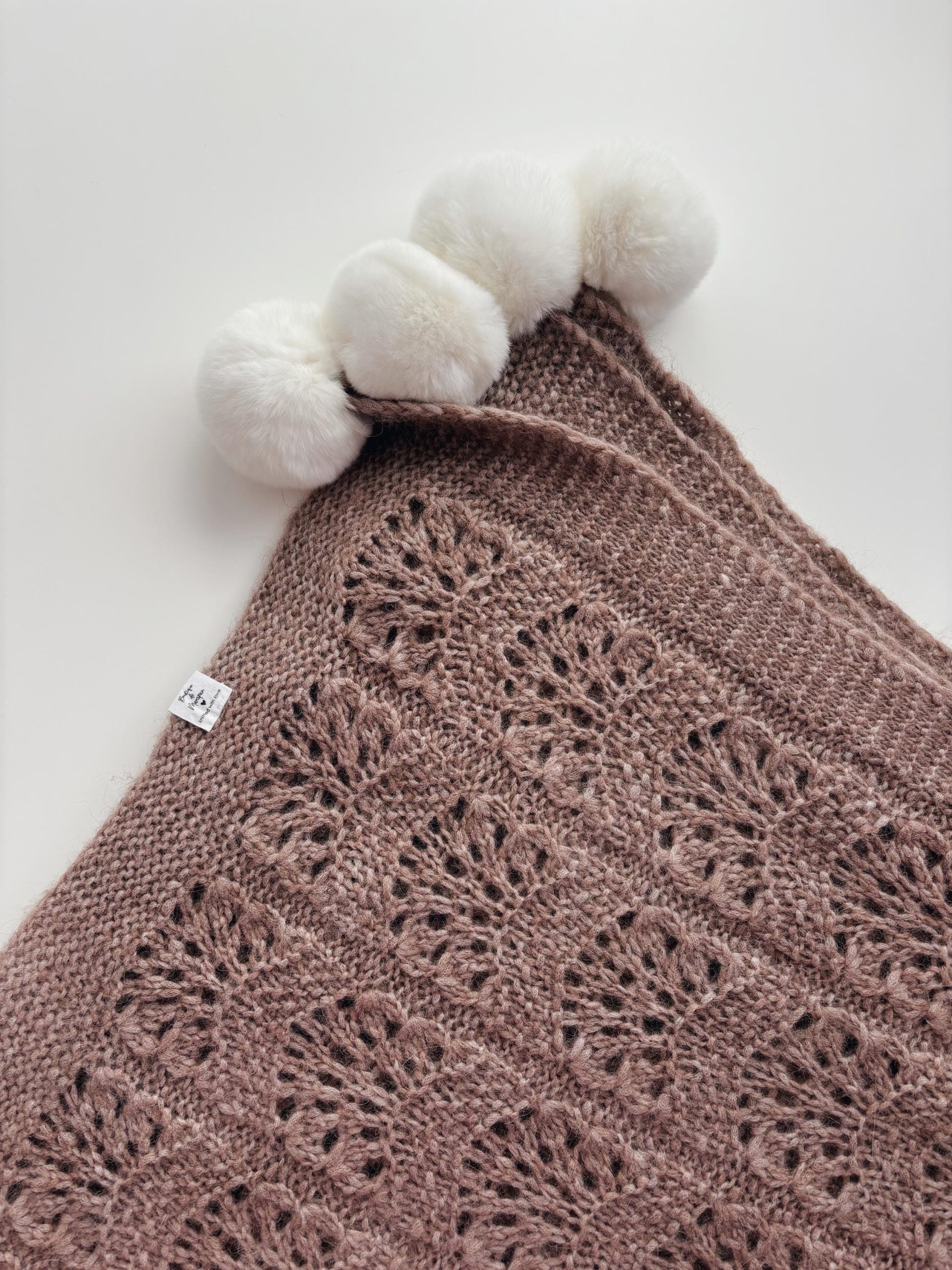 Hand Knitted Alpaca Baby Blanket – Taupe with Fur Pom Poms